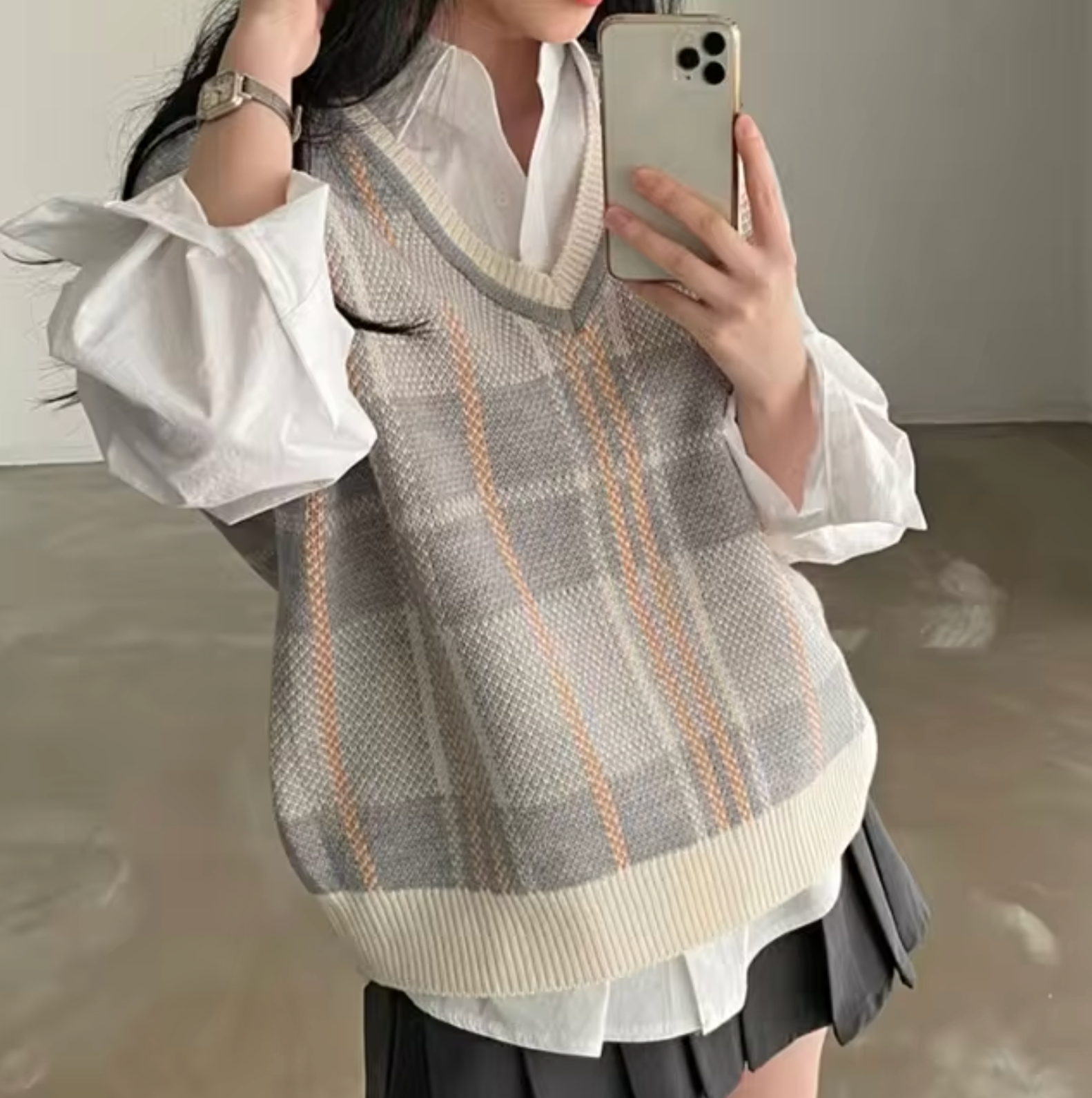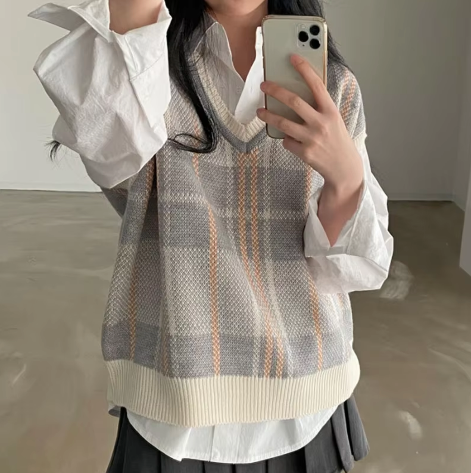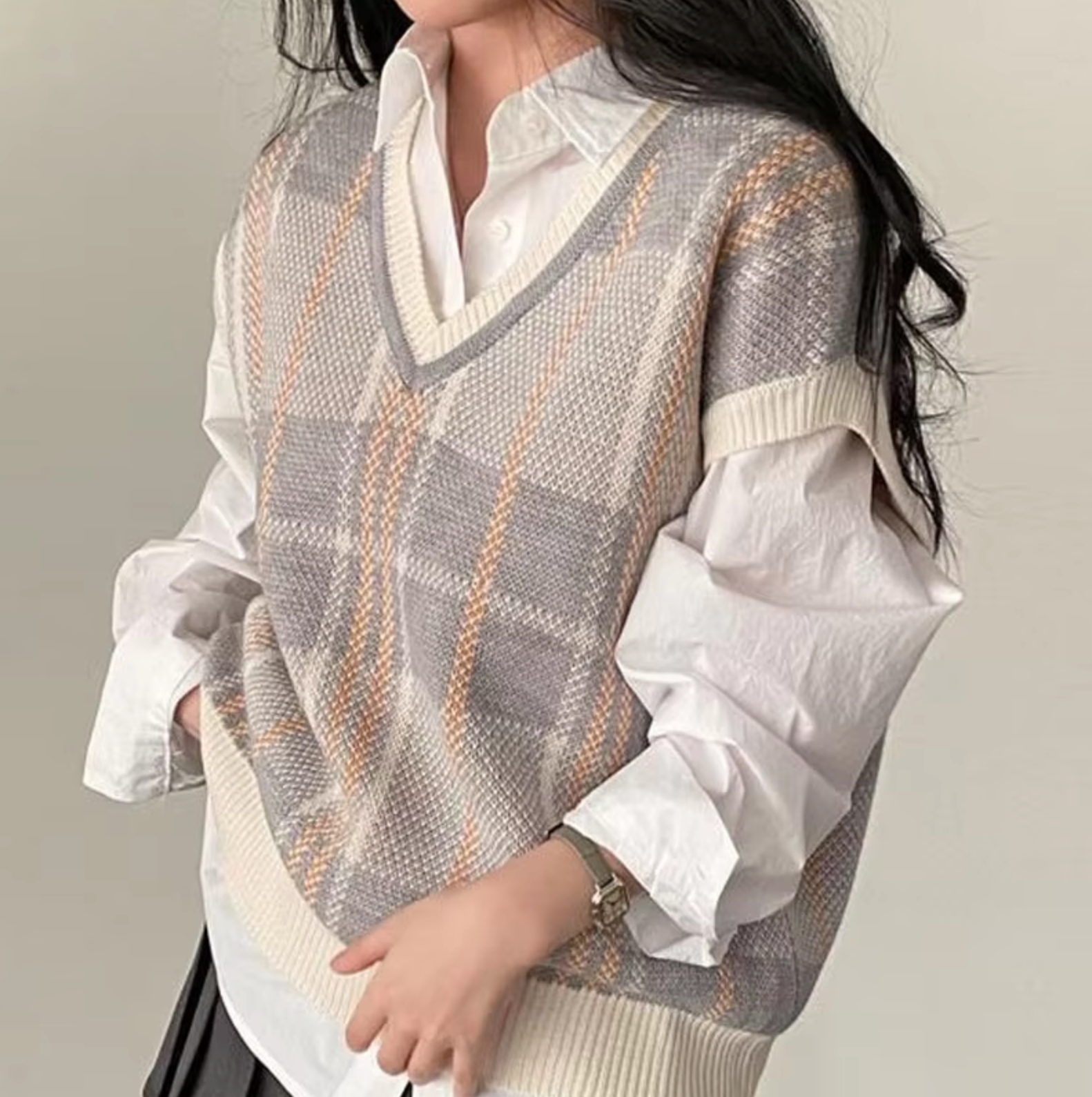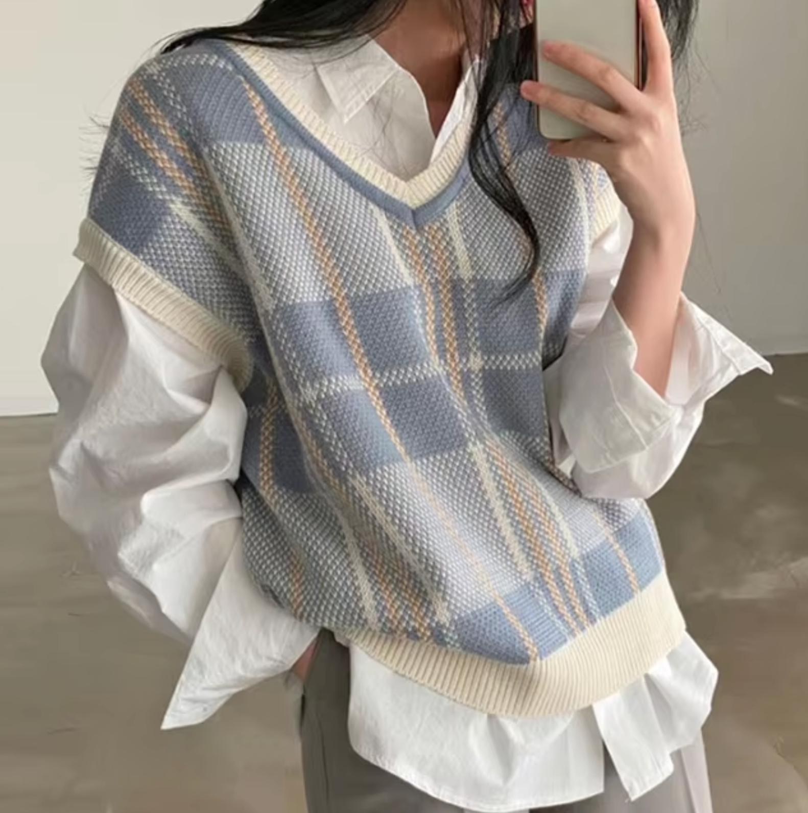 The Vintage V-Neck Sweater Vest is a timeless piece that's perfect for the fall and winter seasons. Made from a soft, breathable knit , this sweater vest features a classic check pattern that adds a retro touch to any outfit . The loose, relaxed fit makes it easy to layer over shirts or turtlenecks, giving you a chic yet comfortable look.