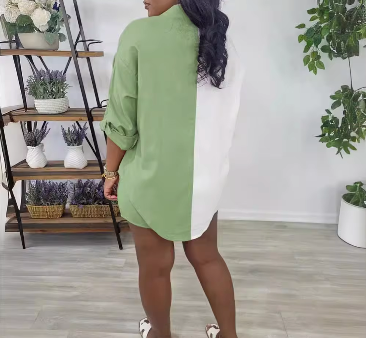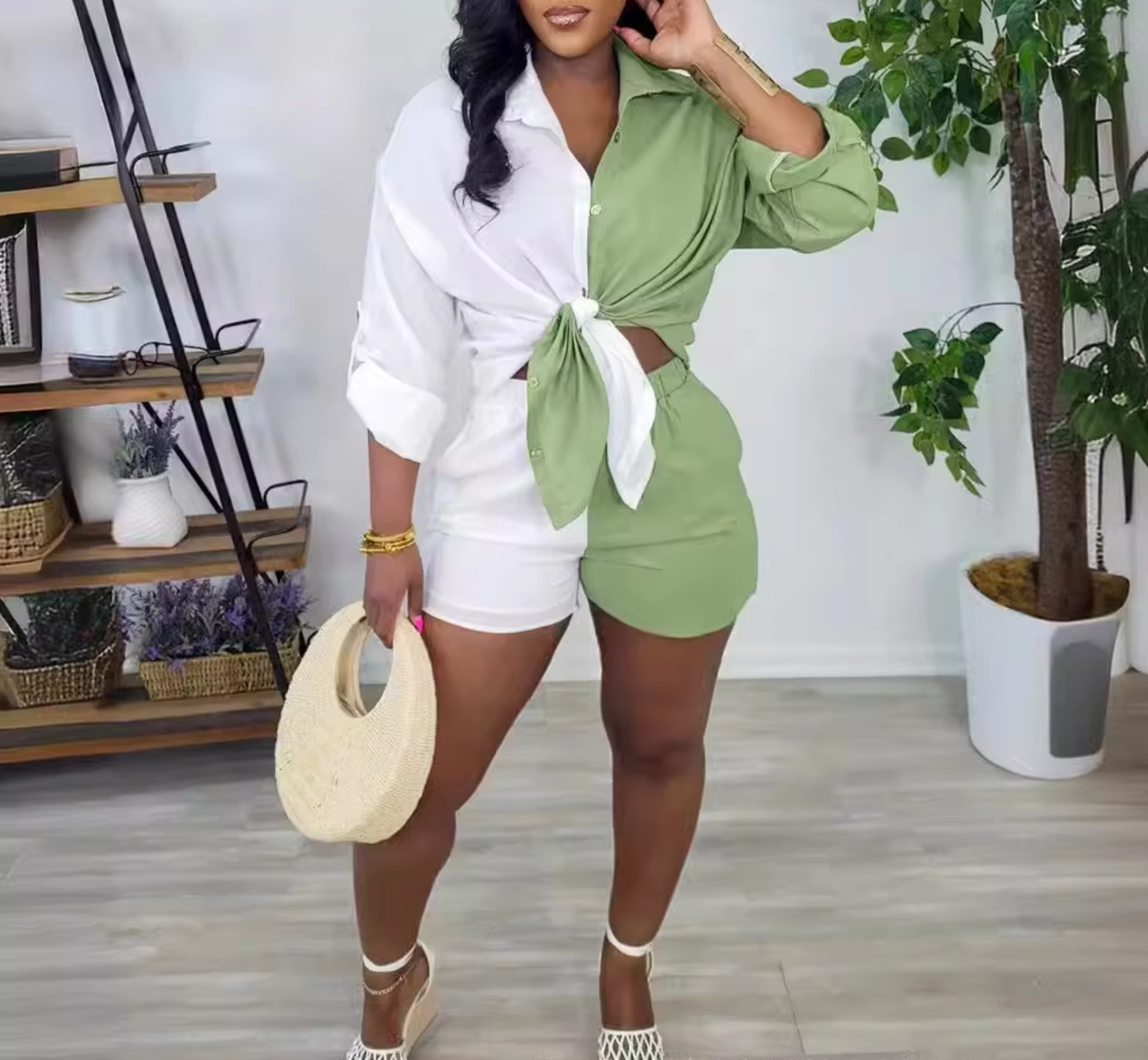 Spruce up your style with the chic Color Block Asymmetric Hem Top & Shorts Set. This two-piece set features a trendy color block design that will add a modern twist to your casual wardrobe. The top features button detailing and an eye-catching asymmetric hem, creating a unique silhouette that flatters all body types. Paired with the matching high-waisted shorts, this outfit is perfect for making a bold statement whether you're heading to brunch, shopping with friends or enjoying a casual day out.