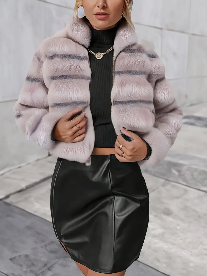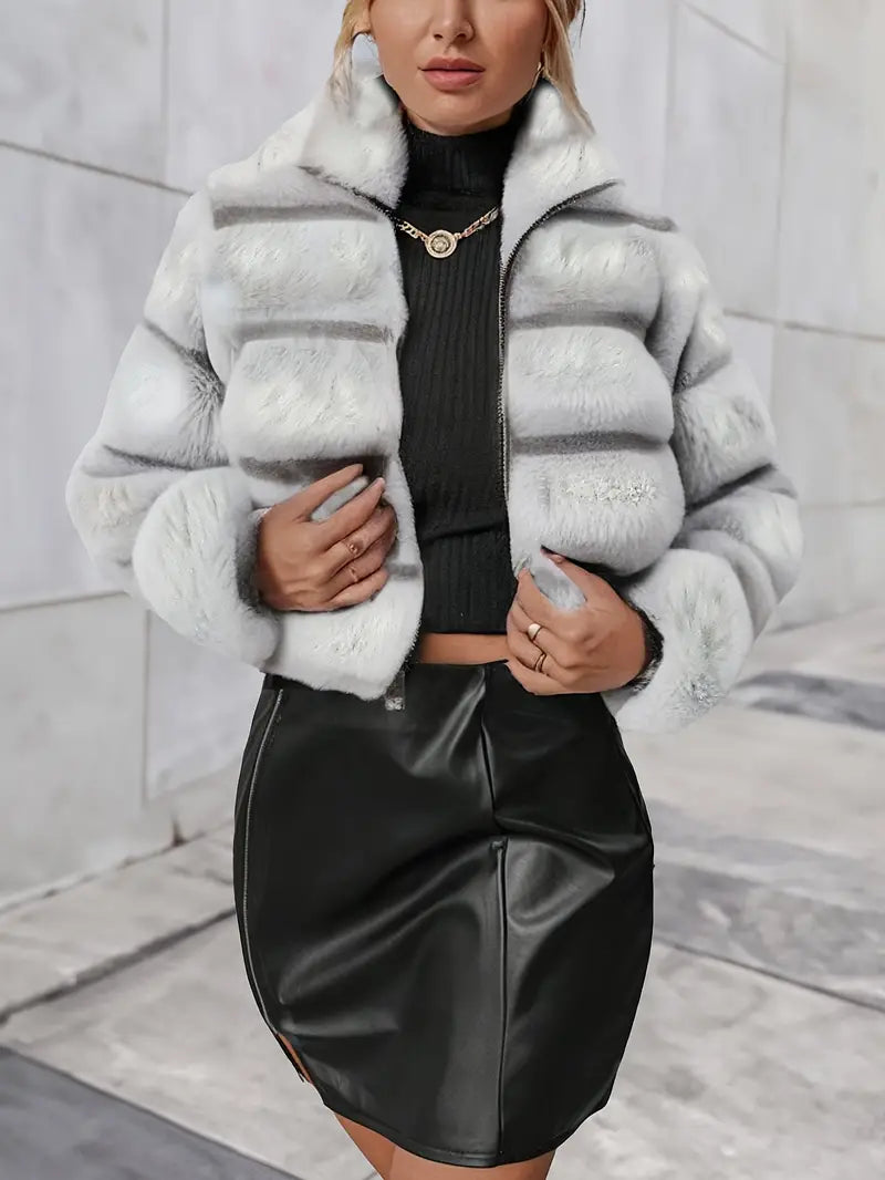Offering elegance and warmth, this luxurious zip up faux fur jacket is perfect for fall and winter with its chic long sleeves . Made from soft, high quality materials , it offers a cozy feel while maintaining a stylish look.