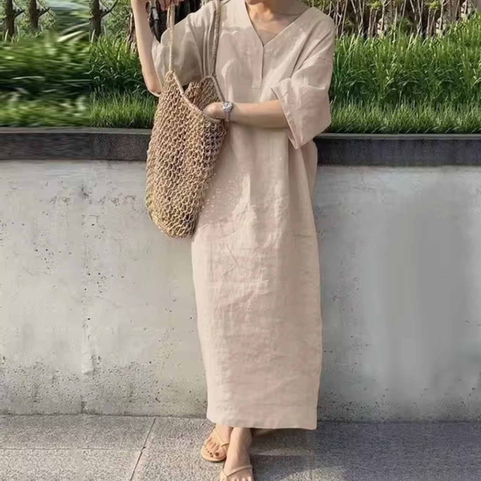 This loose V-neck maxi dress is perfect for summer vacations and beach trips. Made from a comfortable cotton-linen blend, the dress is breathable and lightweight, ideal for warm weather. The V-neck and short sleeves create a flattering silhouette. The loose, relaxed fit ensures maximum comfort and freedom of movement, making it an ideal choice for a day in the sun.
