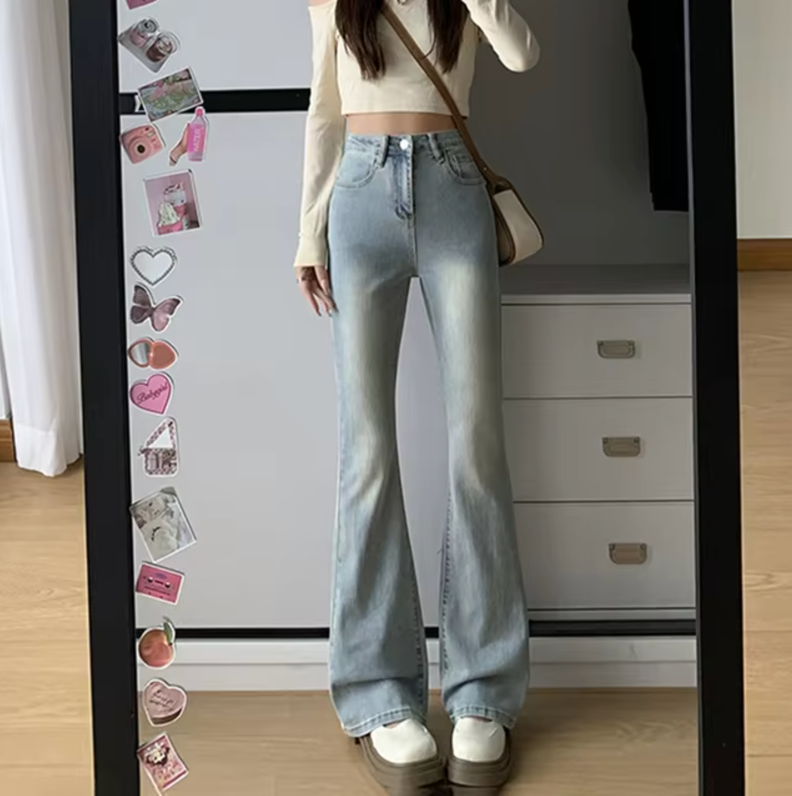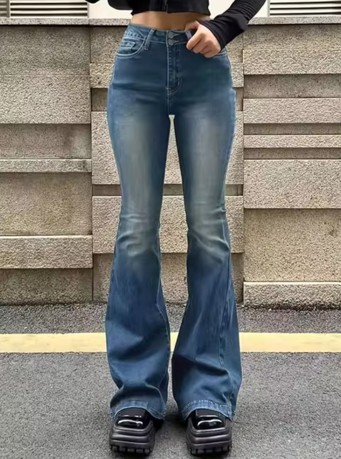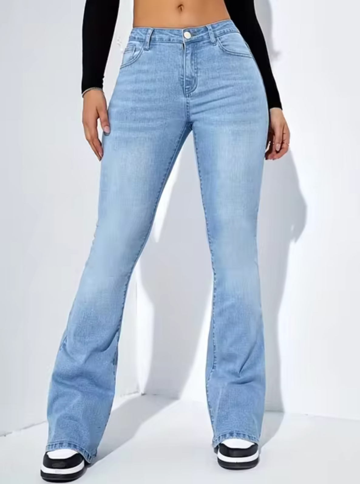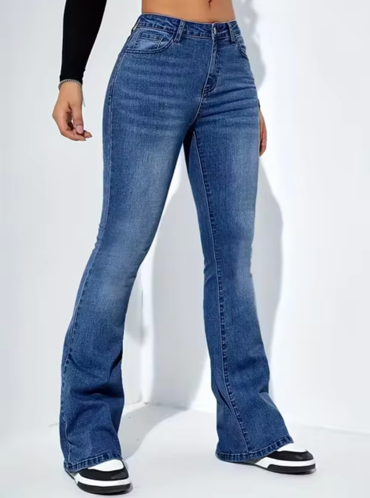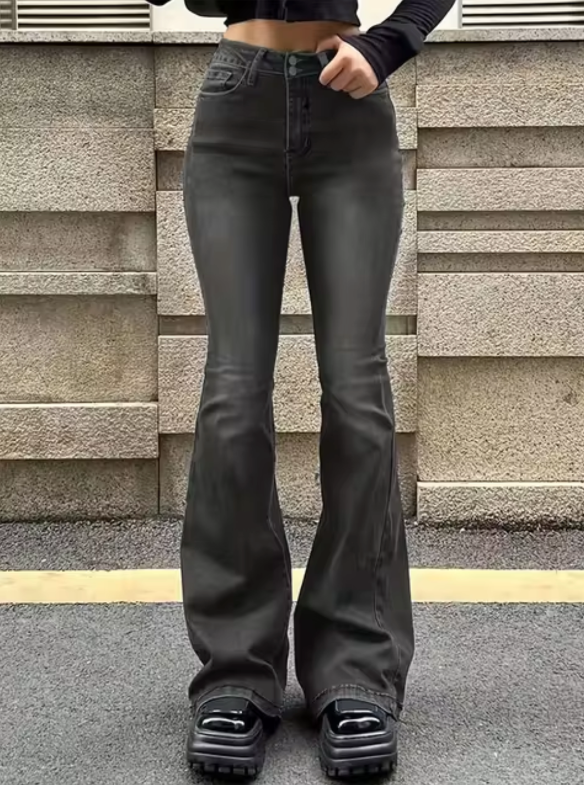 These flare stretch jeans for women are made from premium denim with added stretch for a comfortable, figure-hugging fit. They feature a classic high waist and flared bell bottom for an on-trend punk look.