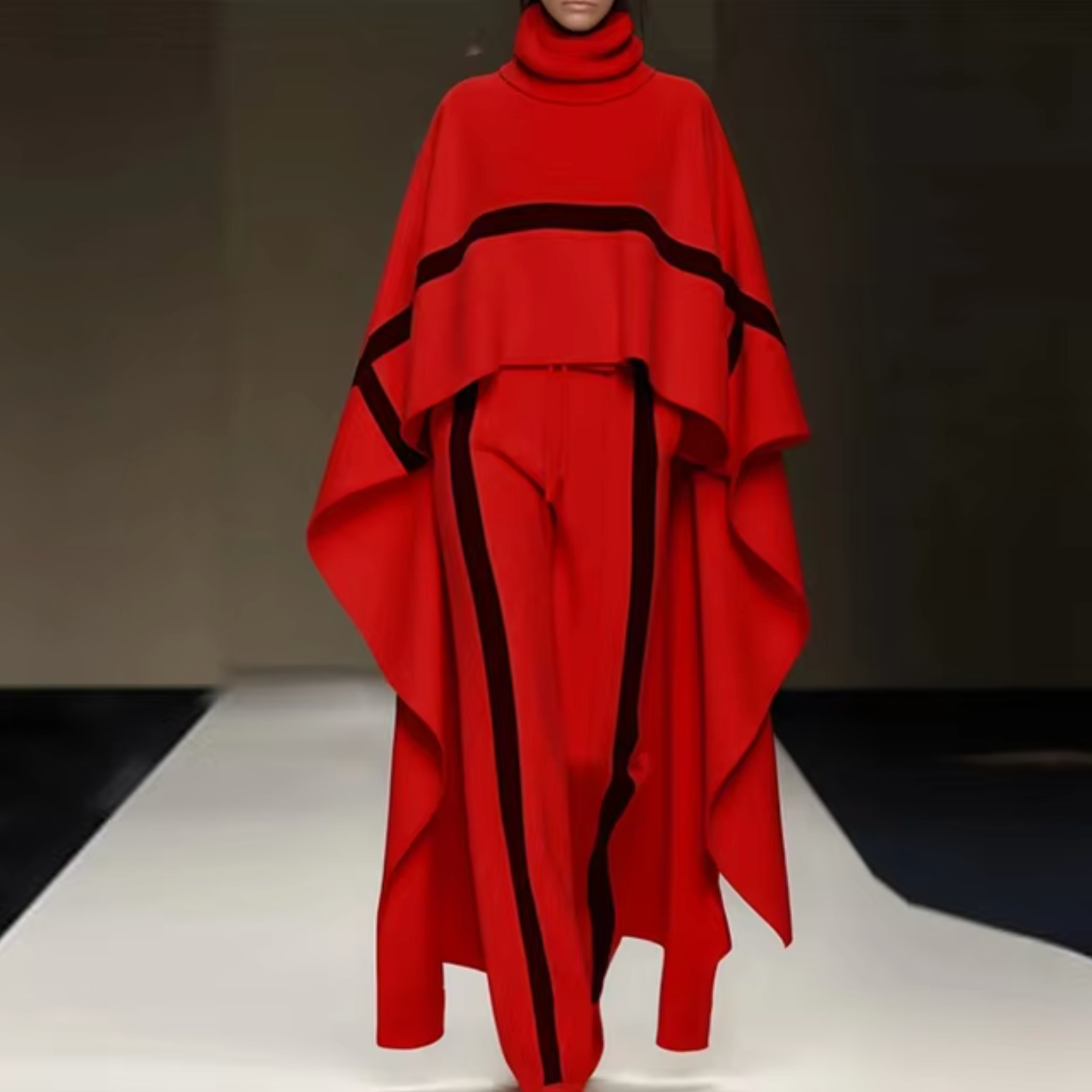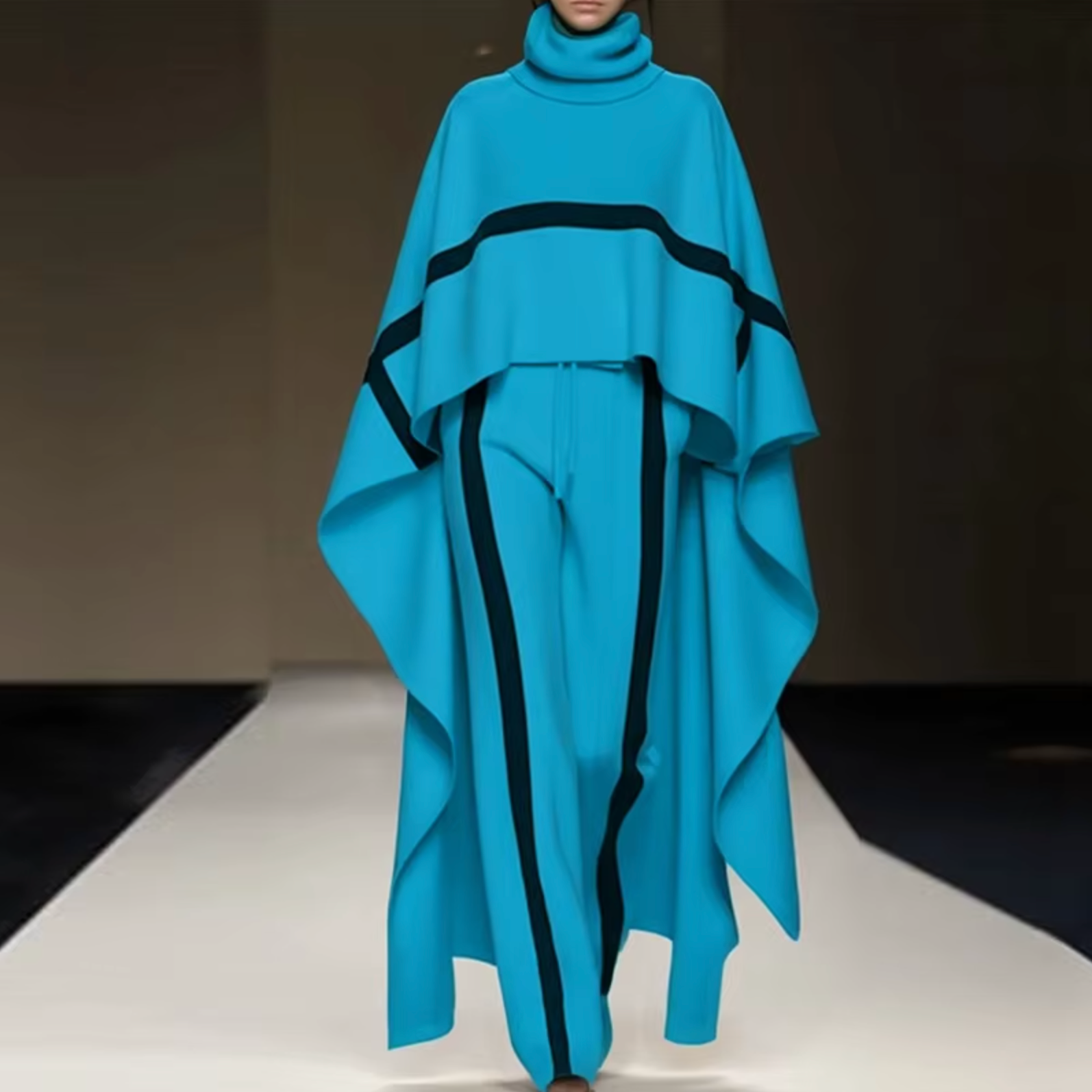Upgrade your winter style with this fashionable two-piece set, made from a premium blend of wool and high-quality fabric for warmth and durability. The set features an oversized turtleneck top with an irregular hem and loose-fitting trousers for an effortlessly chic high-street look with a striking color-block pattern .