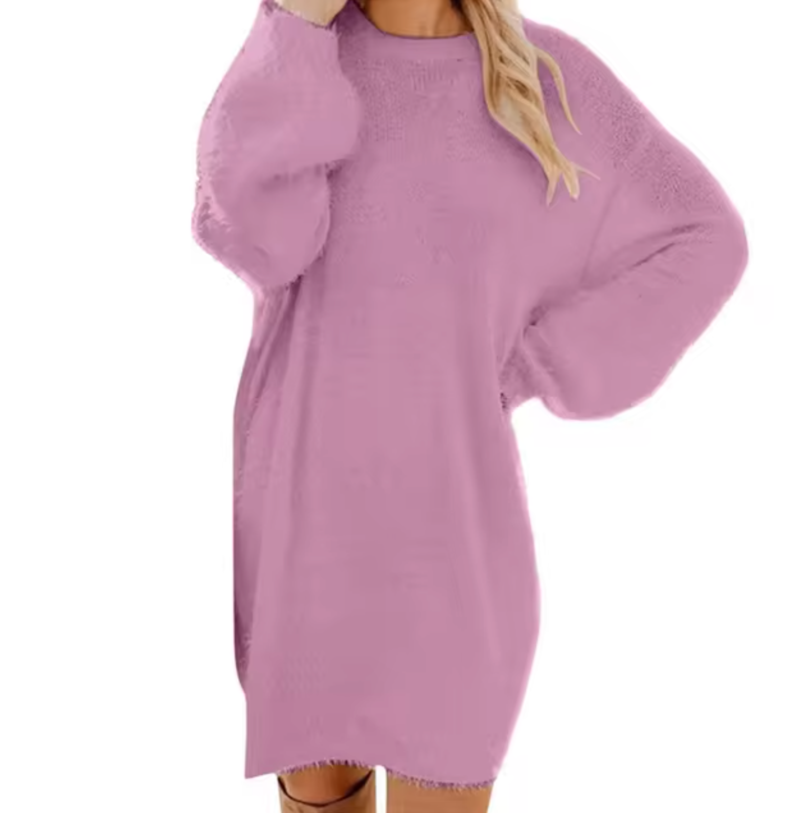 This winter sweater dress for women is made from soft, knitted fabric to provide warmth and comfort for colder days. With its classic crew neck and long sleeves, it offers a relaxed, casual fit that 's perfect for cozy, everyday wear.