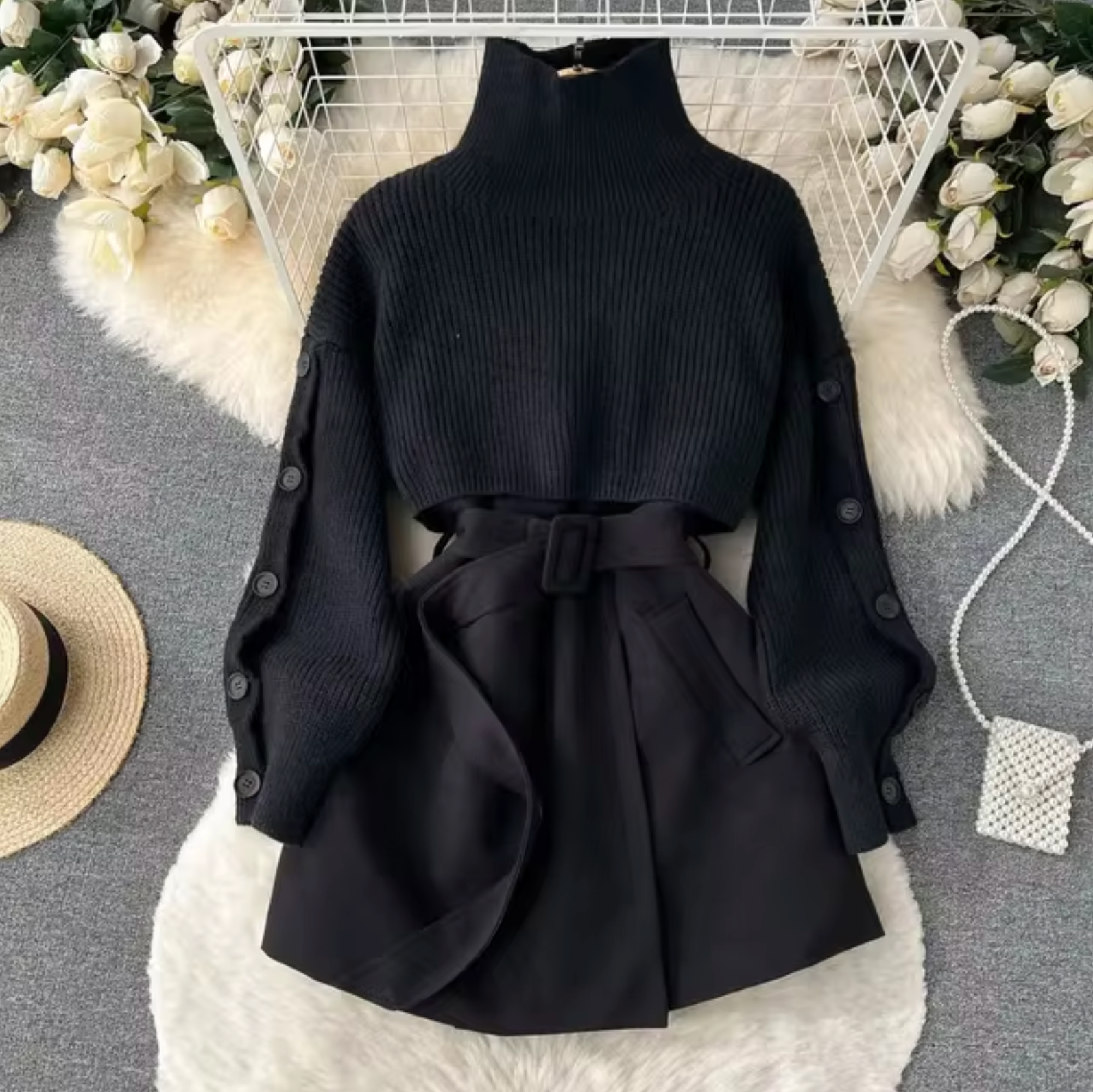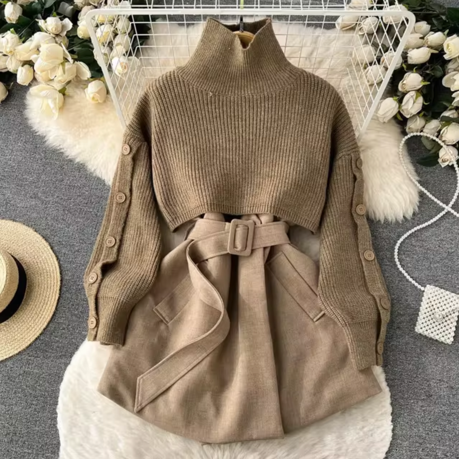 This stylish two-piece set features a cozy ribbed-knit sweater and a sleeveless mini dress - perfect for a layered fall look. Made from a soft, mid-weight knit, the sweater has a loose fit with button- down sleeves and a high neckline for a comfortable feel.