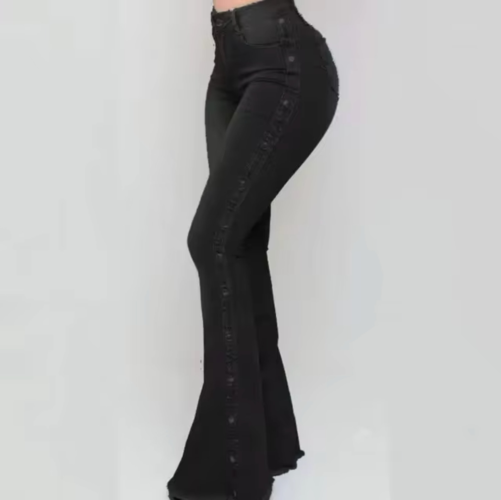 Crafted from premium stretch denim, these high-waisted flared trousers offer a comfortable yet figure-hugging silhouette that accentuates your curves. The vintage look is enhanced by decorative buttons and a floor-length cut that elongates the legs.
