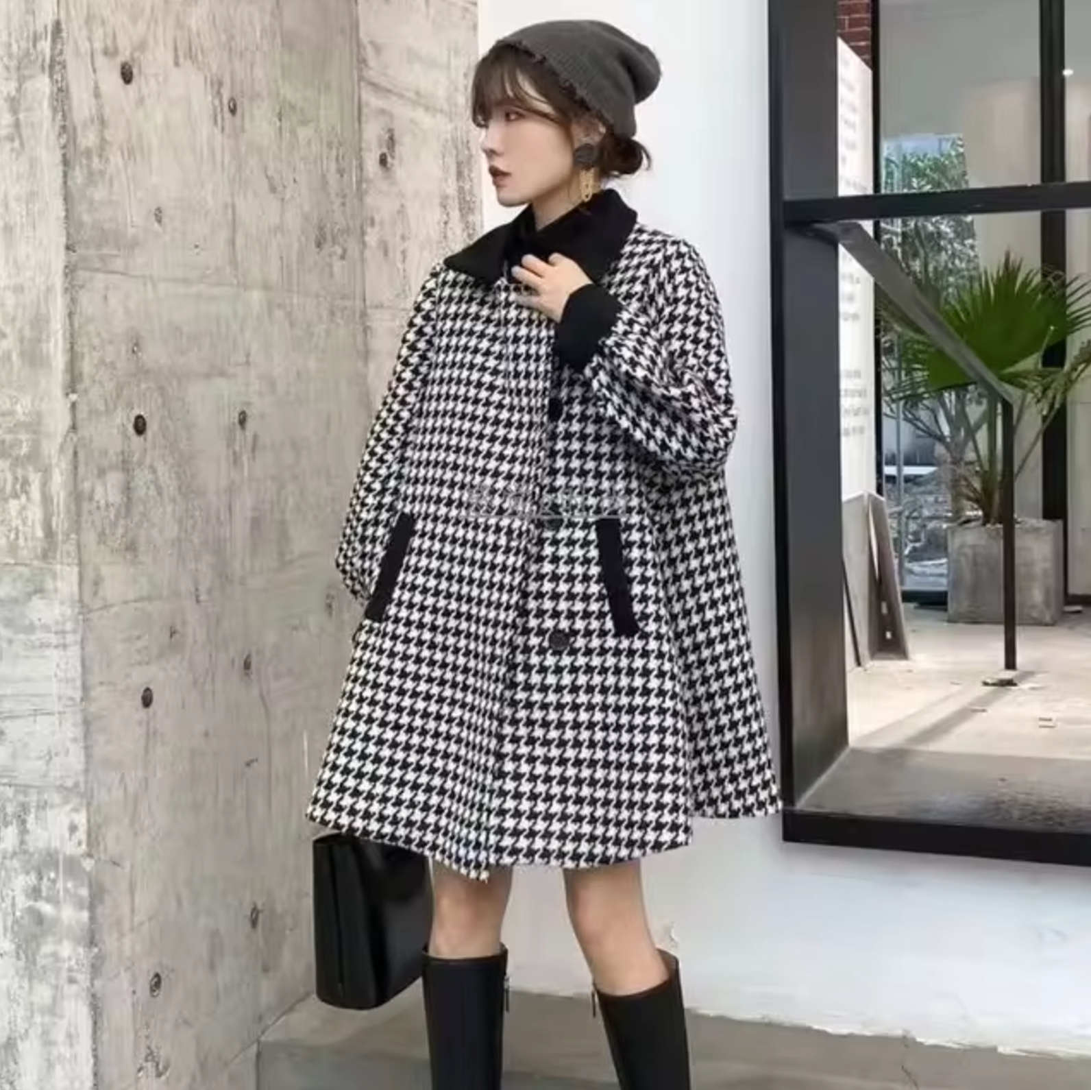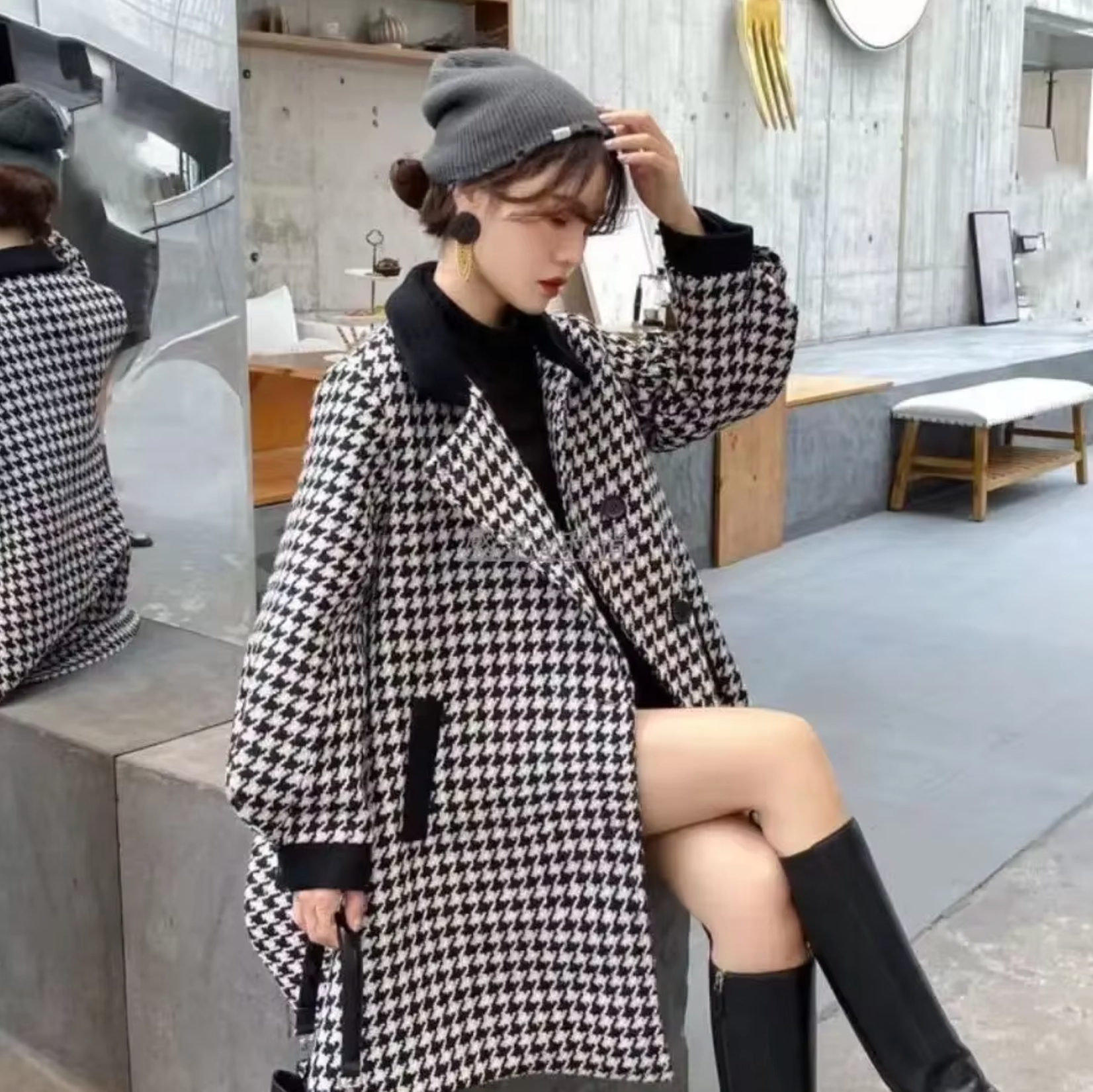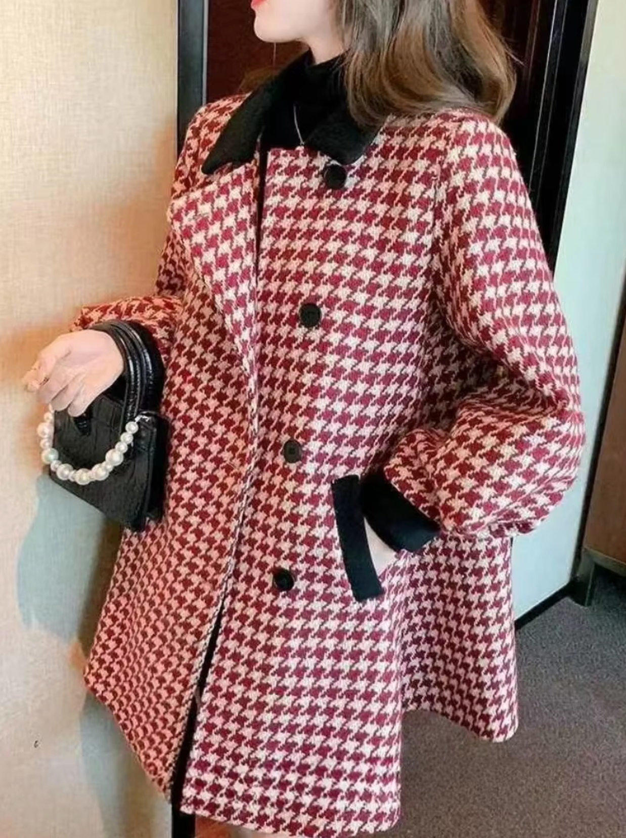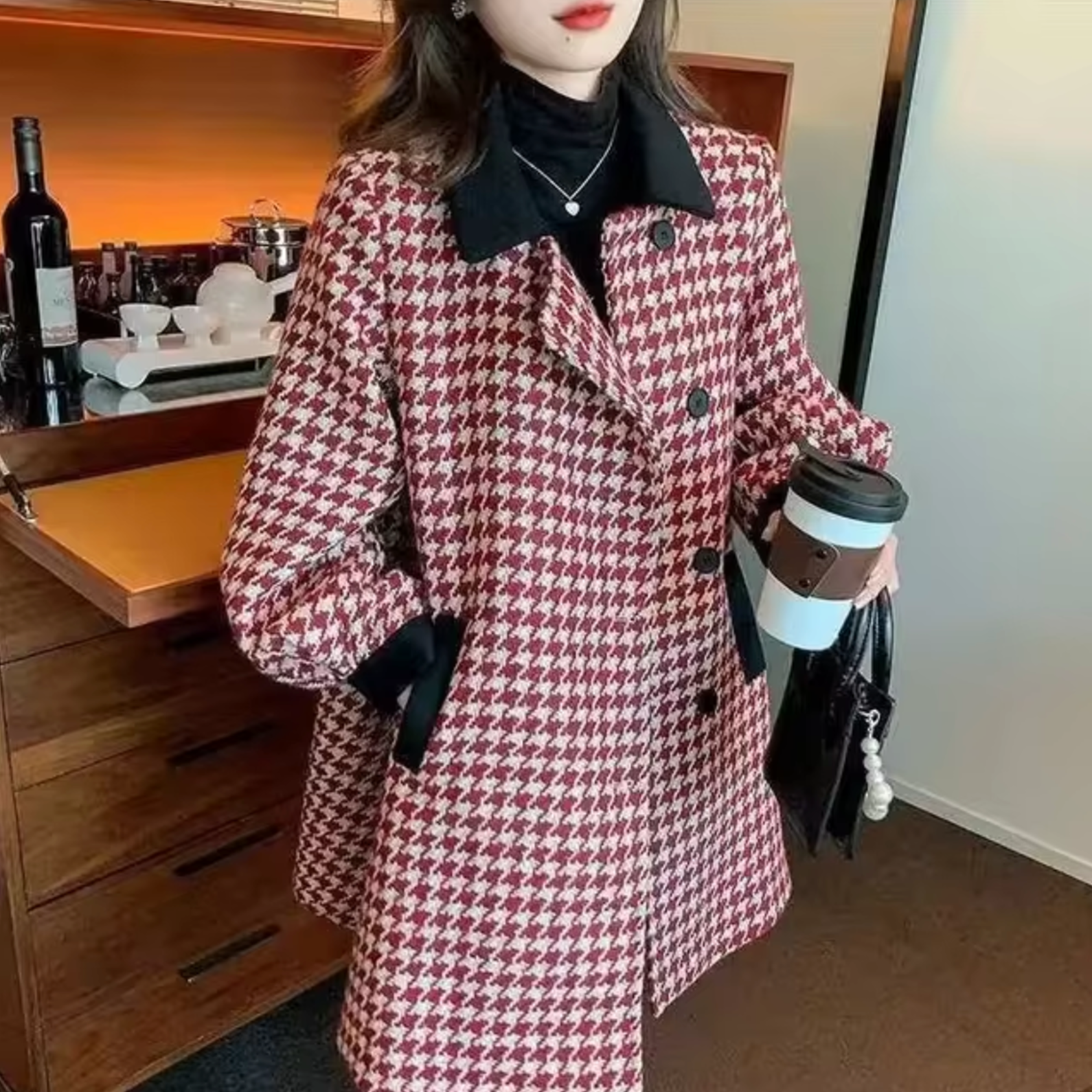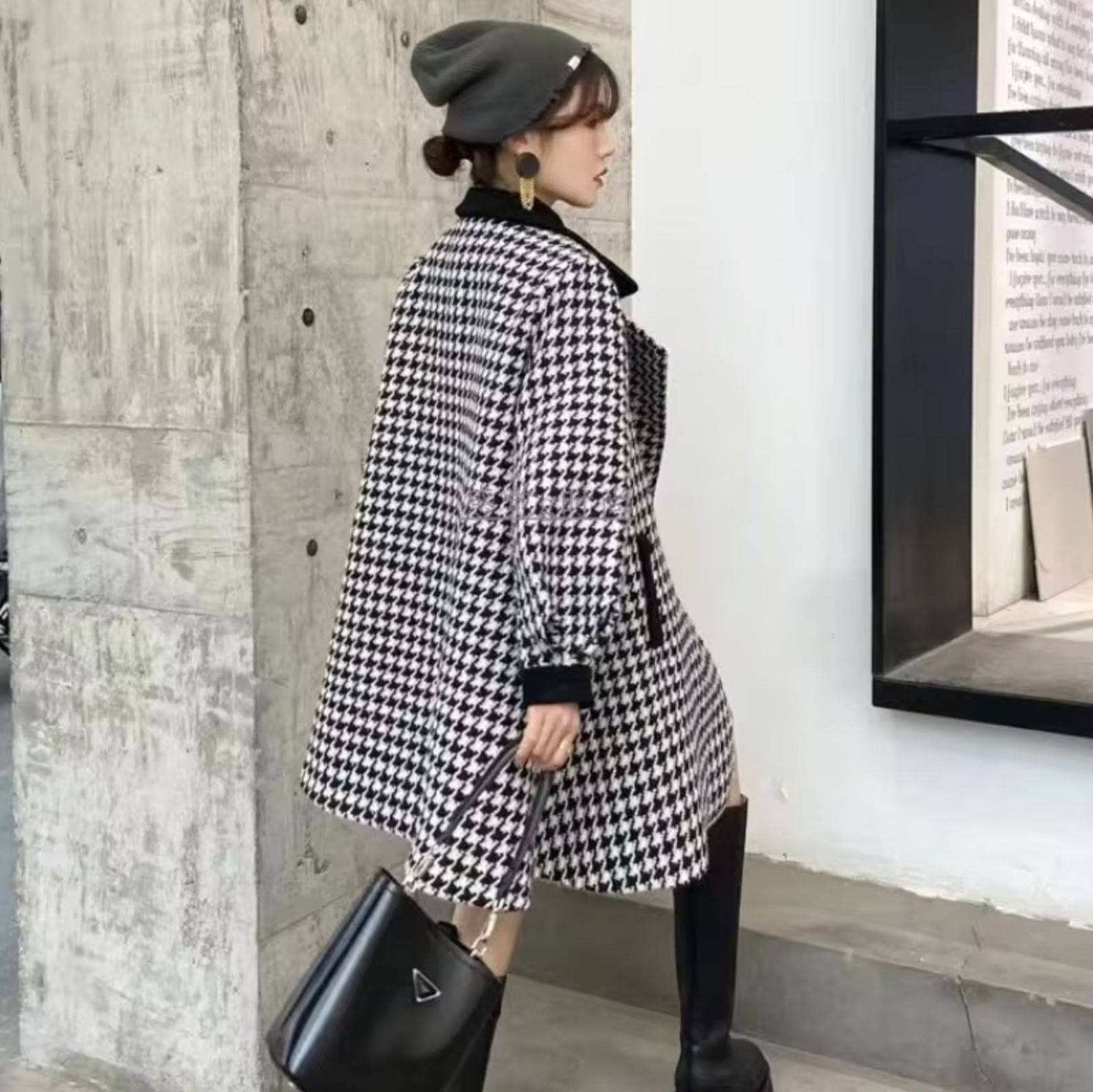 This women's tweed blazer is crafted from a premium wool blend fabric that offers warmth and comfort , featuring a timeless check pattern with a touch of velvet detail. With its tailored, longline fit, it adds elegance and sophistication to any outfit and is perfect for wearing outside in cooler weather.