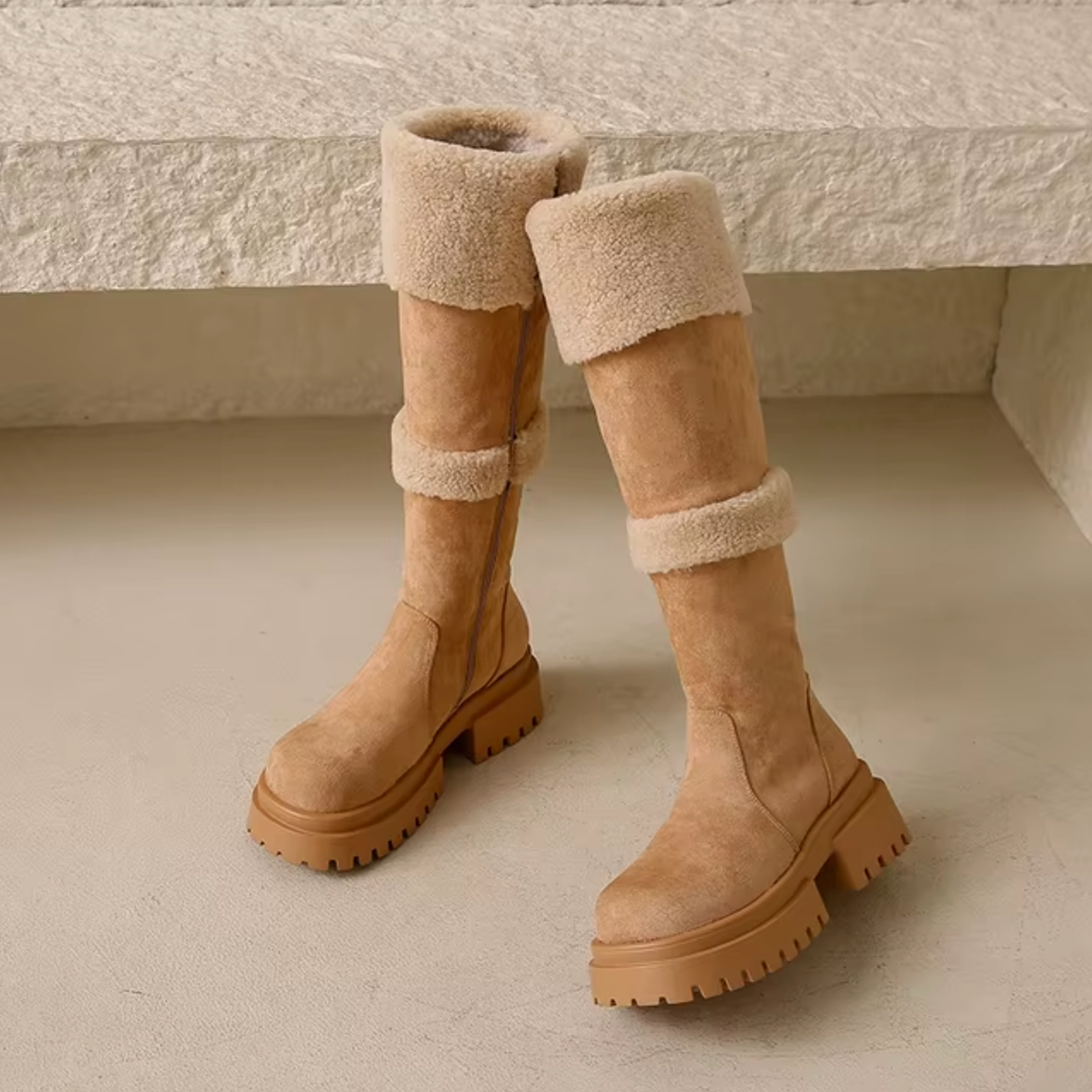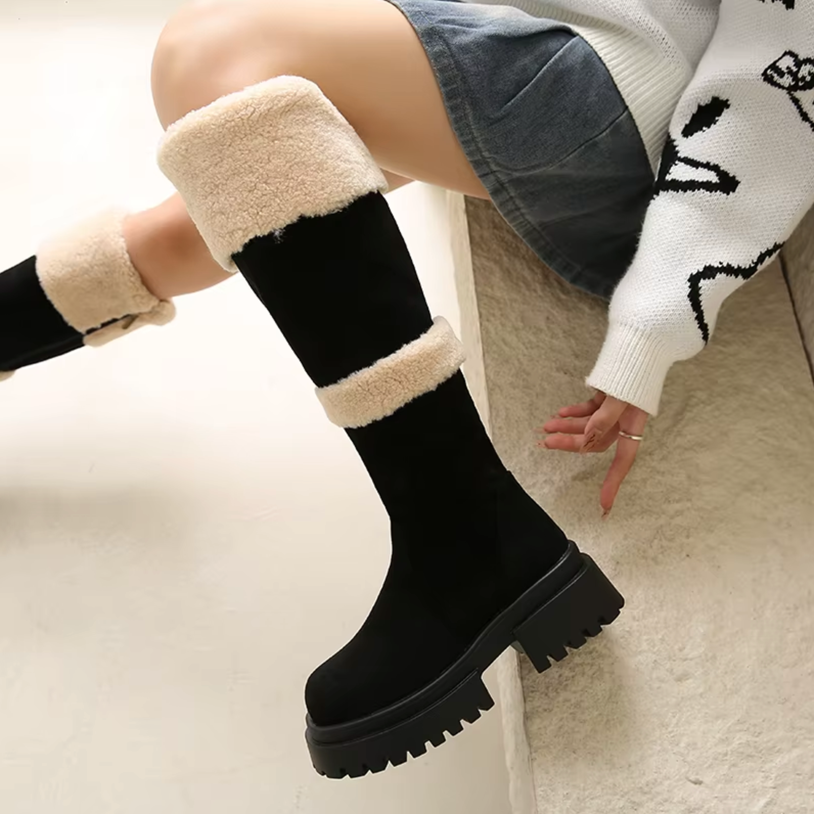 Stay warm and stylish this winter with these plush-lined knee-high boots , which offer comfort and elegance. With their sleek slip-on design and bold square heel, they offer a modern and practical touch to everyday wear.