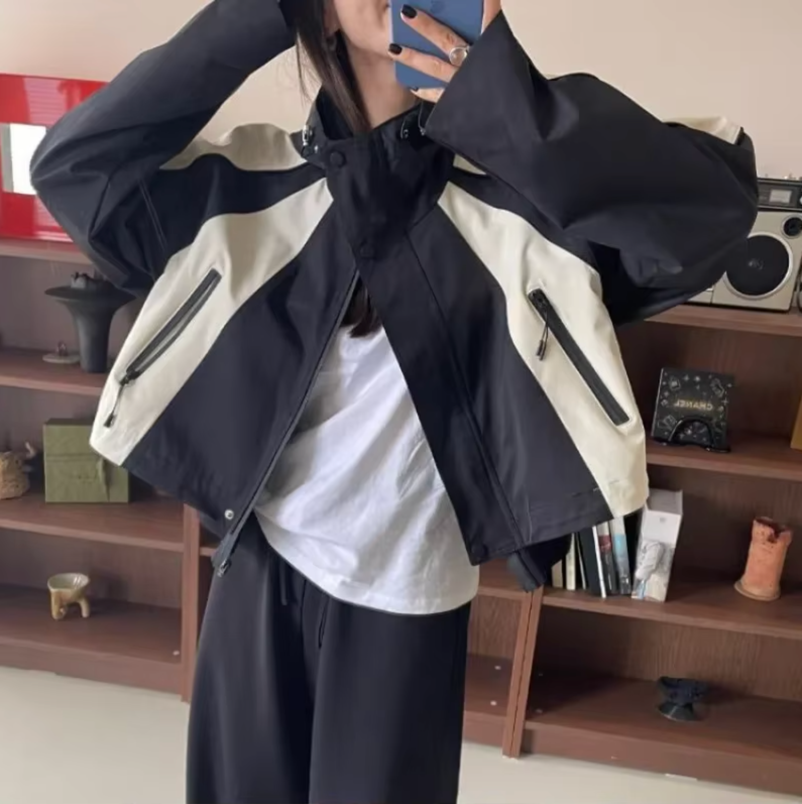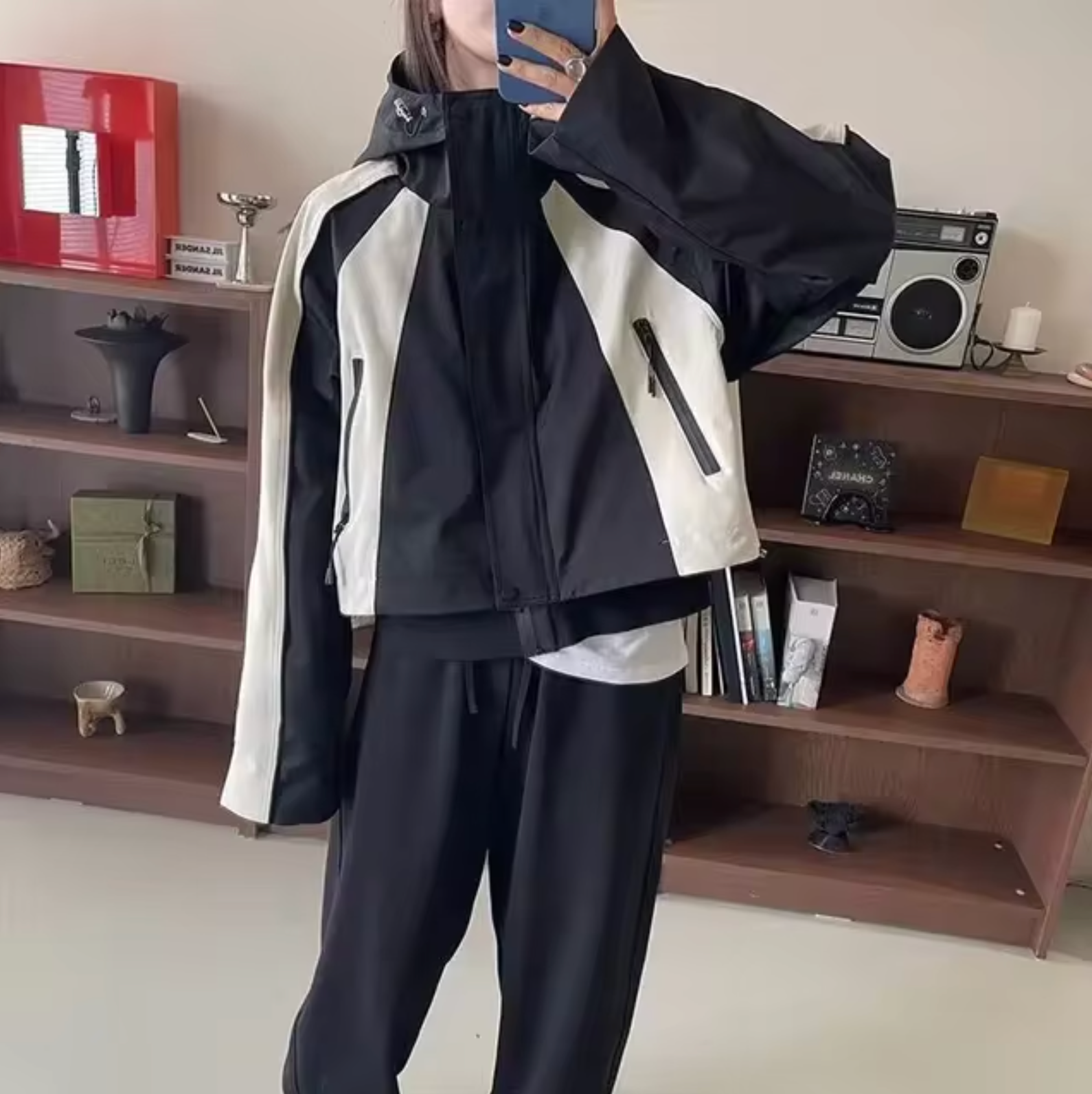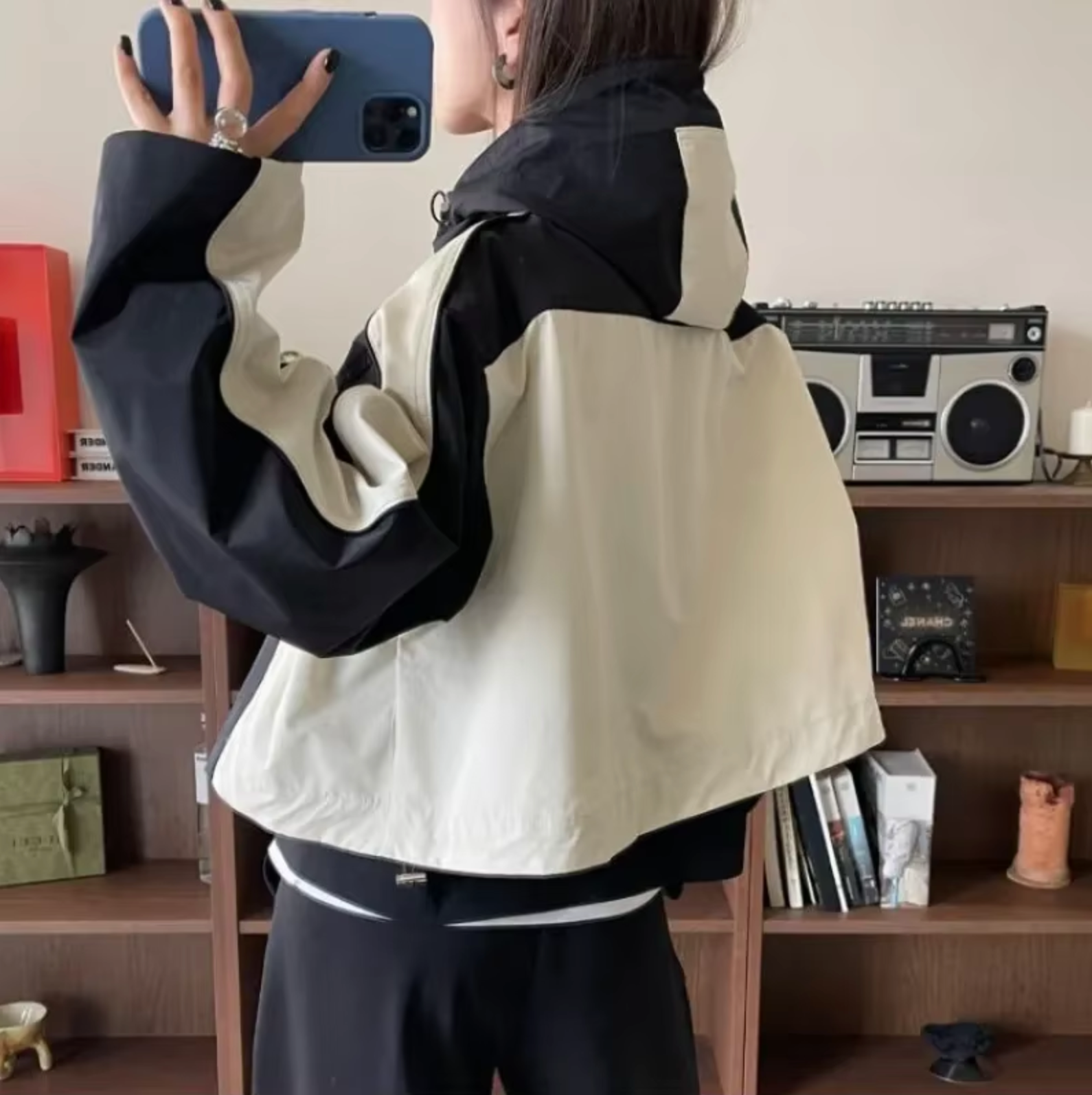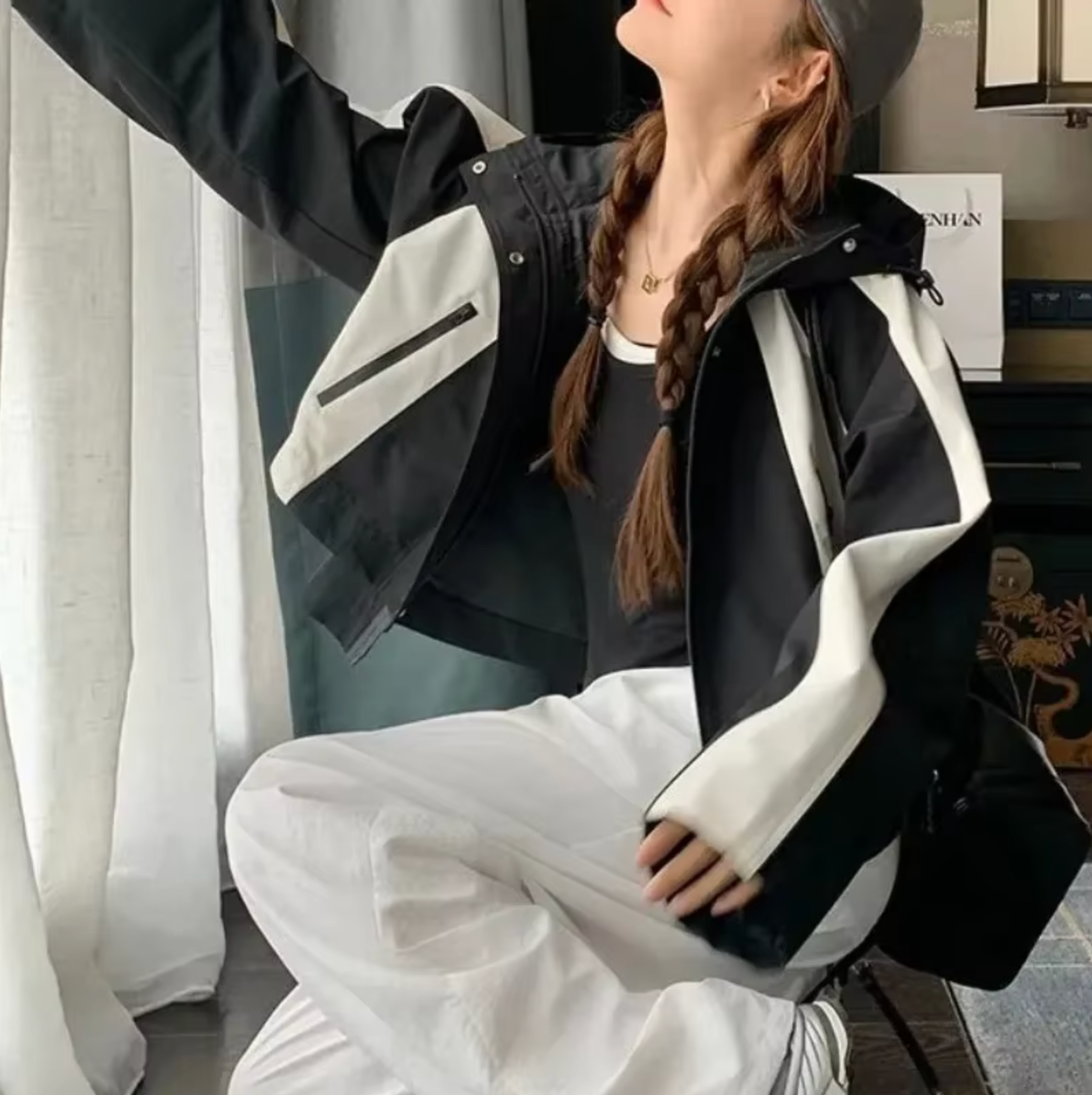 This versatile hooded coat combines classic black and white blocking for a modern, sporty look that 's ideal for spring and fall outdoor activities. Made from lightweight, wind-resistant fabric , it offers comfort and protection from a light breeze, making it perfect for casual outings, cycling or easy hikes.