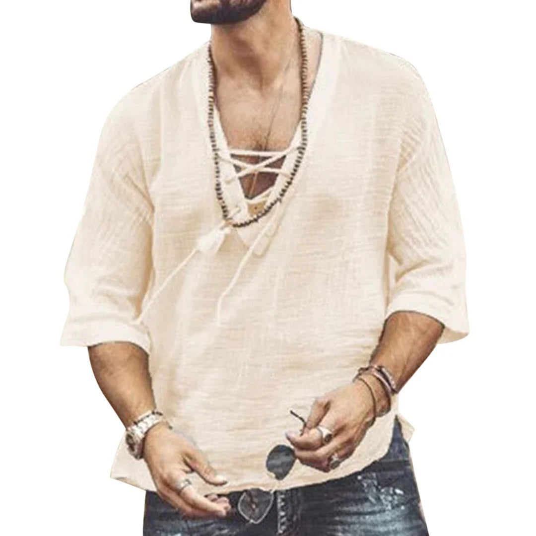 This bohemian-style shirt is made from a soft, breathable cotton-linen blend for lightweight comfort for warm weather. The unique tie-up V-neck and casual half sleeves create a casual yet stylish look.