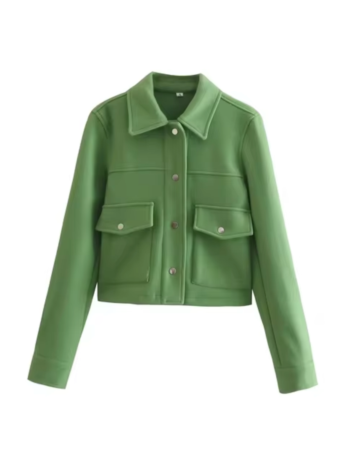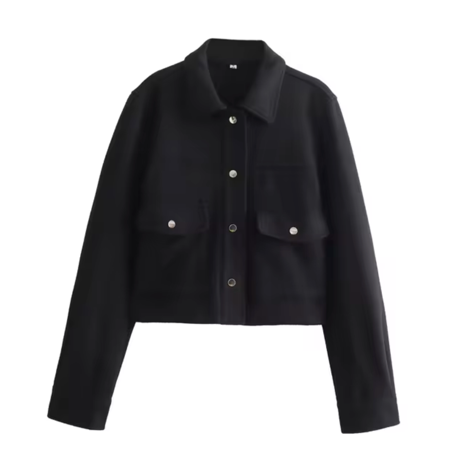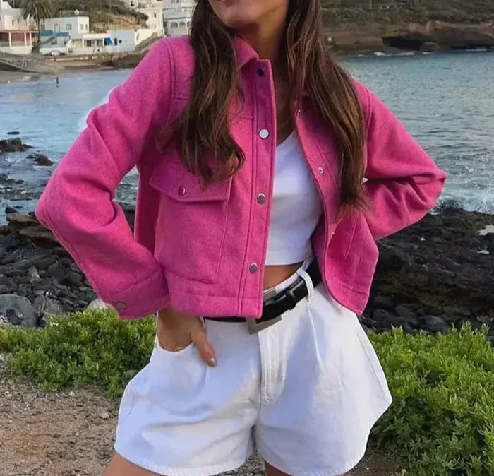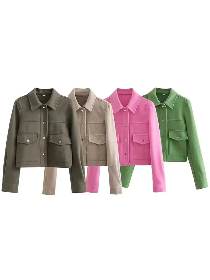 This women's fall jacket is made from a durable and breathable cotton blend that is soft to the touch and long-lasting. It has a loose yet tailored fit, features front pockets and a button closure, and combines elegance with everyday practicality.