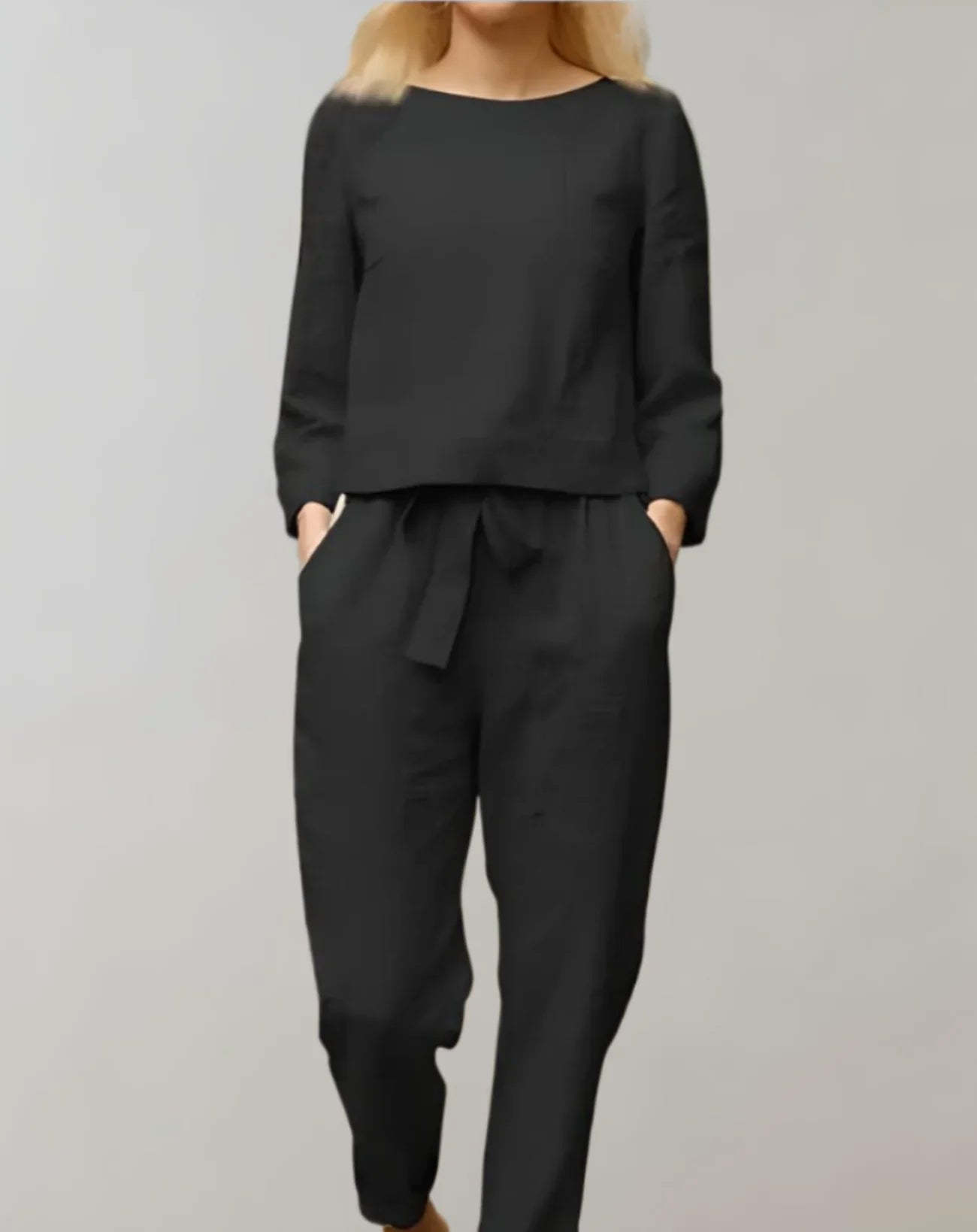 This chic two-piece set is made from a high-quality linen-cotton blend that ensures breathability and all-day comfort . The top has a loose fit with three-quarter sleeves, while the high-waisted pants feature a stylish tie at the front and functional side pockets.