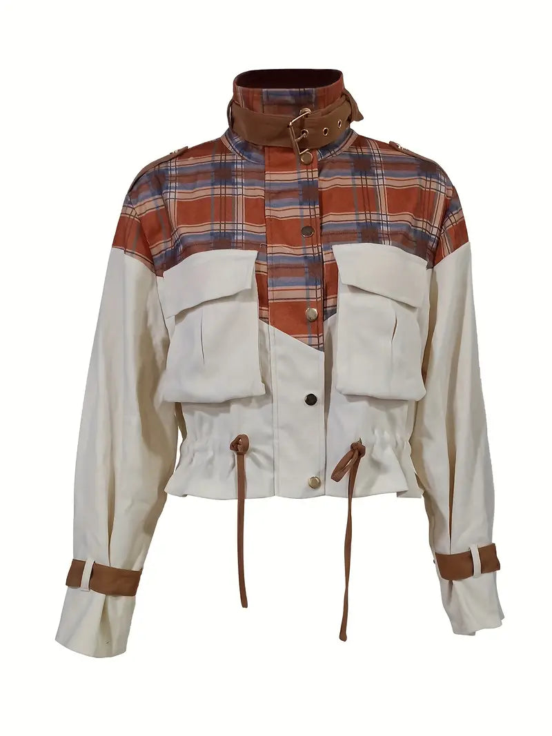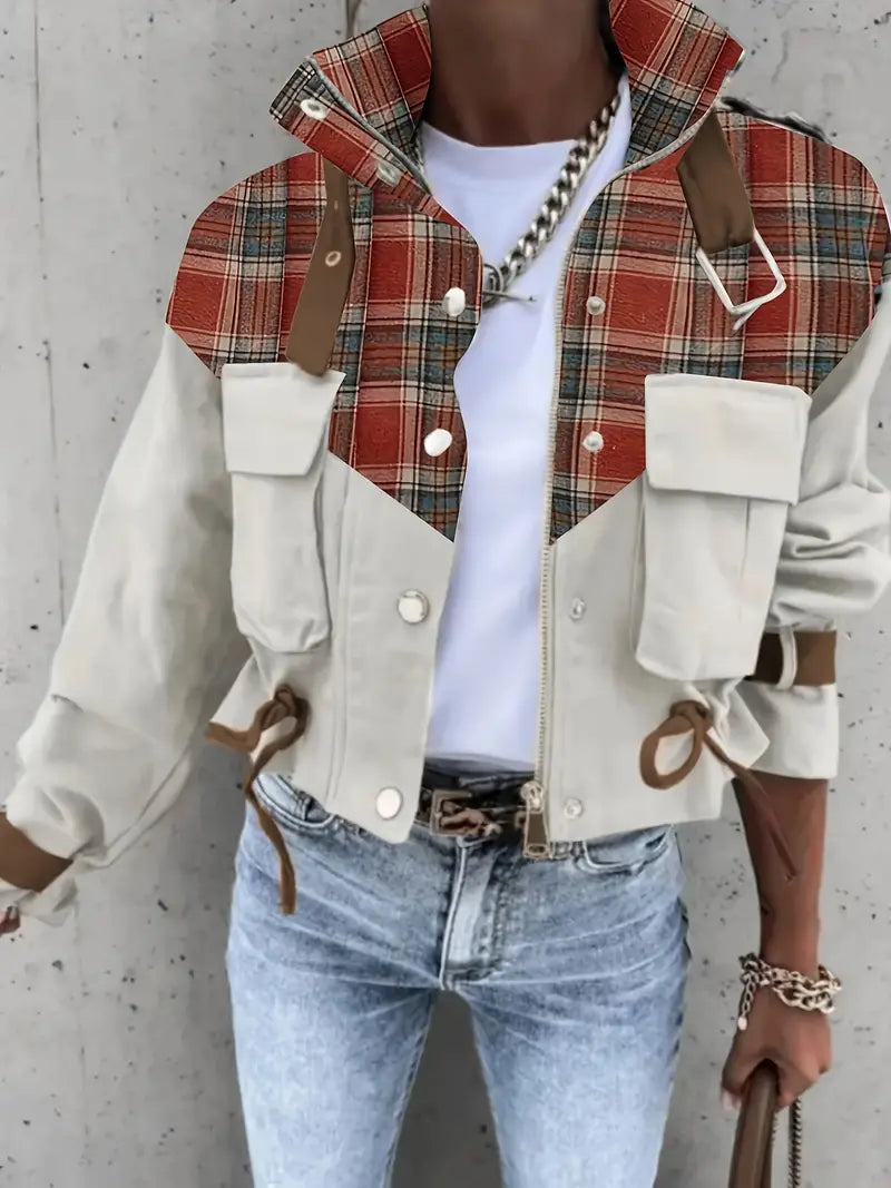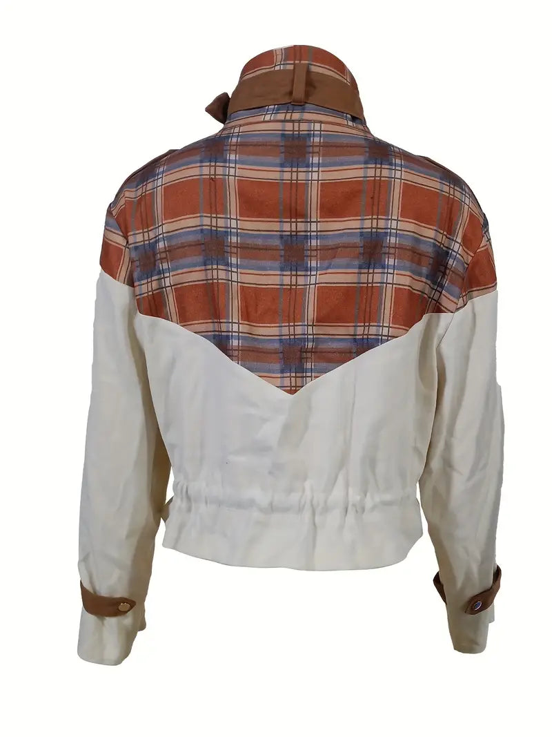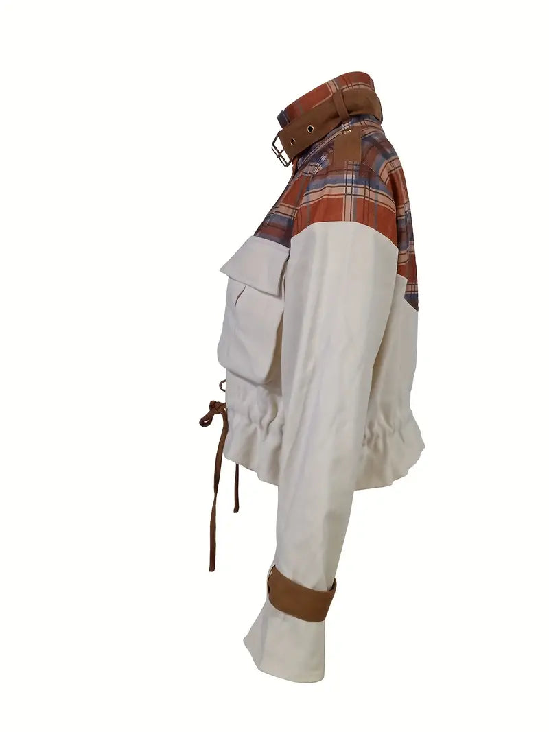 This unique cropped jacket combines modern utility with rustic charm. Made from a combination of cotton canvas and checked flannel , it offers durability and warmth. The beige body is complemented by eye-catching checked details on the shoulders and collar , which are given a trendy touch by leather strap accents .
