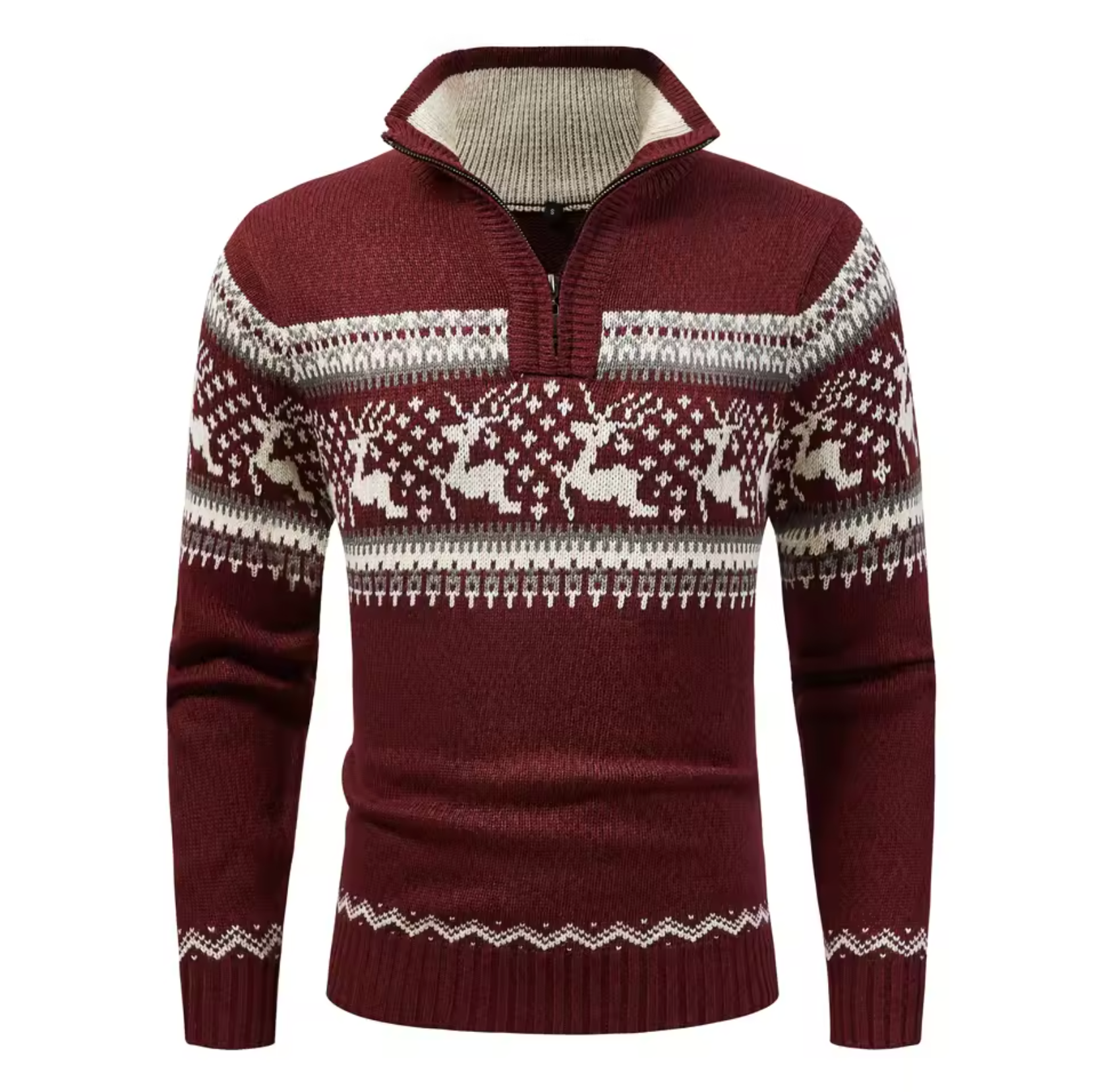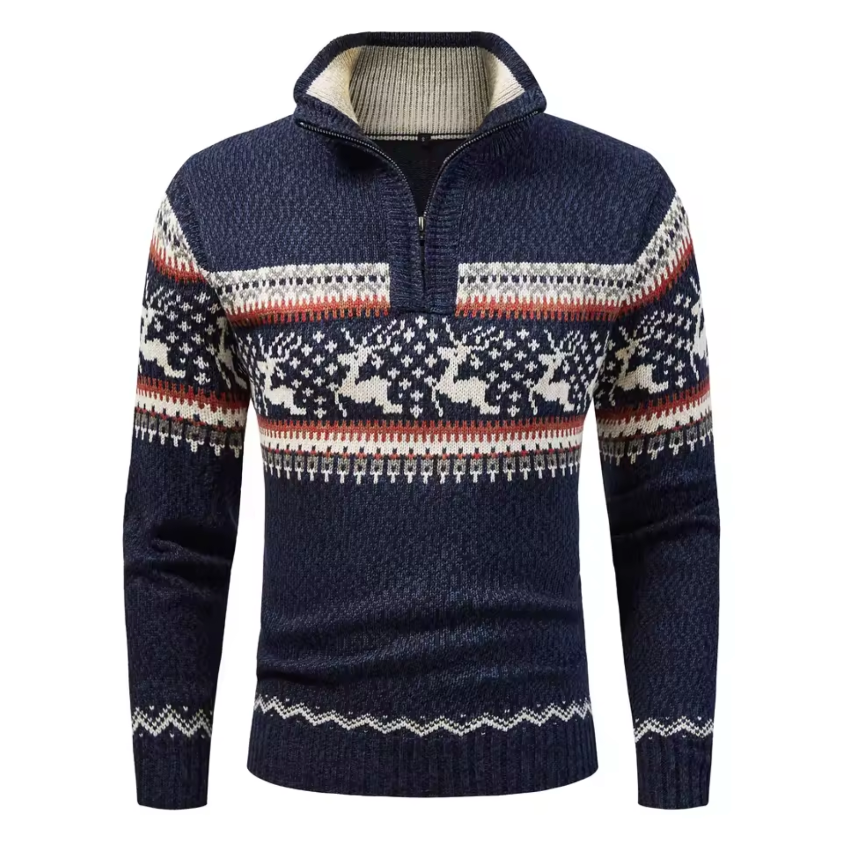This cosy knitted jumper features a classic winter design with reindeer and snowflake patterns, perfect for festive occasions or chilly days. Made from a soft and durable wool blend , it offers excellent warmth and a comfortable fit.