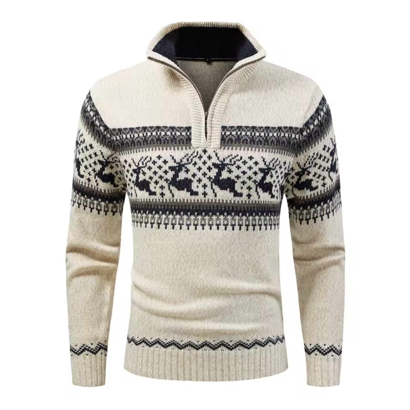 The high collar with half zip provides versatility and can be adjusted for extra insulation or a relaxed look. Ribbed cuffs and hem ensure a snug fit, making this sweater a fashionable and practical choice for cold weather. It's ideal for layering in dry weather.