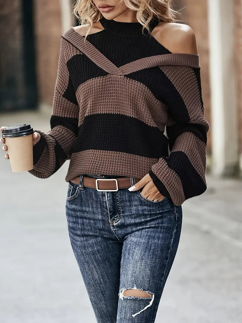 This striped knit sweater combines comfort with modern style. Made from a soft, breathable blend of premium fabric , it feels lightweight yet cozy. It has a loose fit and an off-the-shoulder design with cutout details for a chic, edgy look.