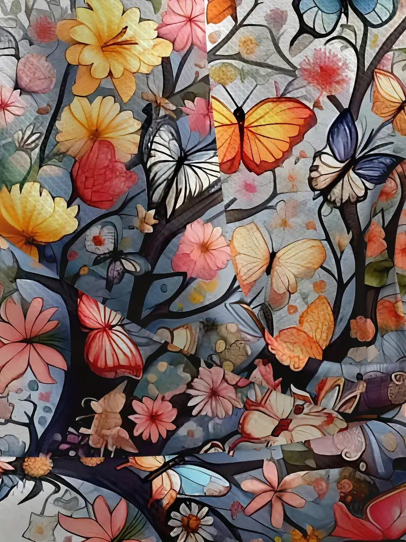 Bring a touch of nature to your everyday style with this beautifully printed graphic tee . Featuring a vibrant tree adorned with delicate flowers and colorful butterflies , this design exudes charm and positivity .