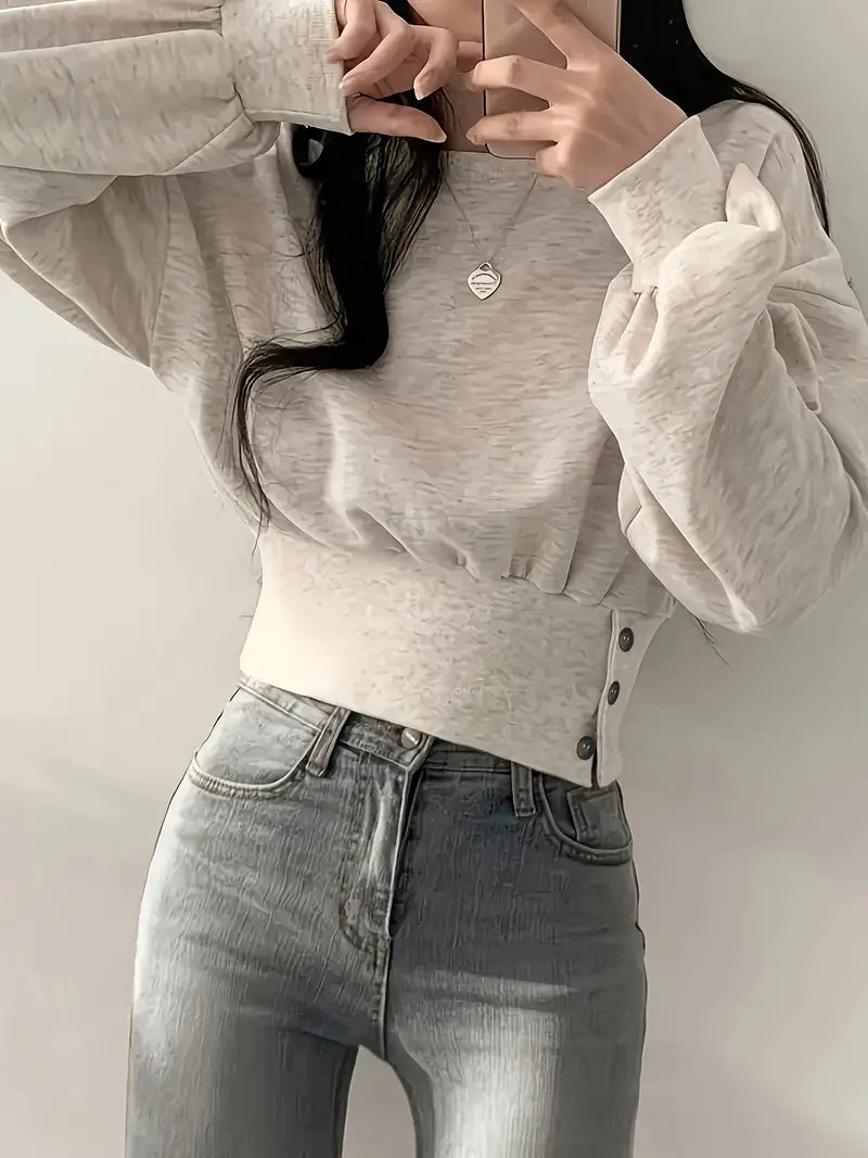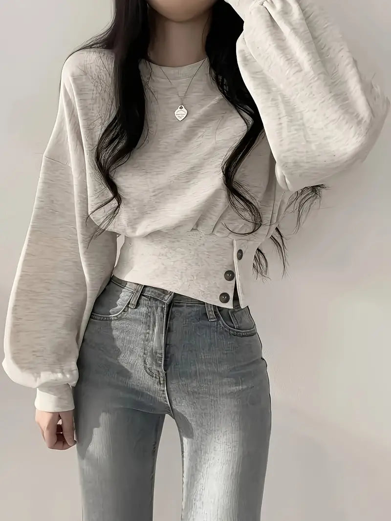 This trendy sweatshirt is made from a soft cotton blend fabric that offers comfort and breathability . It has a loose fit with balloon sleeves and a ribbed, button-accented waistband that cinches in at the waist for a flattering silhouette.