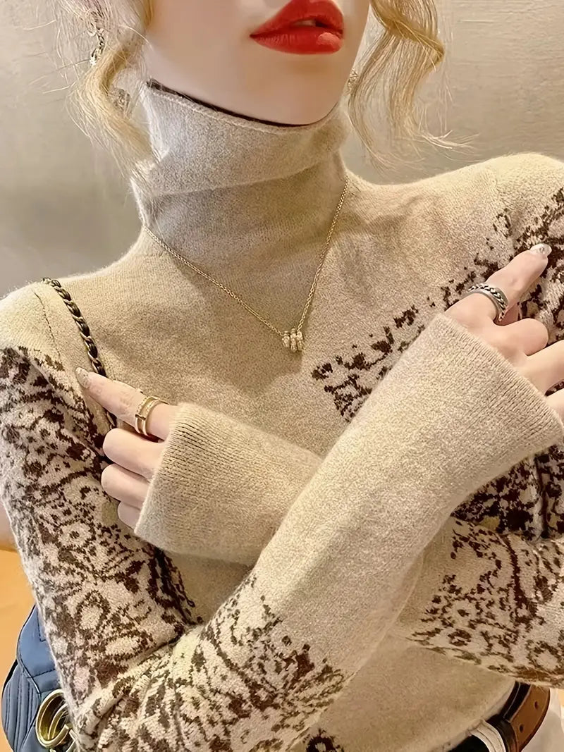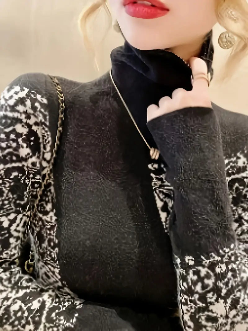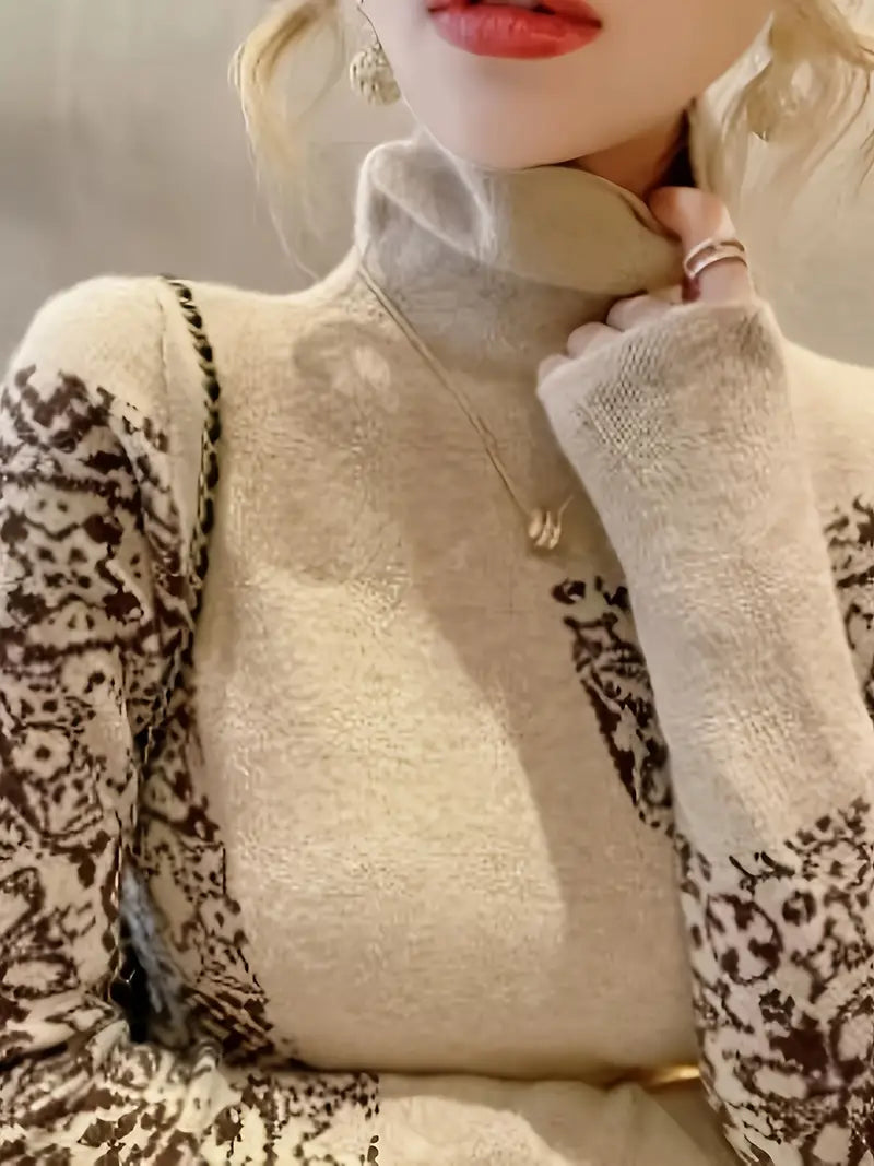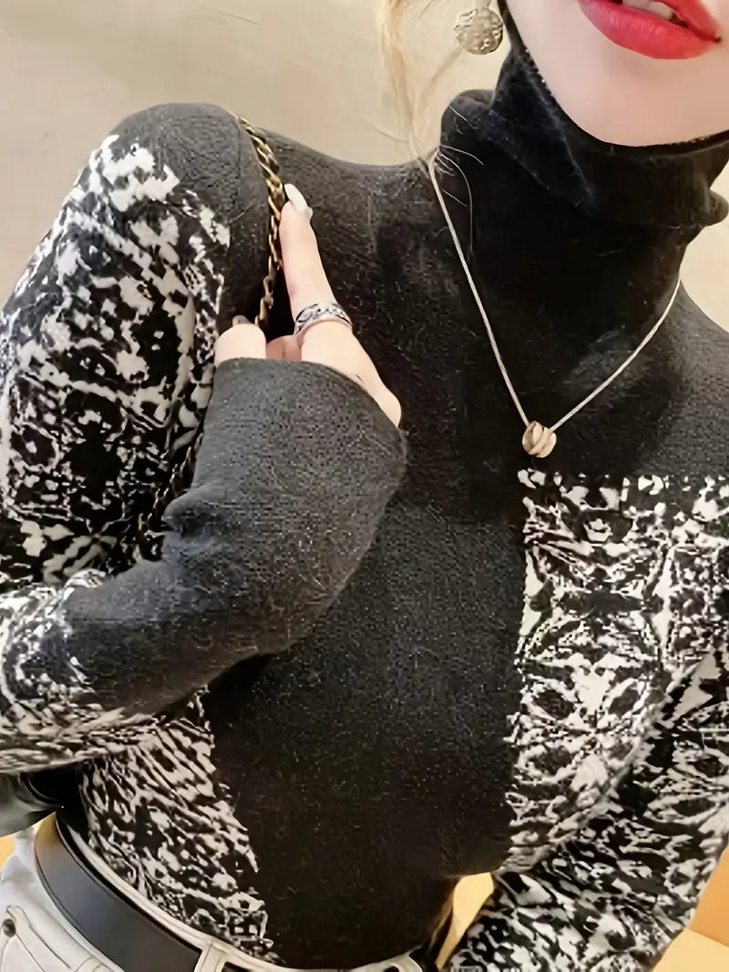 This sophisticated turtleneck sweater is made from a soft and cozy knit fabric that offers warmth and comfort for cooler days. The bold abstract pattern gives it a modern, artistic touch, making it a highlight in any wardrobe.
