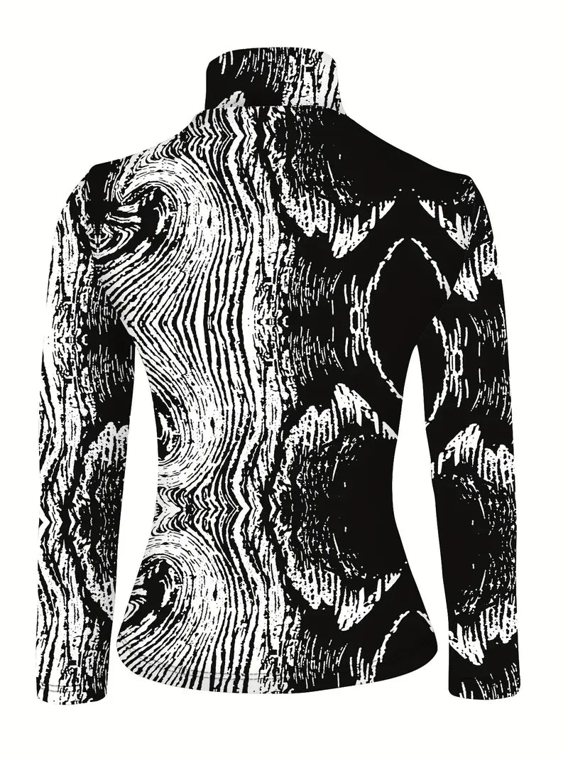Featuring a striking black and white abstract wood grain pattern, this high neck, long sleeve top is made from a soft, stretchy, high quality elastane blend for a comfortable, figure-hugging fit.