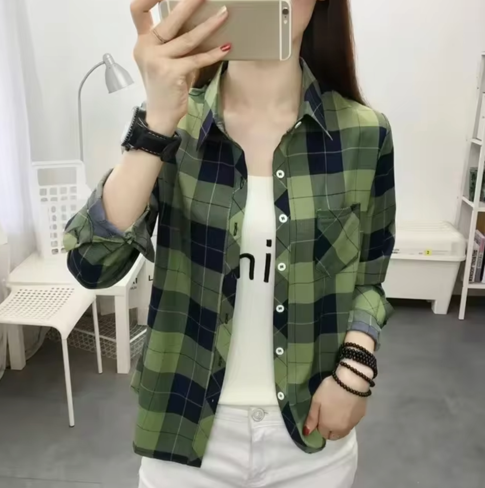 Step out in style with this women's long sleeve checked top, which adds a touch of sophistication to any outfit with its trendy check pattern . Made from a soft, lightweight cotton blend , the shirt offers a comfortable fit that makes for easy layering. The long sleeves add extra warmth, while the loose silhouette allows for freedom of movement .