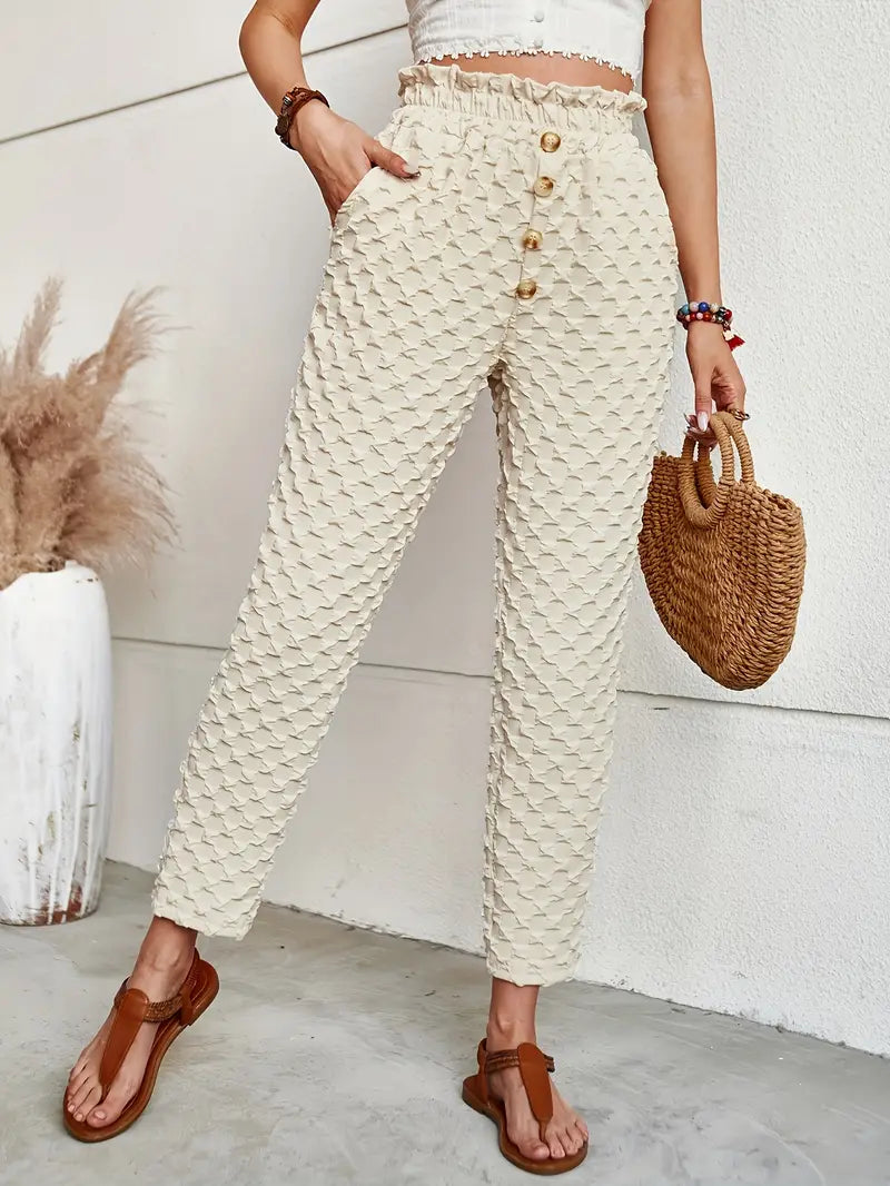 These structured beige pants are made from lightweight, breathable fabric with a unique 3D pattern that adds dimension and a stylish touch to your look . They have a loose, tailored fit, a comfortable elastic waistband and a button placket for a sleek finish.