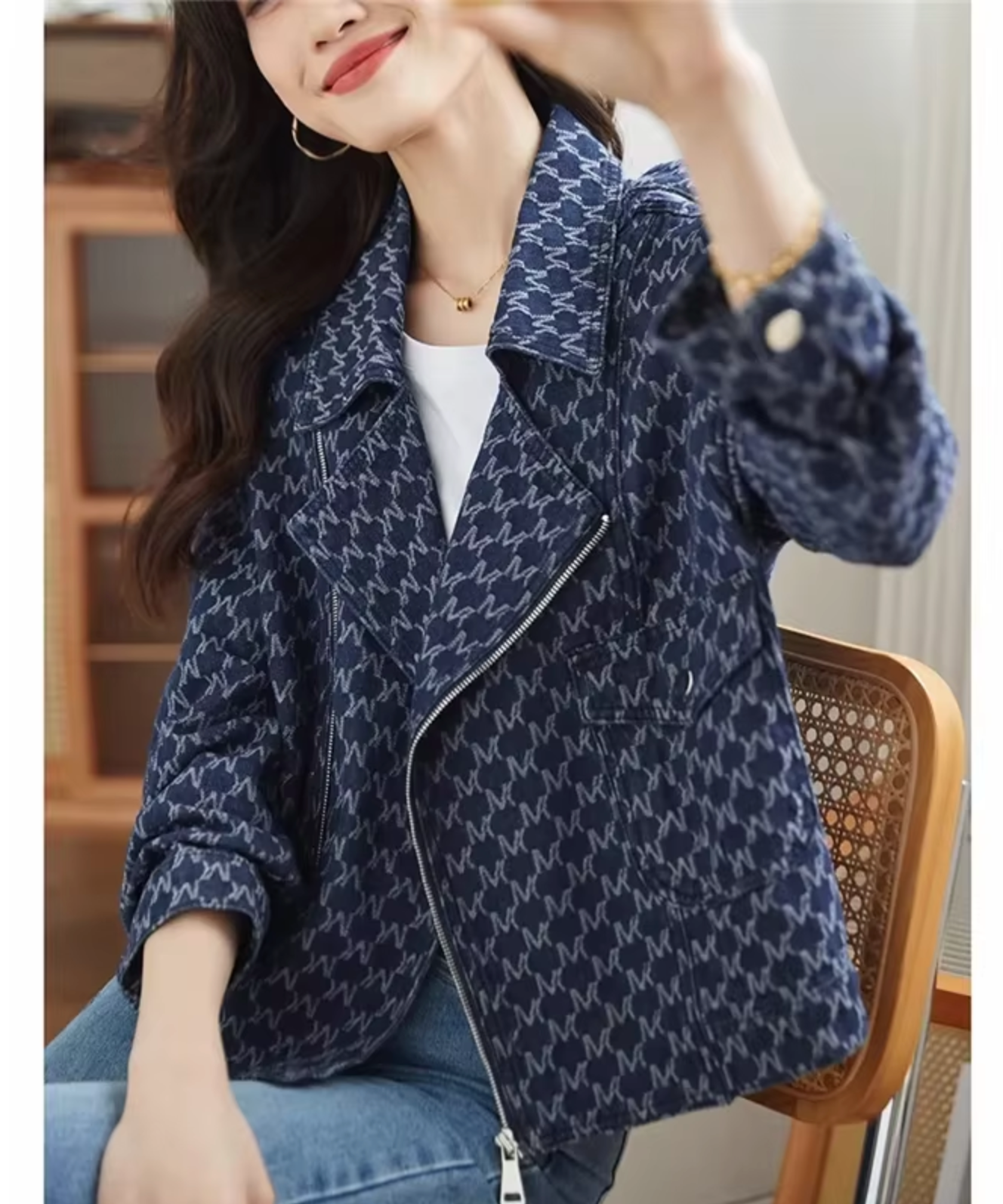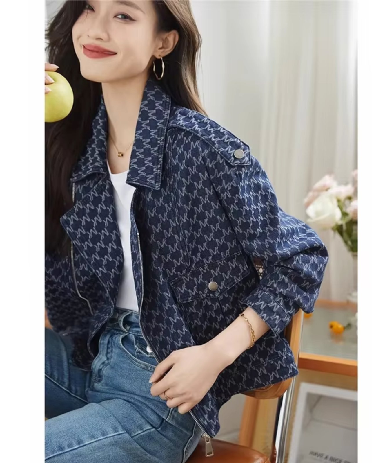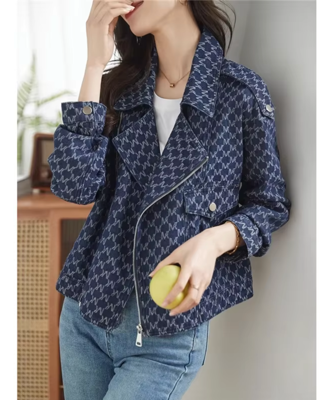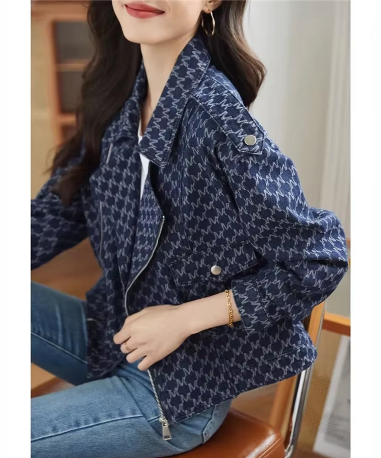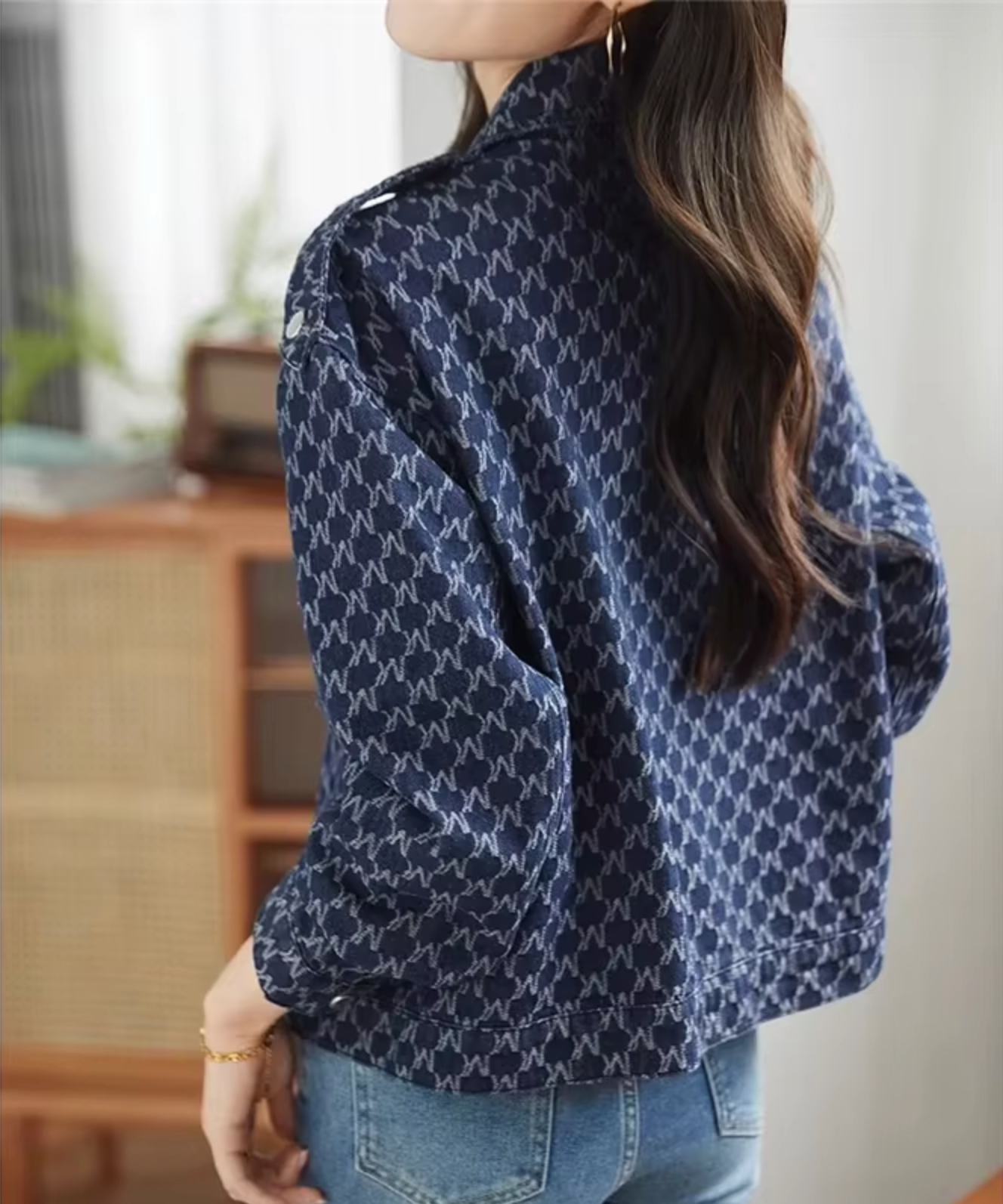 Crafted from a patterned denim blend, this fashionable jacket offers a bold, structured look with a subtle houndstooth-inspired print. It has a relaxed fit with a structured collar and snap epaulettes, creating the perfect balance between casual and dressy.
