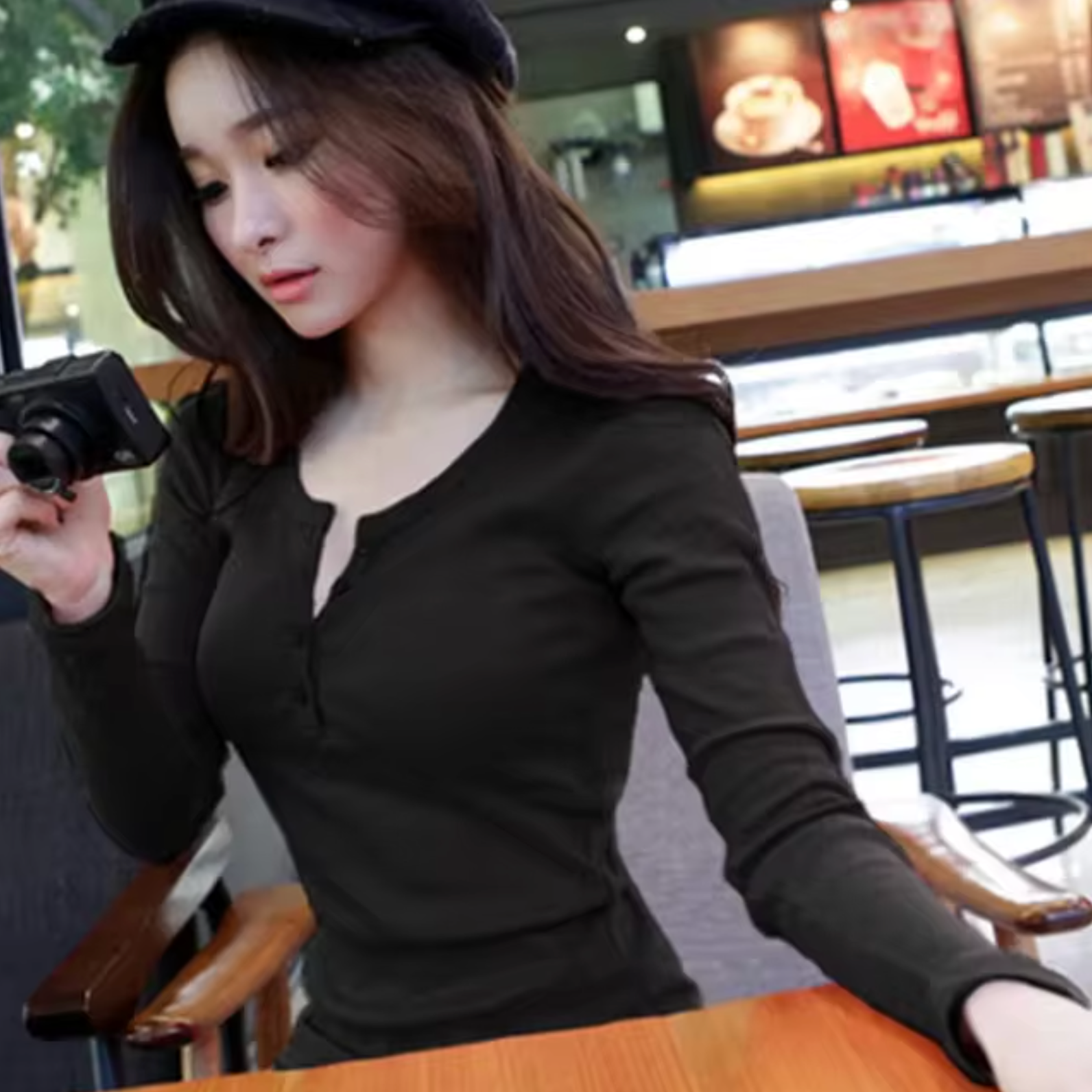 This fitted button -down tee is made from a soft, breathable cotton blend for all-day comfort. The solid-coloured top has long sleeves and a flattering slim fit that makes it ideal as a base layer or as a standalone piece.