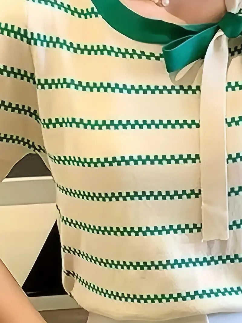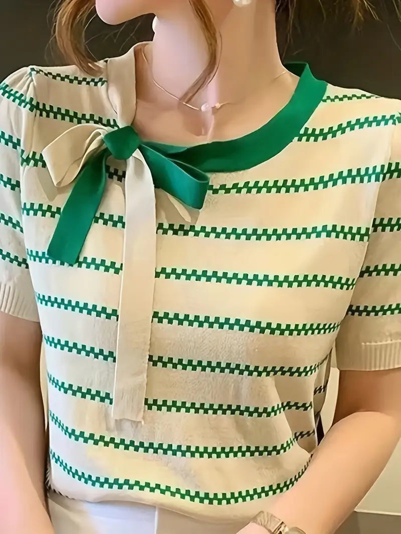 Add a touch of vintage charm to your wardrobe with this elegant striped knit top . Featuring a delicate bow at the neckline and contrasting trim , this piece exudes a sophisticated yet playful aesthetic.