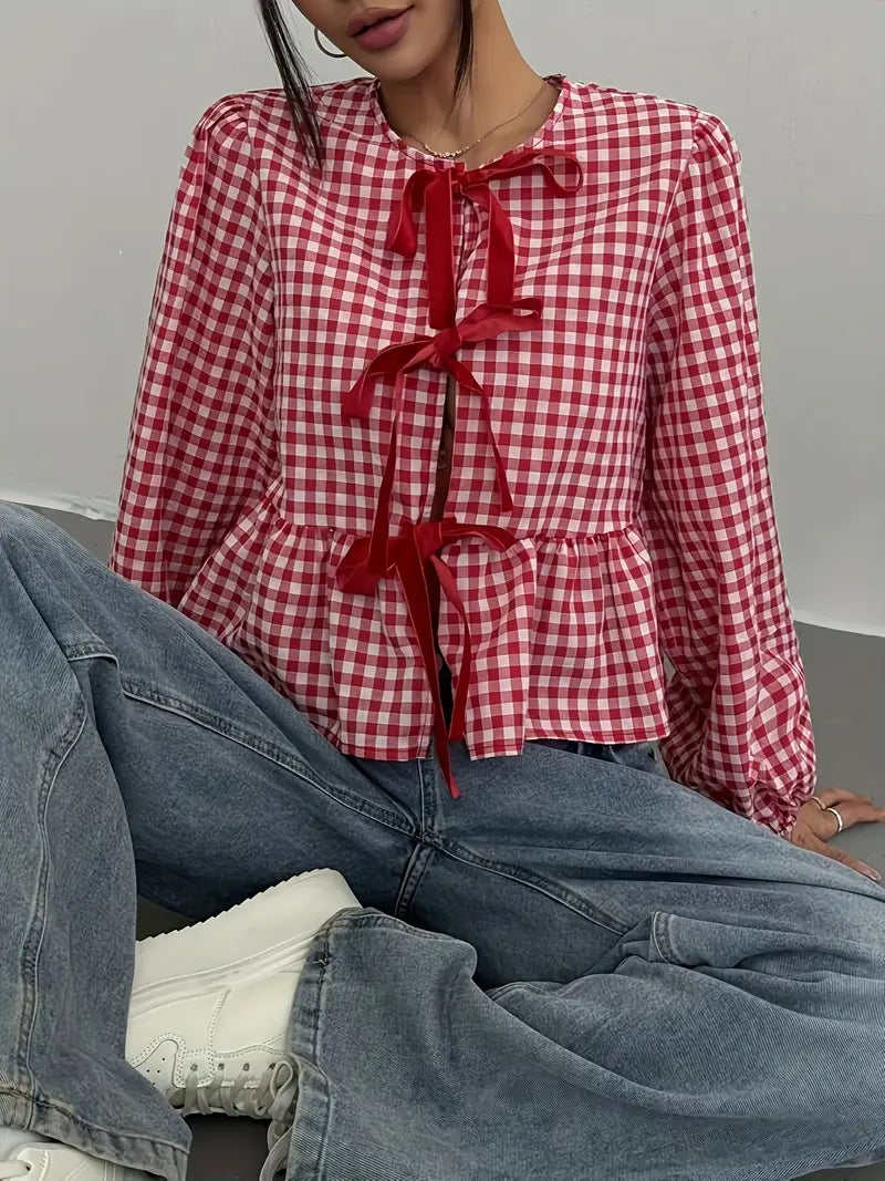 Add vintage charm to your wardrobe with this gingham bow tie blouse. Featuring a classic check pattern in bold hues, this top is designed with a feminine peplum hem and voluminous long sleeves .