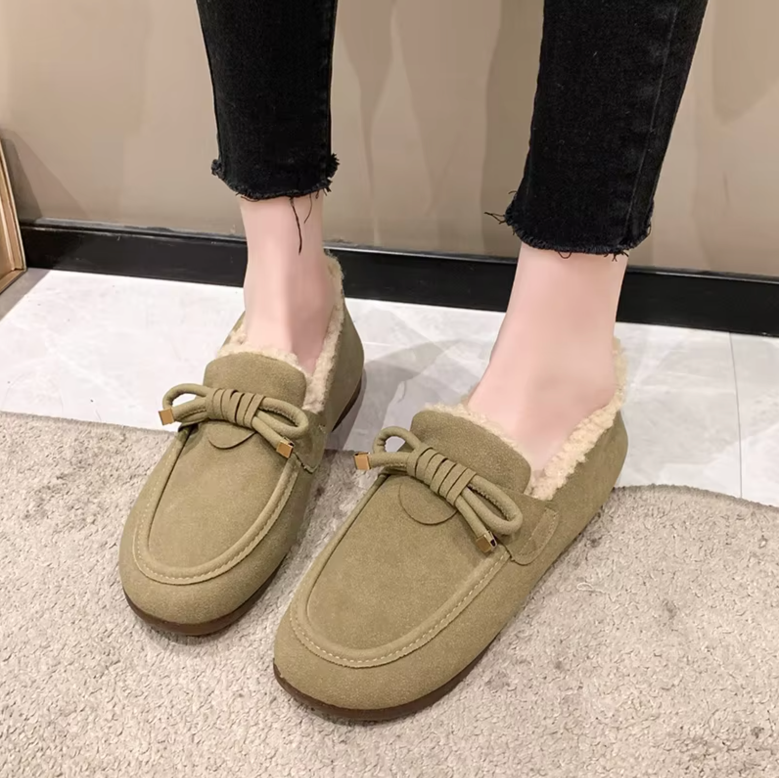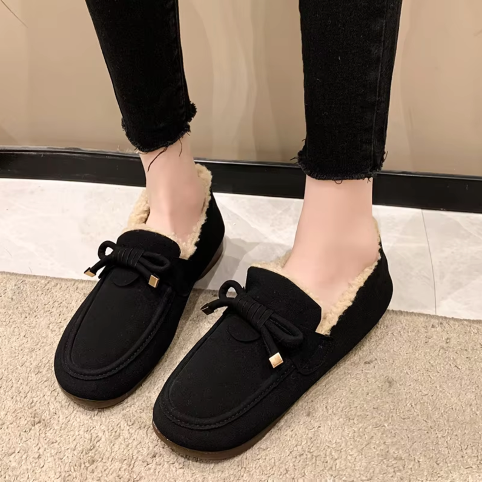 Stay cozy and stylish this winter with our fur loafers with bow and knot for women. These casual sneakers feature a charming butterfly knot detail that adds a touch of feminine elegance to the classic loafer design. The soft fur lining keeps your feet warm and comfortable, while the round toe offers plenty of room for a relaxed fit, making them perfect for all-day wear.