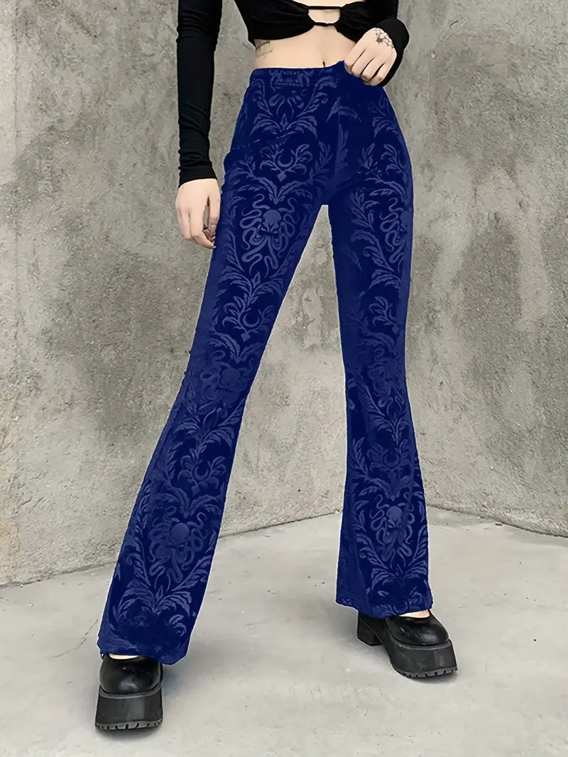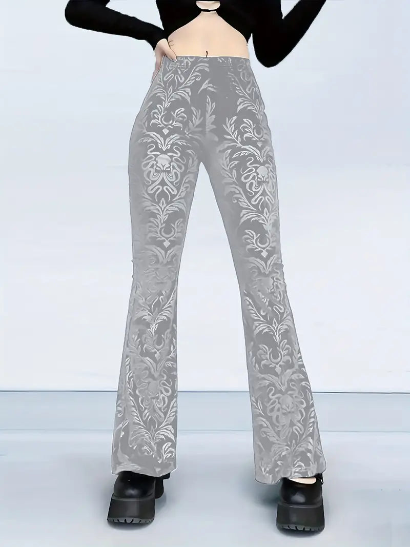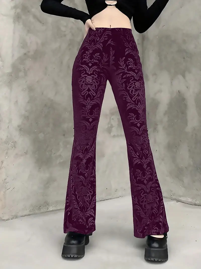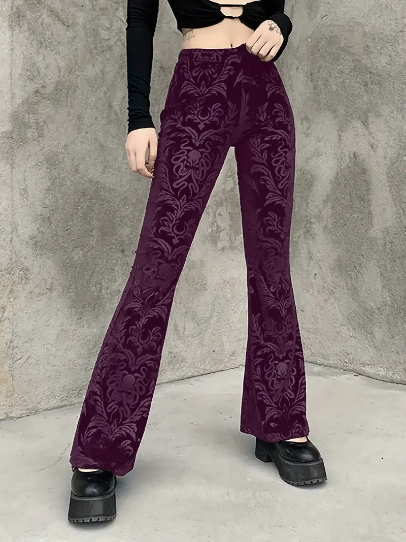 These gothic-style floral high-waisted trousers add an elegant touch to any outfit , as they feature a striking pattern and a flattering flared leg silhouette. Made from soft, breathable fabric , they offer a comfortable, fitted shape through the hips and thighs, tapering gracefully below the knee .