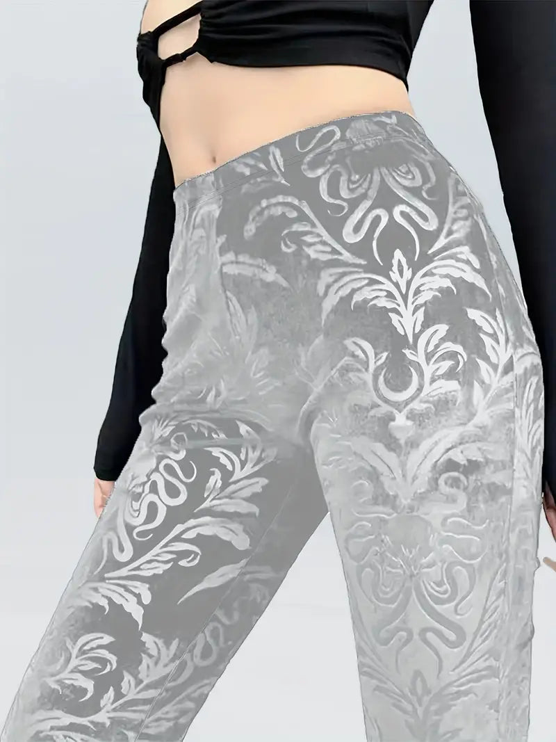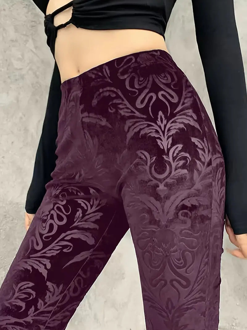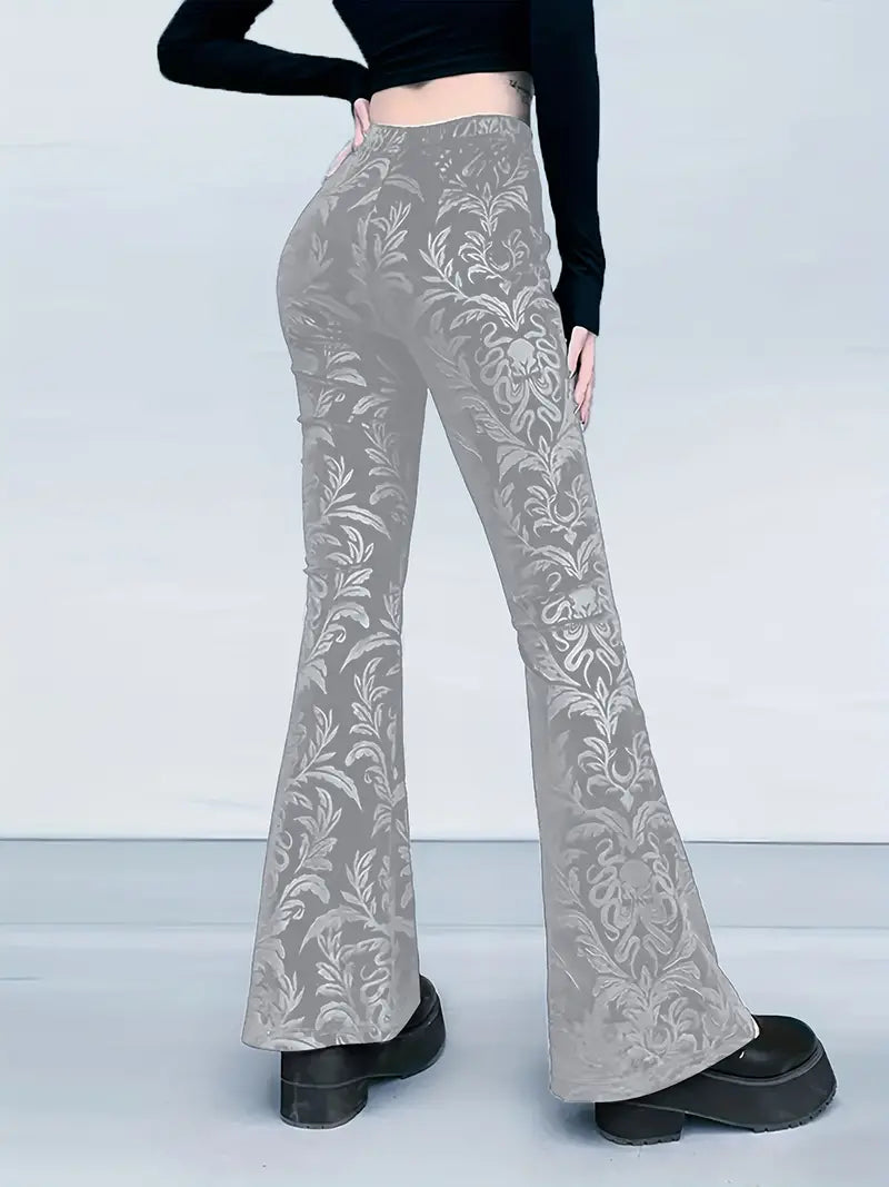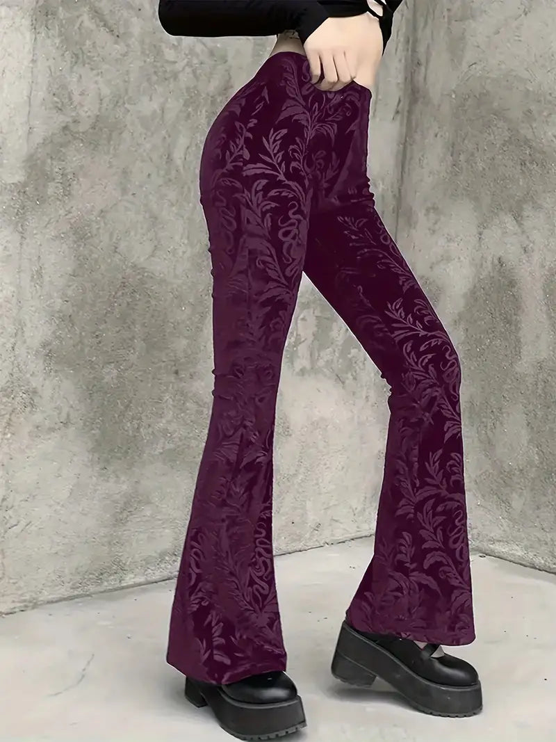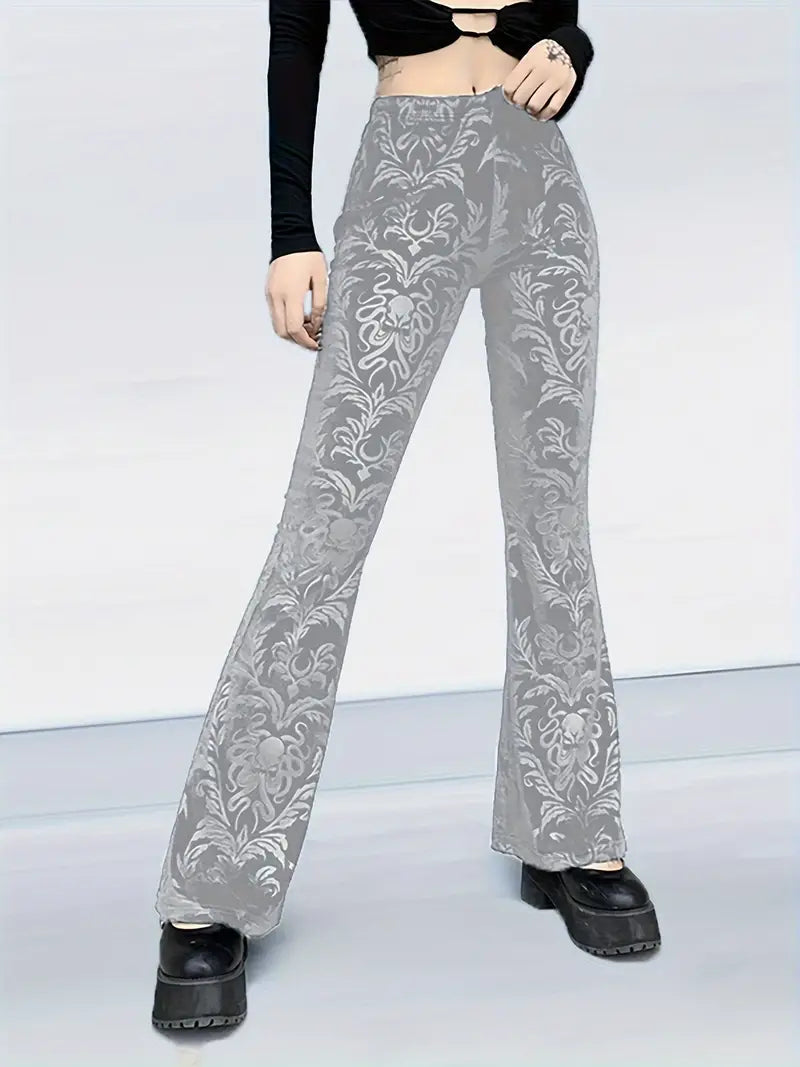 These gothic-style floral high-waisted trousers add an elegant touch to any outfit , as they feature a striking pattern and a flattering flared leg silhouette. Made from soft, breathable fabric , they offer a comfortable, fitted shape through the hips and thighs, tapering gracefully below the knee .