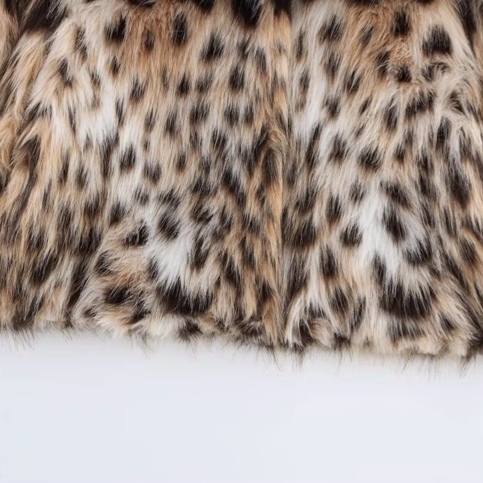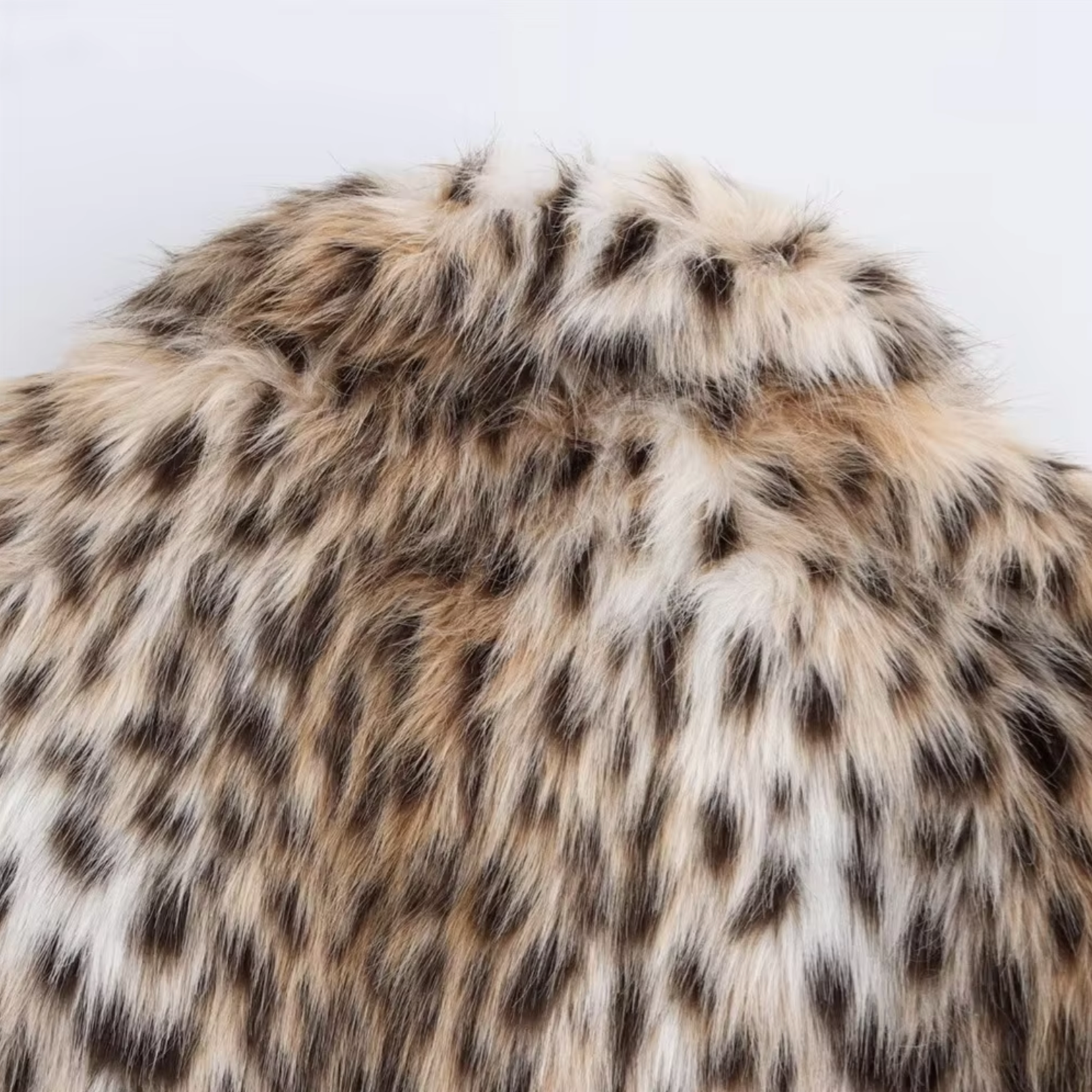 This leopard print fur jacket adds a bold and luxurious touch to any outfit . Featuring a classic collar and plush texture, it offers warmth and style for the colder seasons.