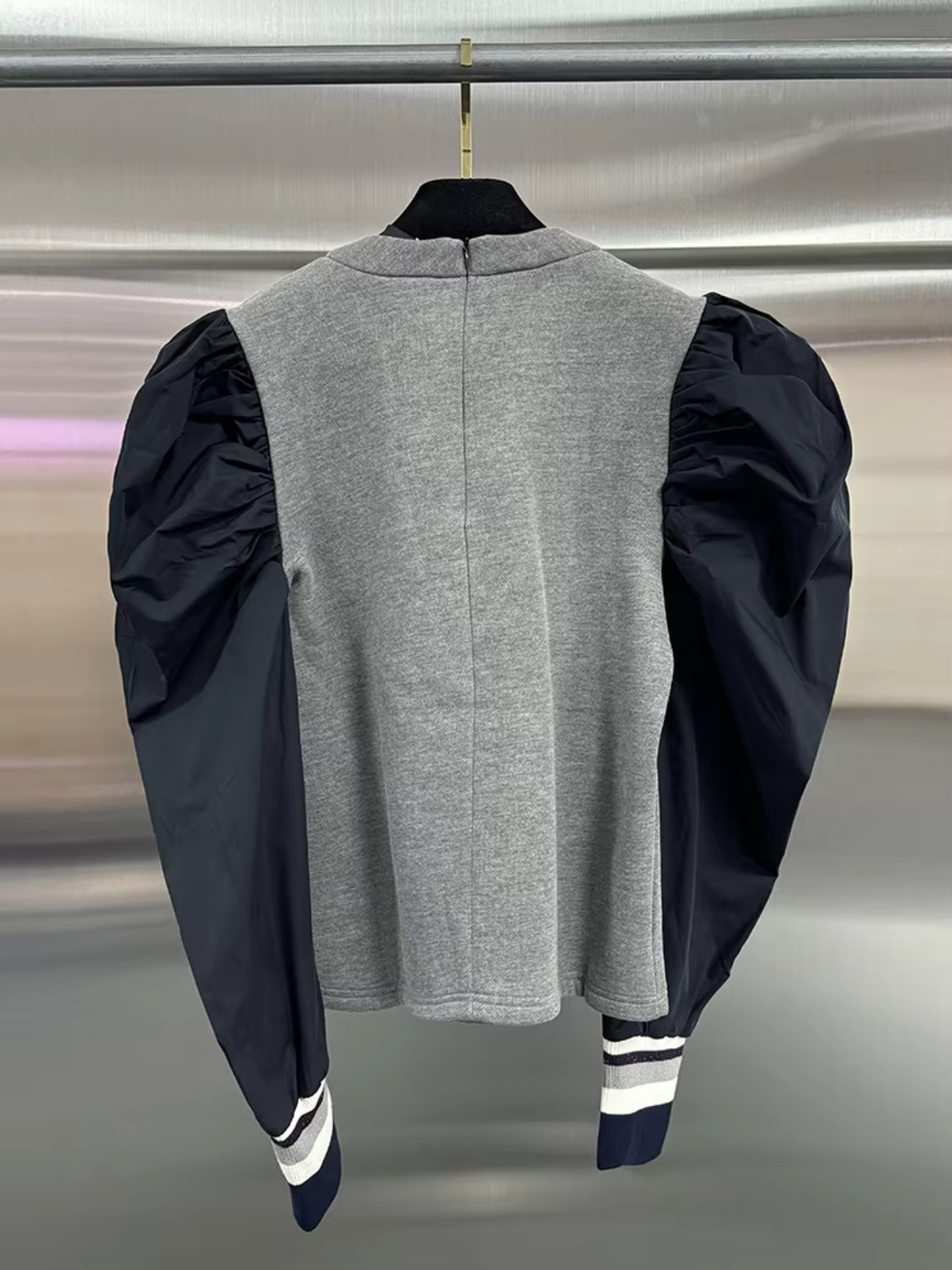 This top combines a cozy grey cotton body with dramatic, voluminous black sleeves to create a chicContrast sleeve design . The sleeves feature a puffed shoulder silhouette for a bold, structured look , and taper to a ribbed cuff with white and grey trim for a sporty finish.