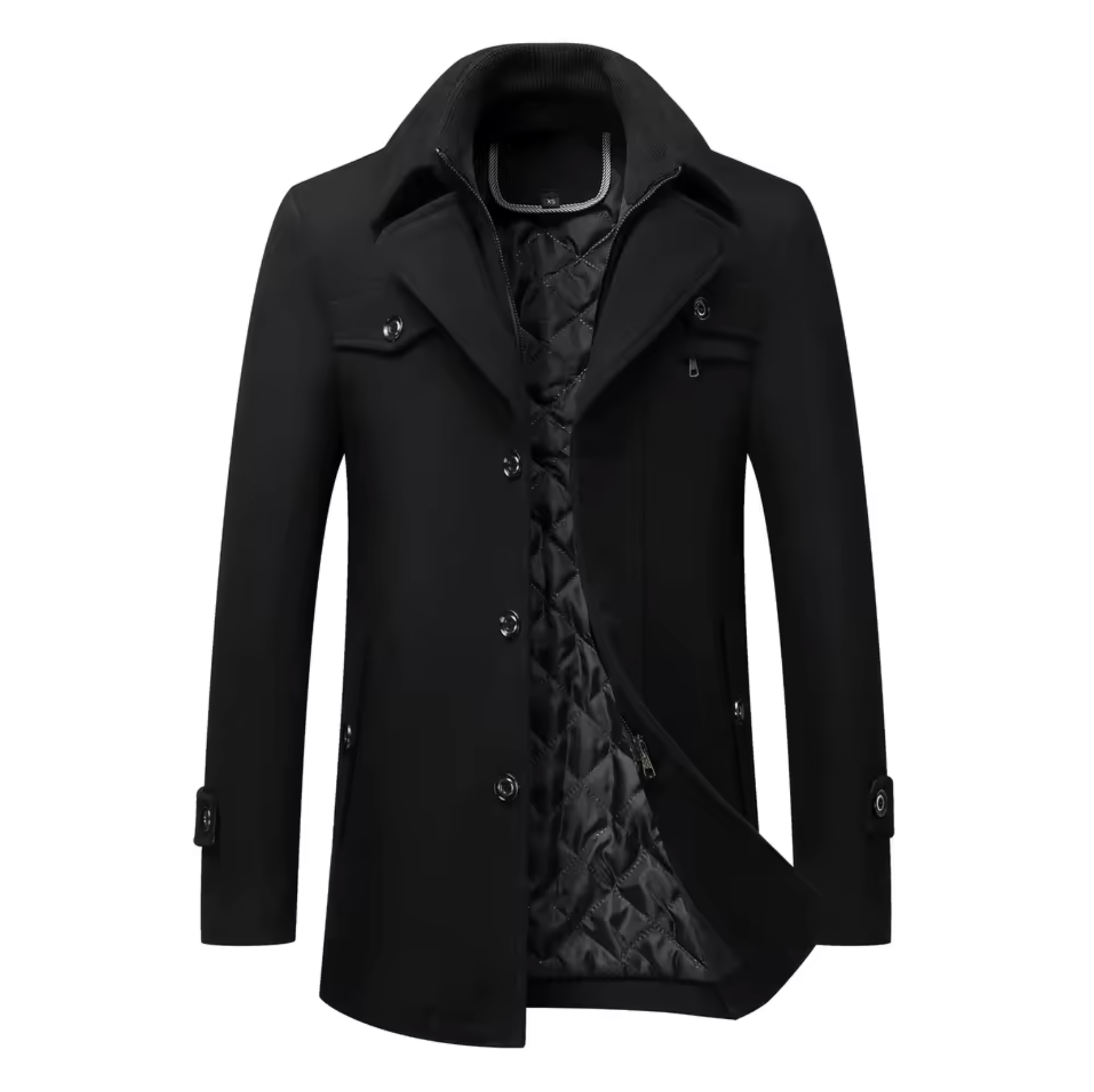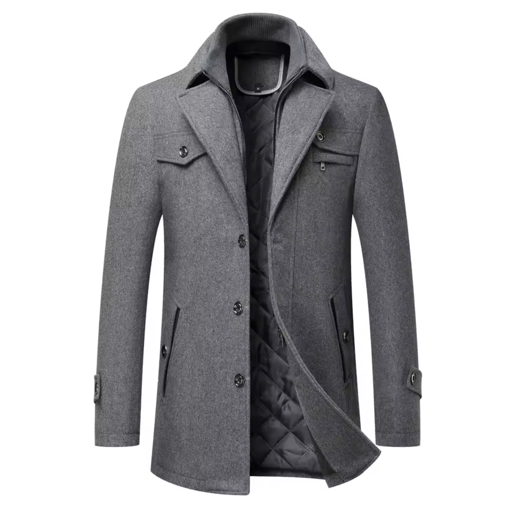 The coat features a detachable high collar for versatile styling, functional buttoned cuffs and side zip pockets for secure storage . The material is moderately water-repellent, making it suitable for light drizzle or damp conditions. Suitable for both formal and casual occasions, this coat seamlessly combines style and functionality.