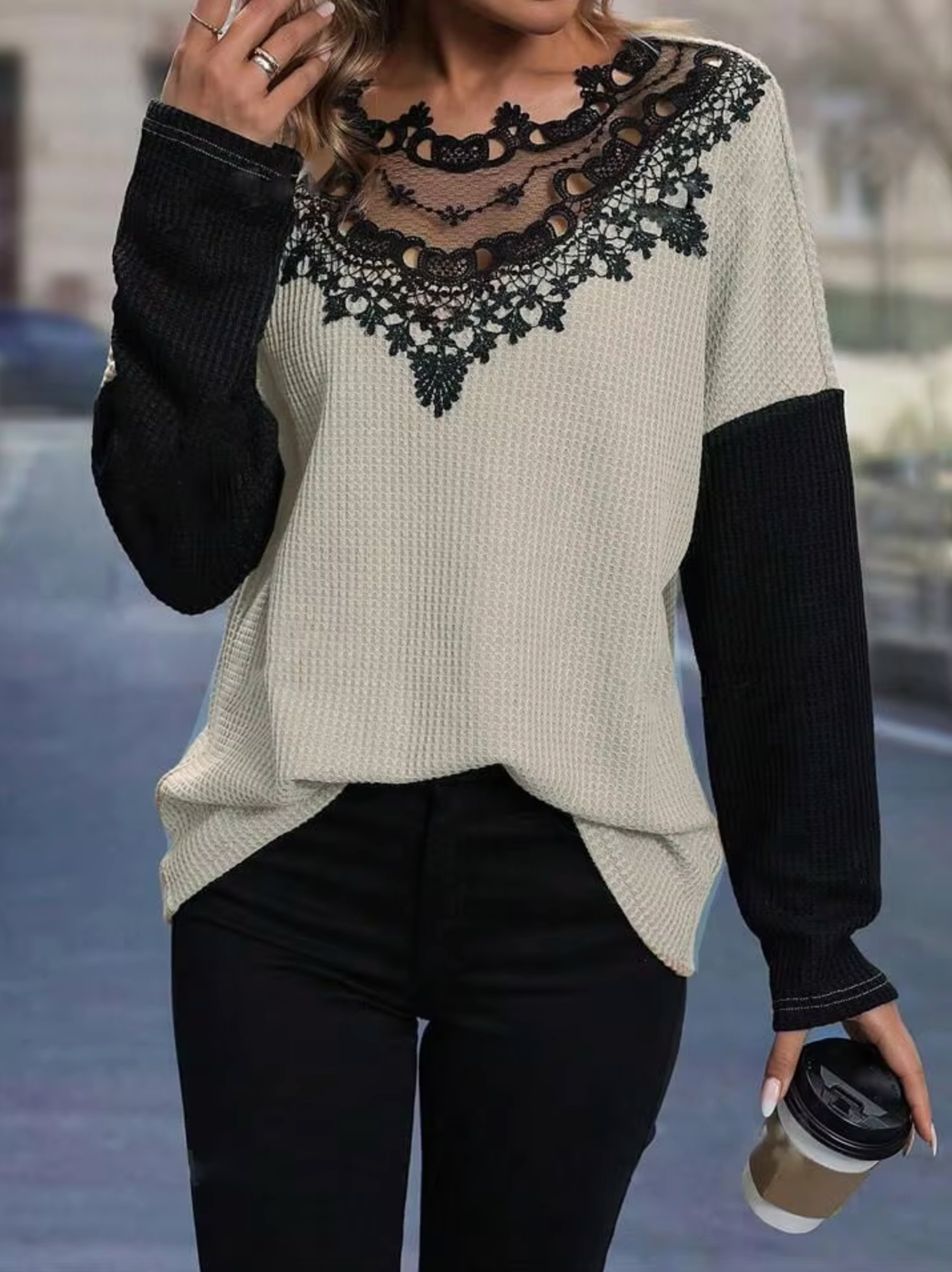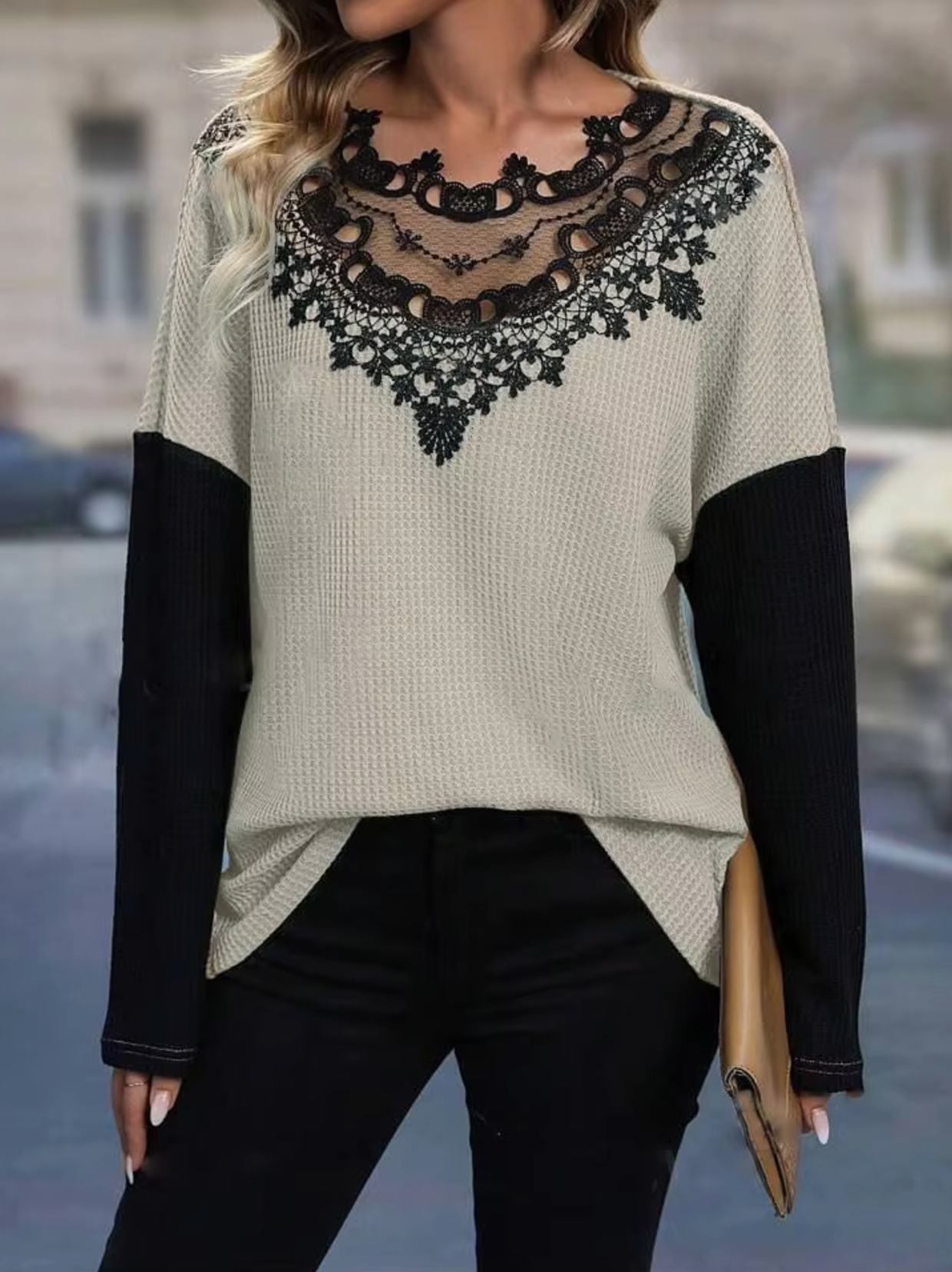 Made from a lightweight and breathable blend , this elegant lace trimmed t-shirt is perfect for spring and fall. The delicate lace accents add a touch of femininity, while the color-block design creates a modern and stylish look .