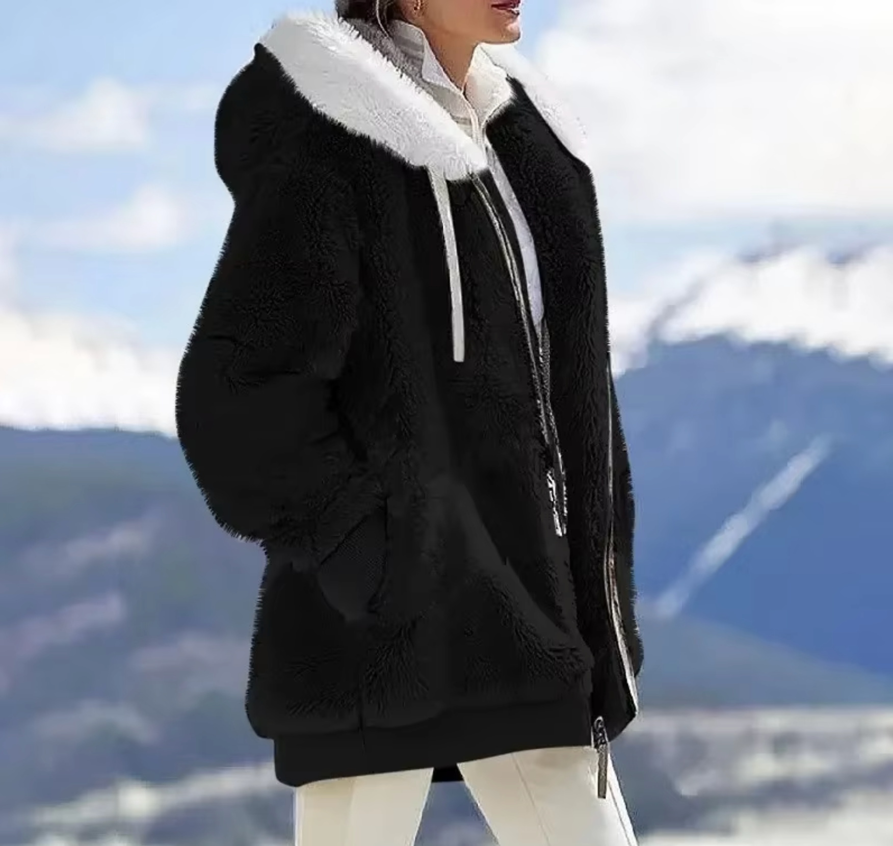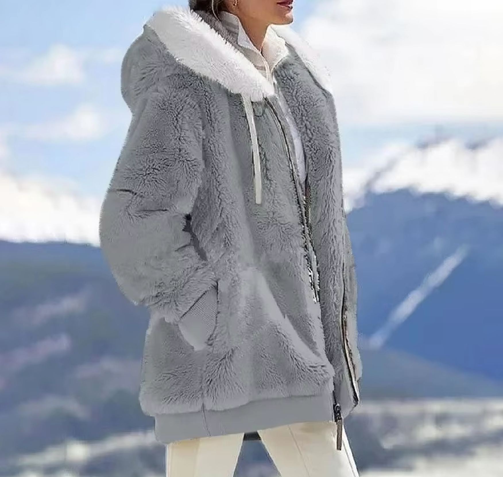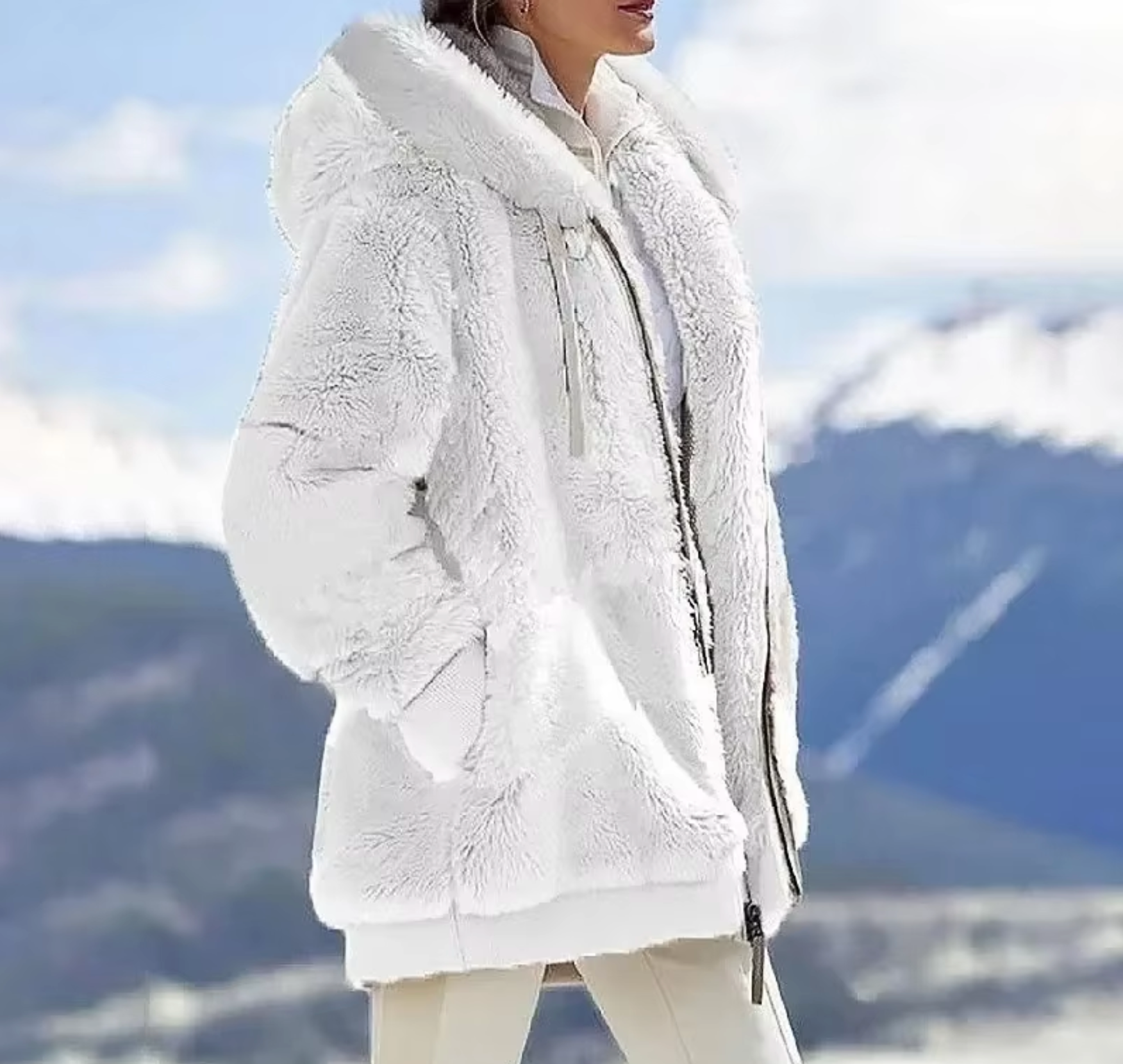 Stay cozy and stylish this winter with this women's hooded fleece coat, made from a blend of soft cashmere and plush fleece . This coat offers a warm, luxurious feel, perfect for colder days. The casual, relaxed fit and easy front zip make it a versatile piece to throw on over any outfit.