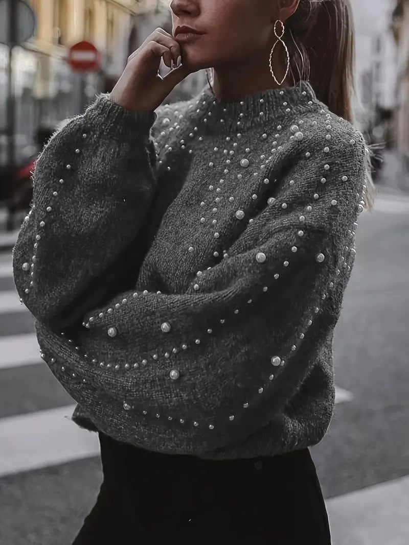 Welcome the cold season in style with this elegant pearl-embellished sweater that will keep you warm while being effortlessly fashionable. Made from soft, high-quality knit fabric with a cozy turtleneck and relaxed fit , this sweater offers comfort and versatility. Its timeless design makes it a perfect staple to layer or wear on its own on cold winter days .