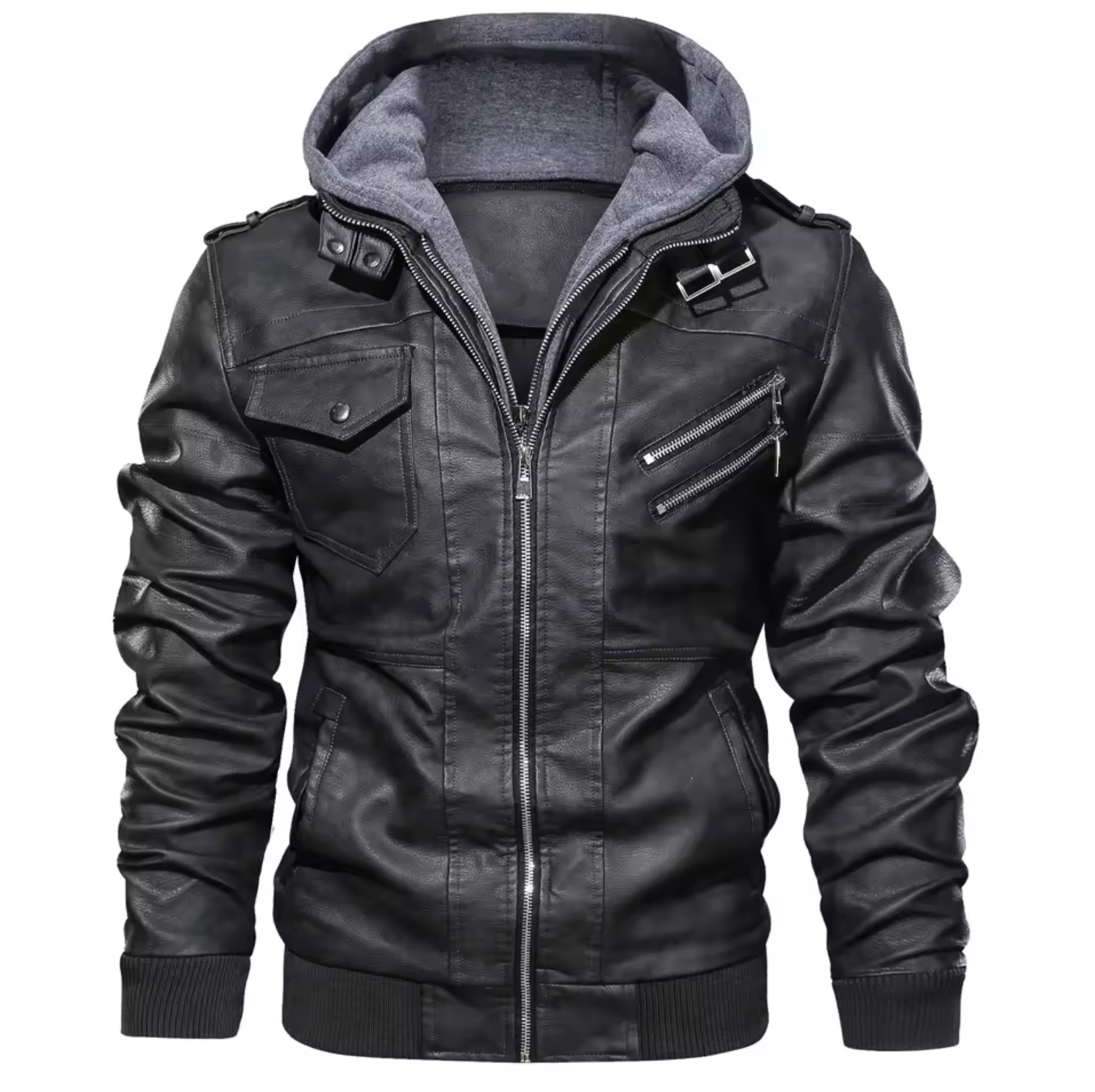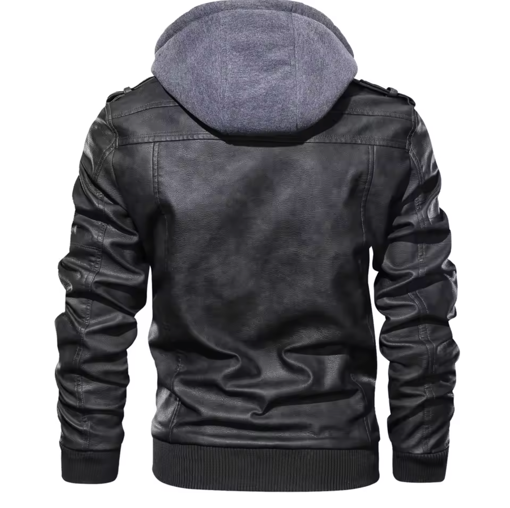 This stylish jacket has a smooth exterior crafted from premium leather for a classic and durable look, paired with a soft hood made from warm cotton fleece. It offers a regular fit to suit a variety of body types and features practical elements such as zipped chest pockets and adjustable shoulder straps for added versatility.