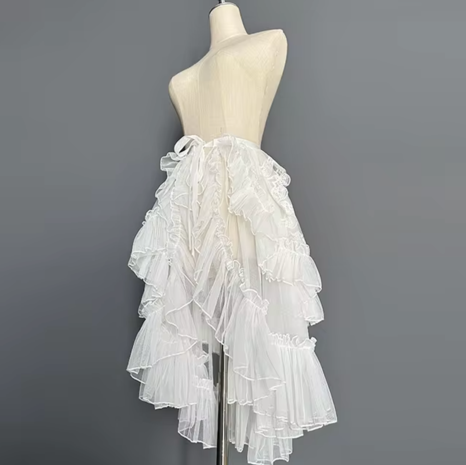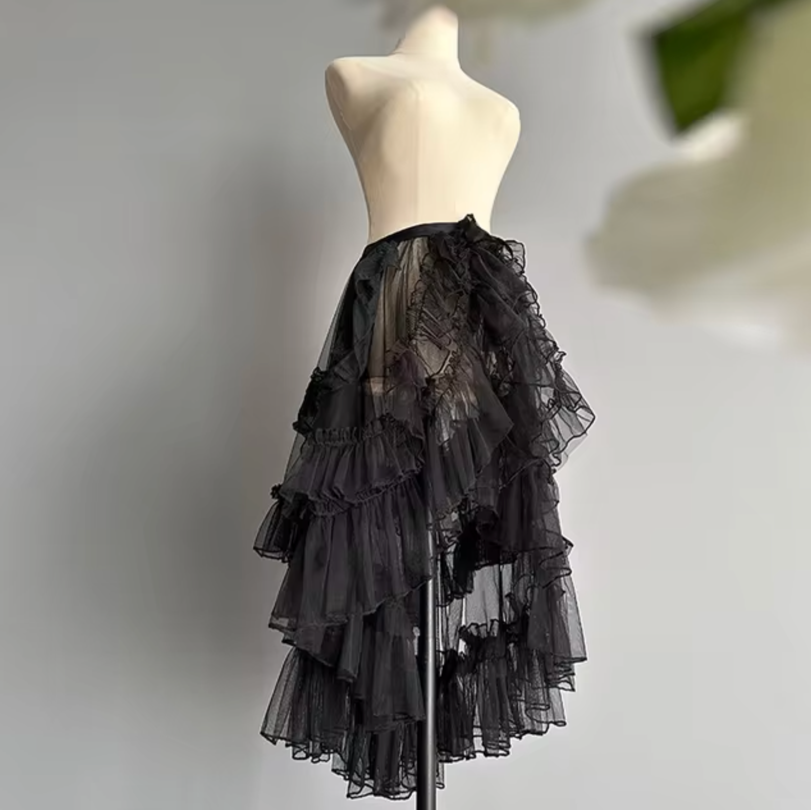 Immerse yourself in a world of whimsy with our Gothic Lace Mesh Ruffle Fairy Princess Party Skirt. Made from delicate lace and sheer mesh , this skirt offers a light and airy feel and is perfect for layering over your favorite outfits. The asymmetrical design and playful ruffle details create a charming silhouette that will enhance your fairytale- inspired look .