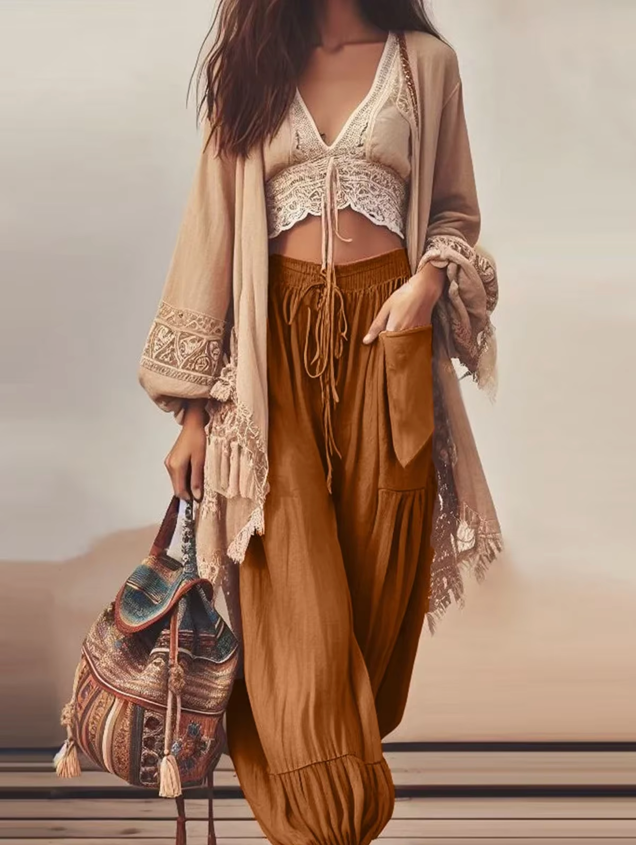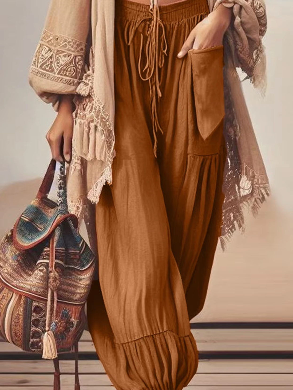 These vintage-style casual pants feature an elastic waistband with drawstring for an adjustable and comfortable fit. The high-waisted, loose design creates a relaxed, flattering silhouette , while the ankle-length cut adds a trendy touch .
