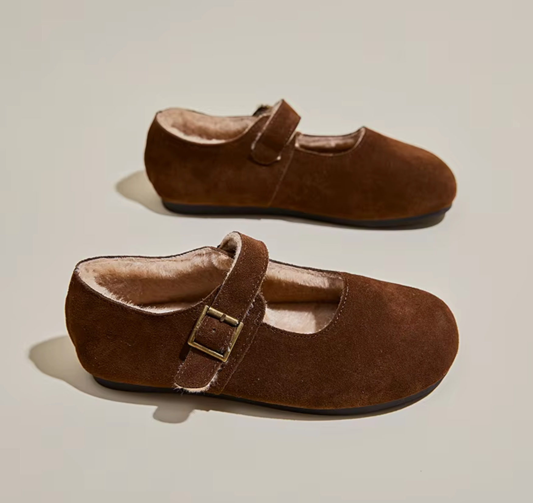 These charming flats are made from soft suede for a classic, elegant look. The interior is lined with plush faux fur for warmth and comfort, making them ideal for cooler seasons. An adjustable strap with a vintage-style metal buckle ensures a secure and customized fit.