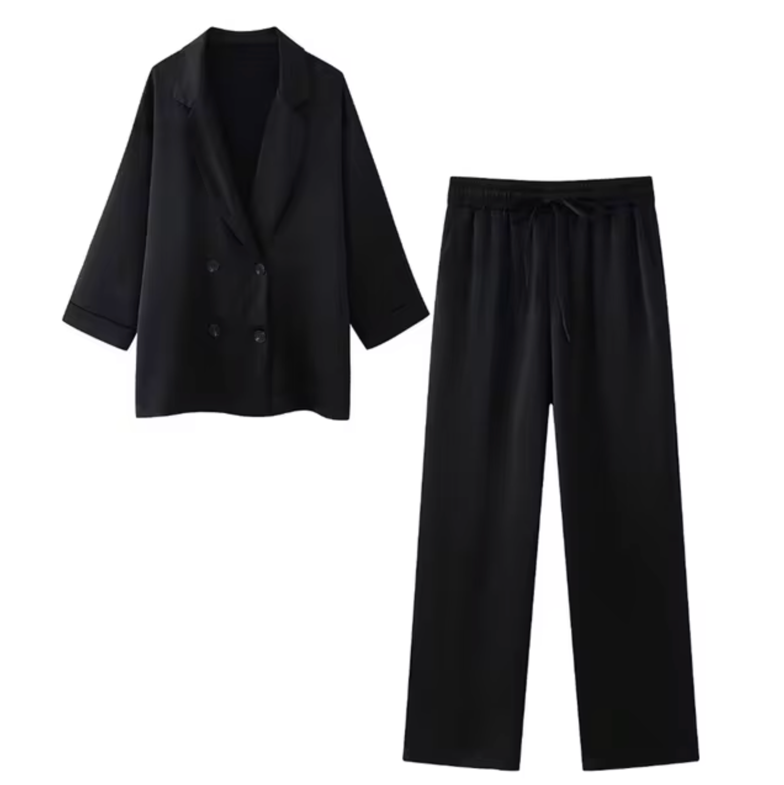 This suit jacket and trouser set is crafted from a premium fabric blend and features an on-trend crinkle effect for a chic, modern look. The double-breasted jacket offers a structured yet relaxed fit, while the matching trousers offer a tailored silhouette with a comfortable feel .