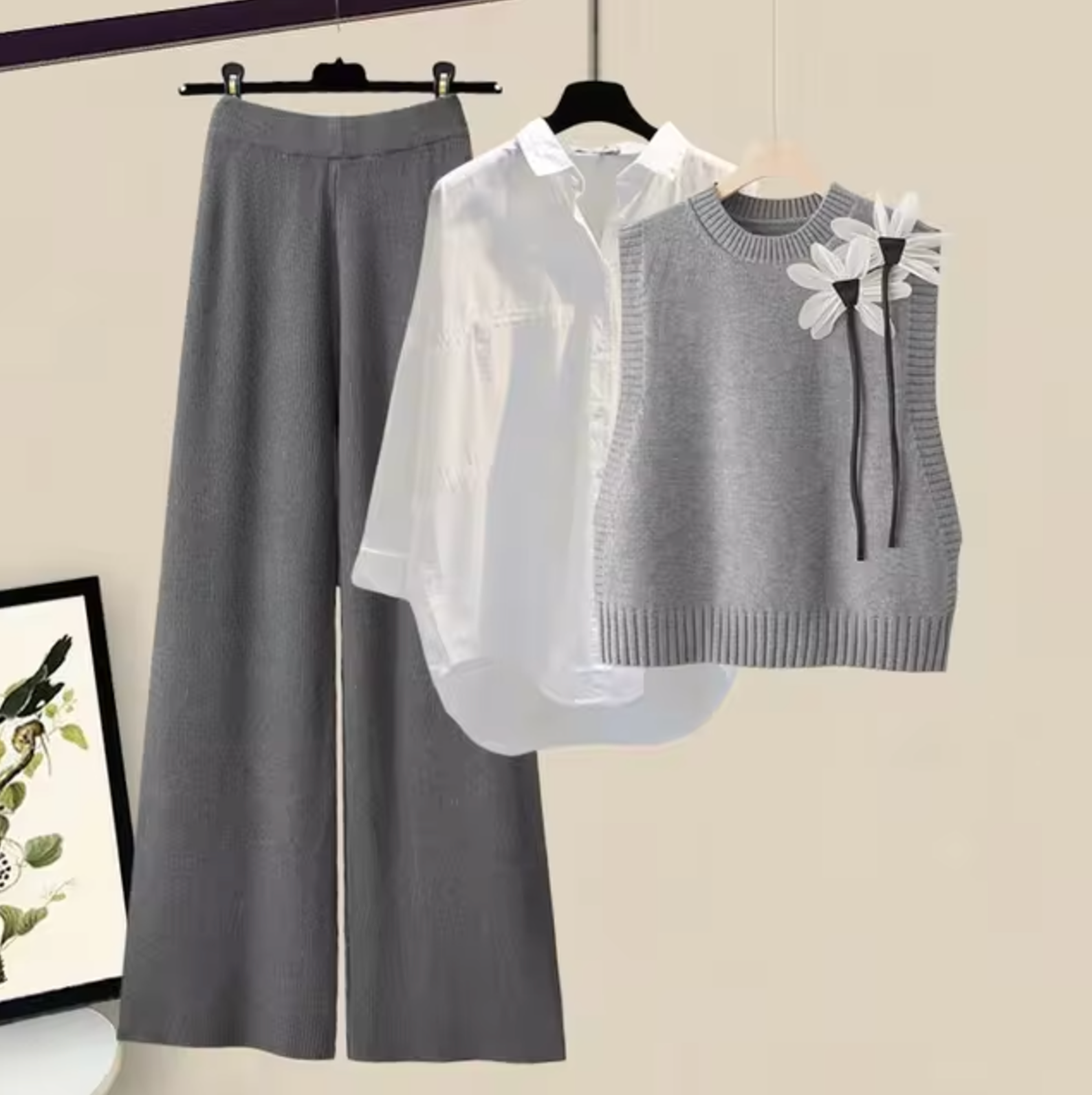 The Knit Pants Set is a versatile 3-piece outfit featuring a soft cardigan, classic white shirt and wide leg pants for coziness and style . Made from warm, breathable fabrics, this set combines comfort with chic , inspired design.