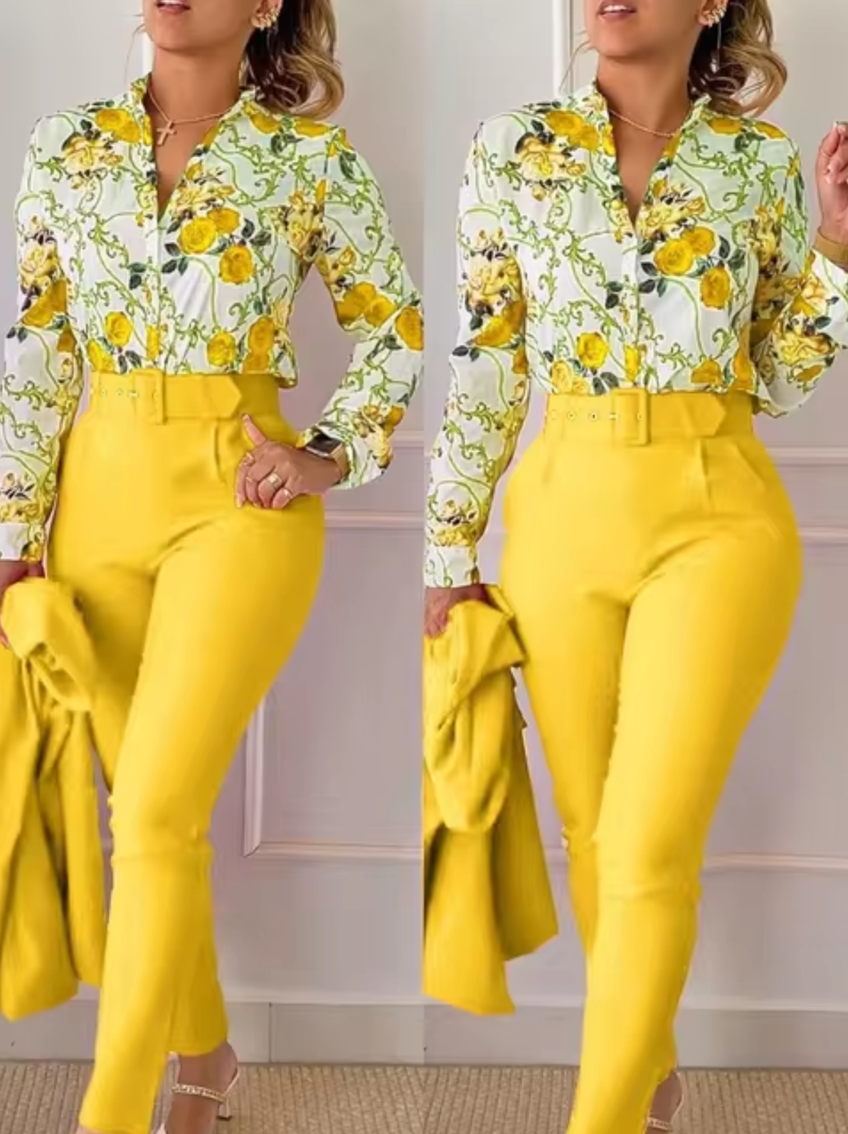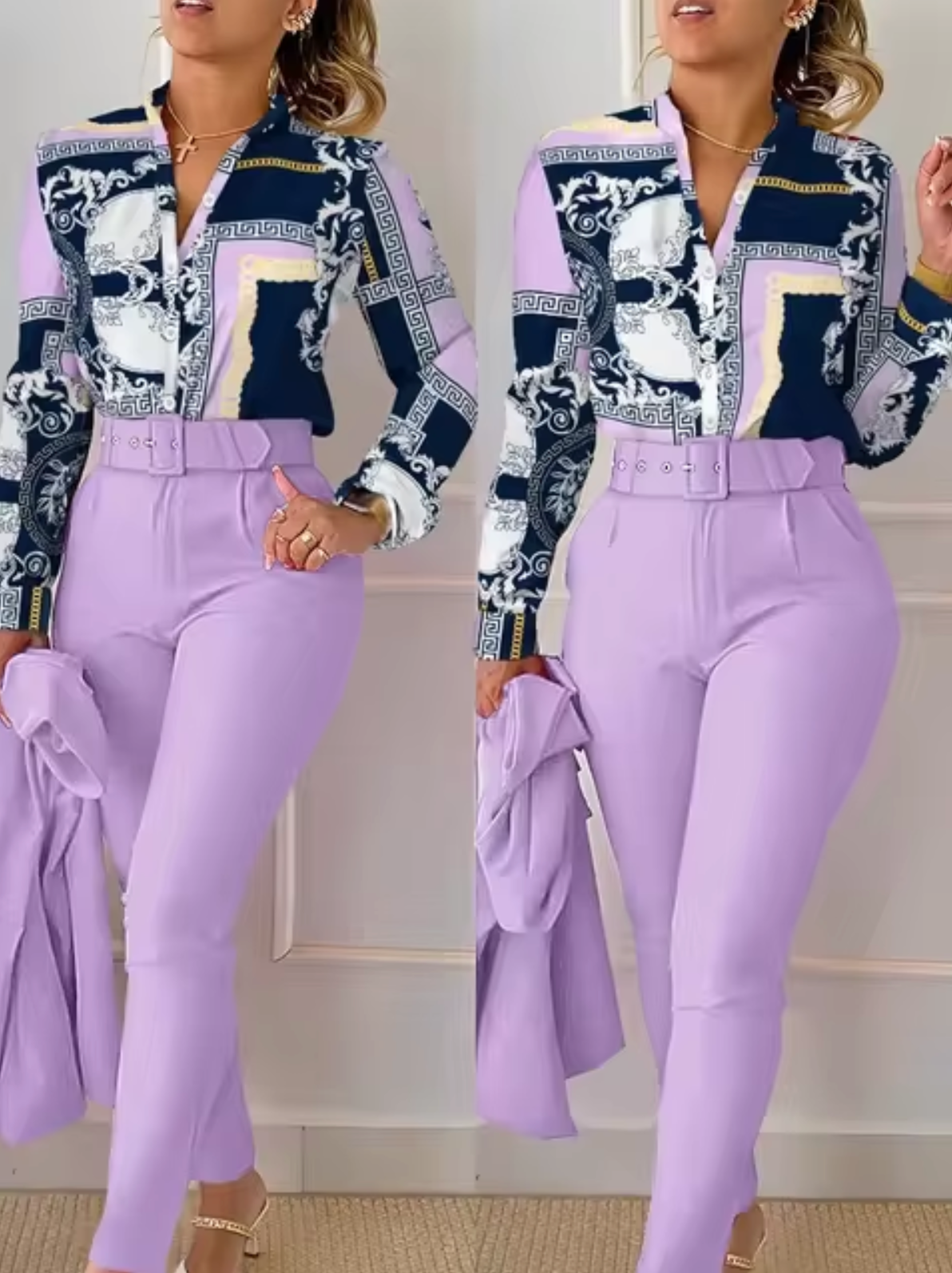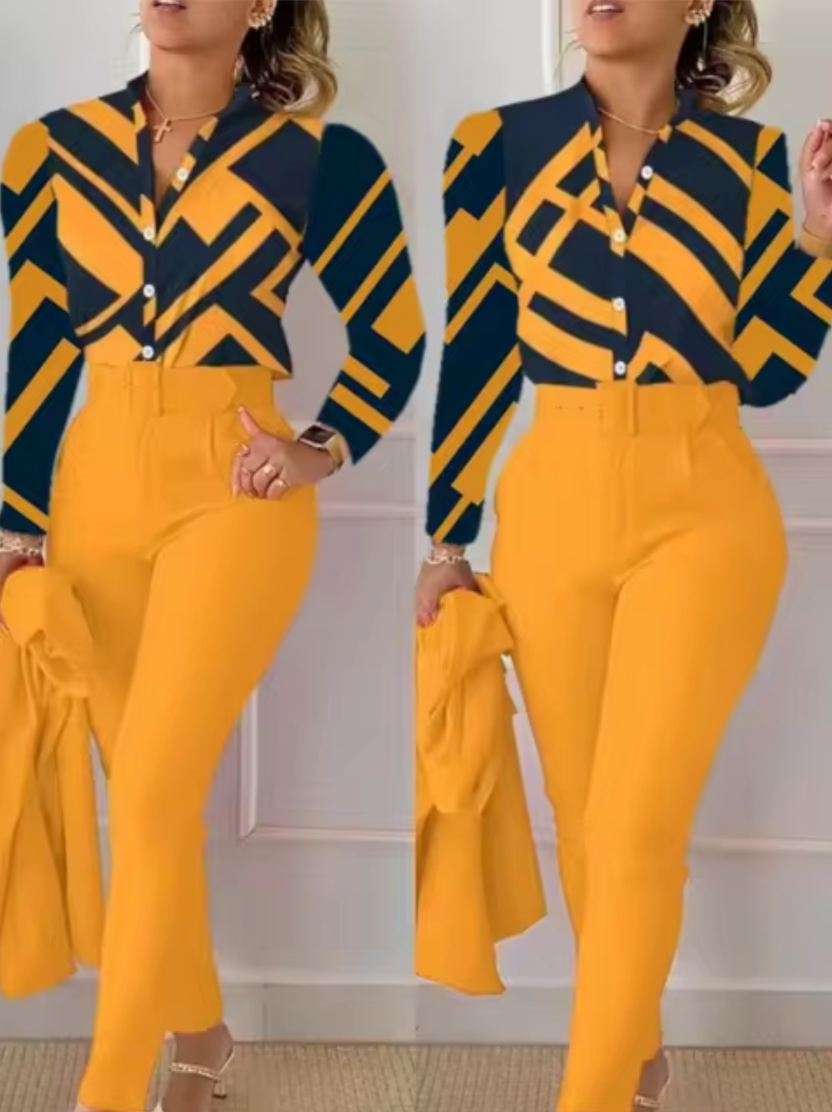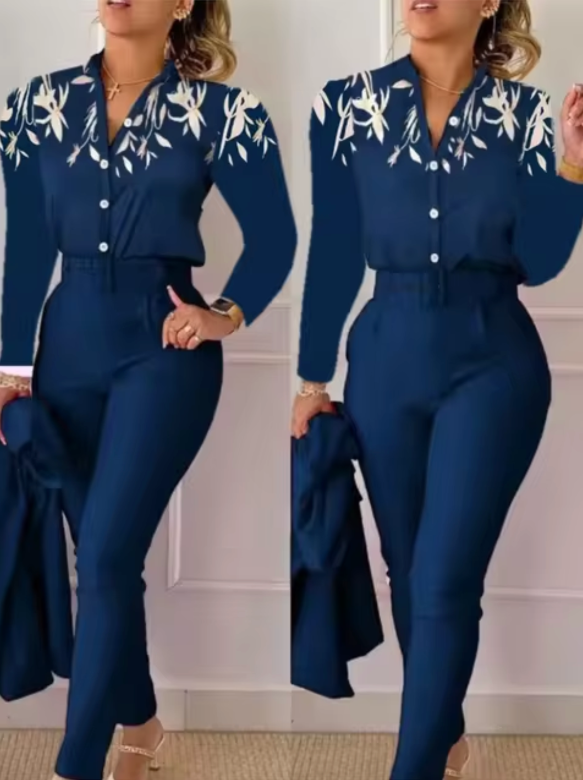 This two-piece suit set for women is made from a soft , breathable and high-quality fabric blend for everyday comfort and durability . The long-sleeved V-neck top features a chic fall-inspired pattern and is paired with high-waisted pants and functional pockets for a stylish and practical look.
