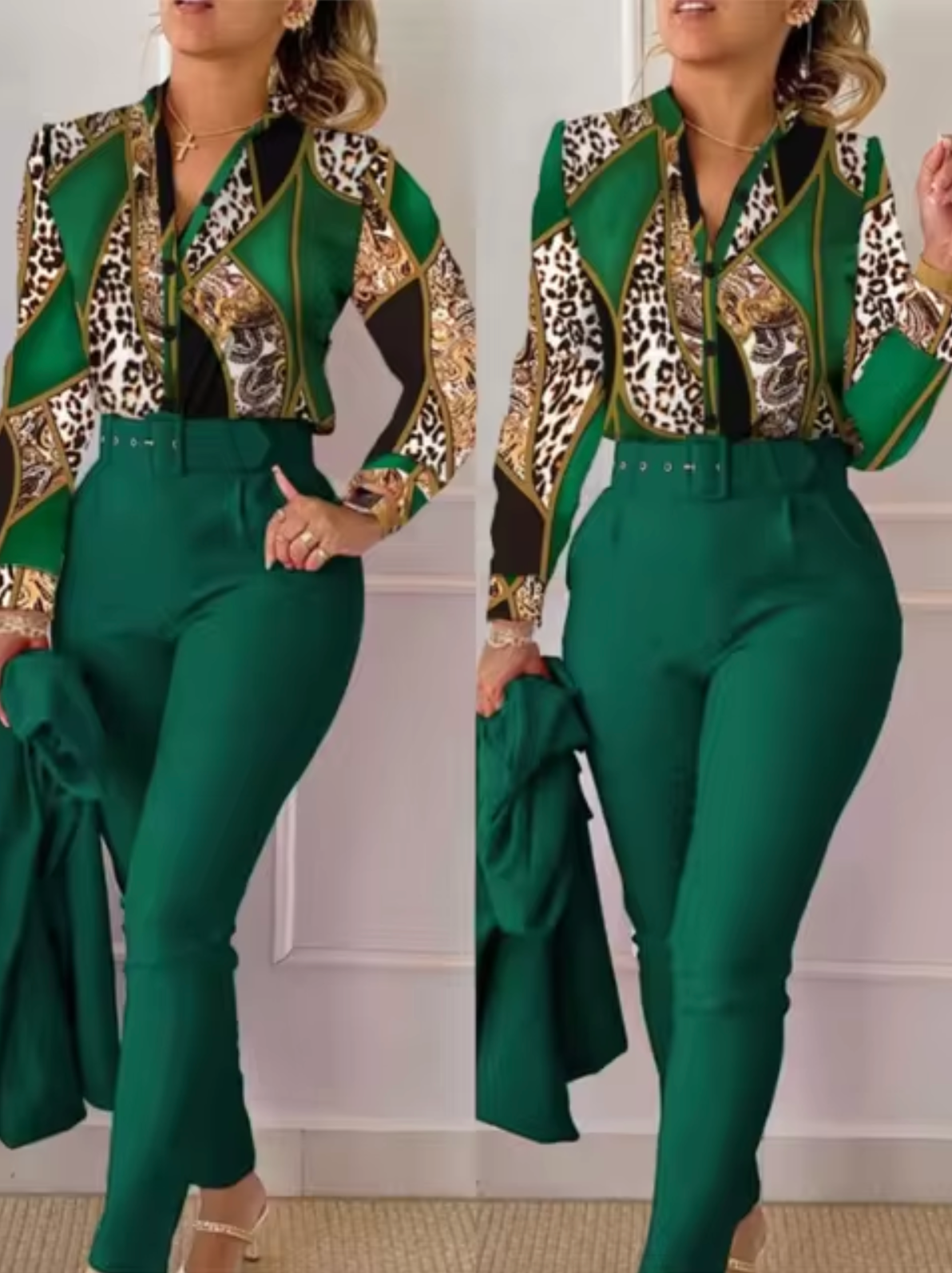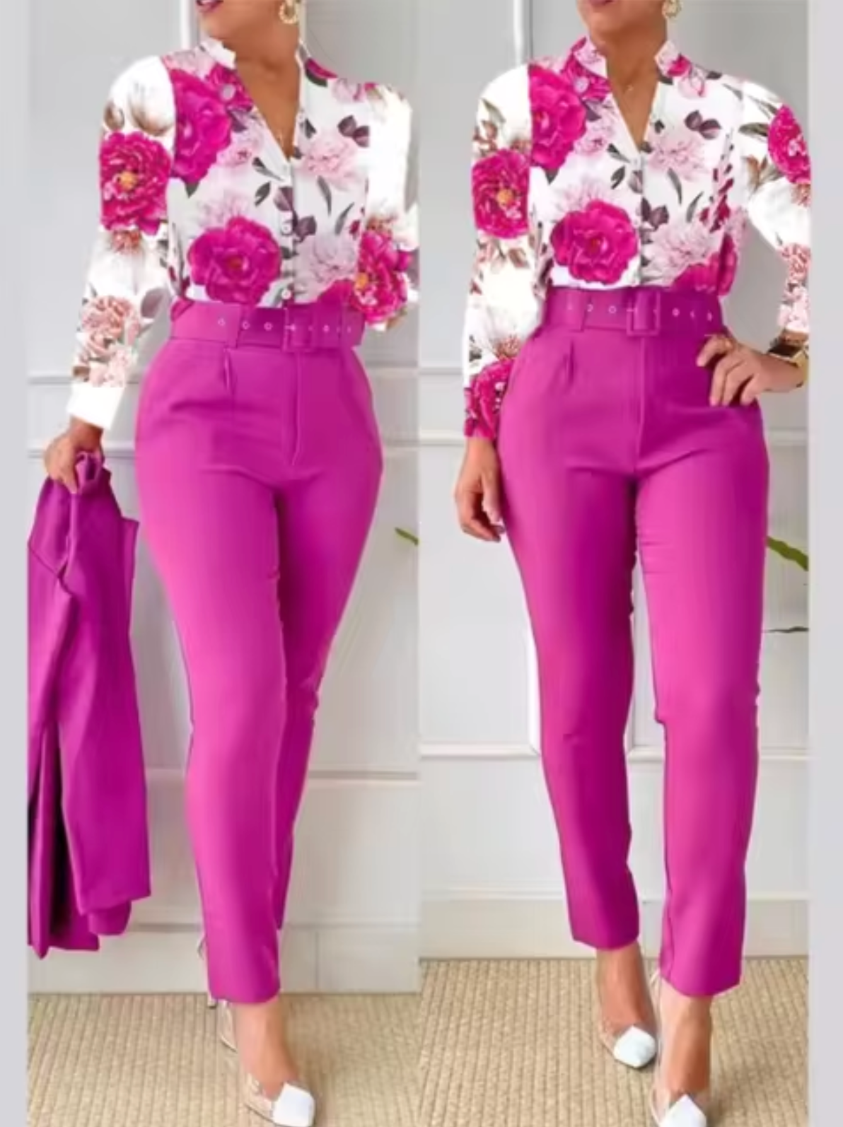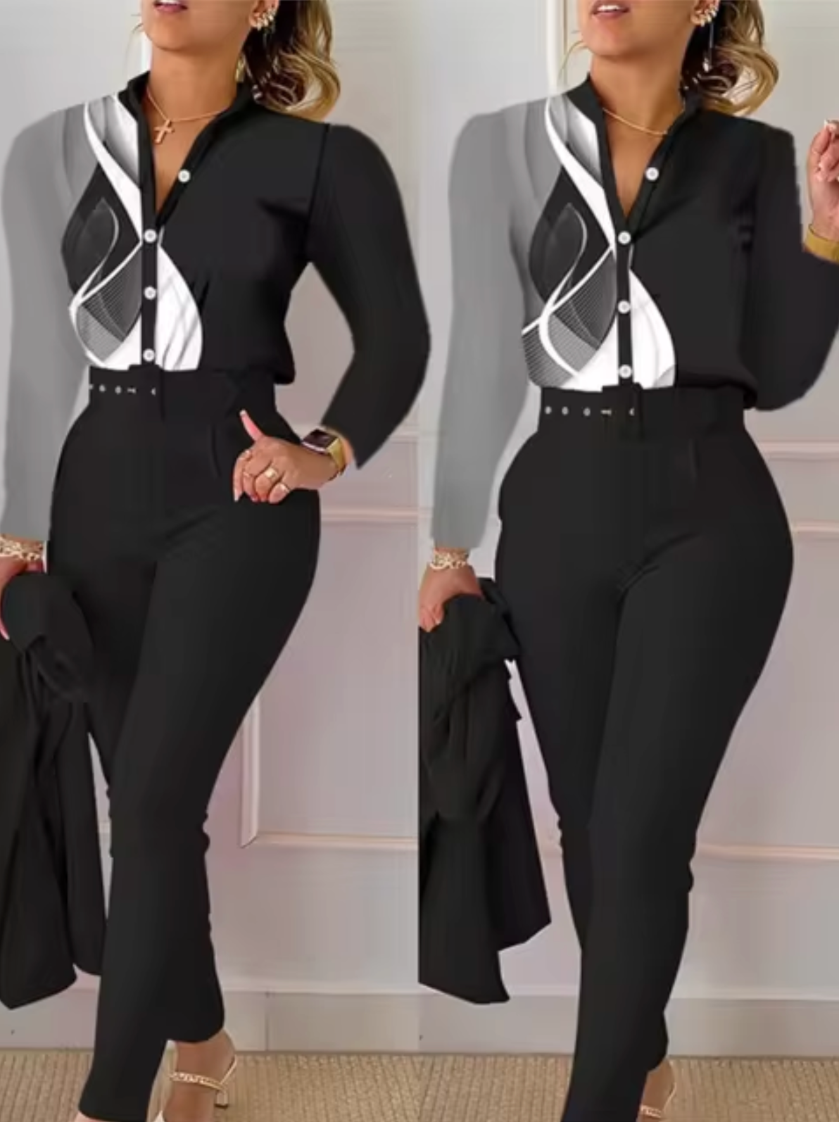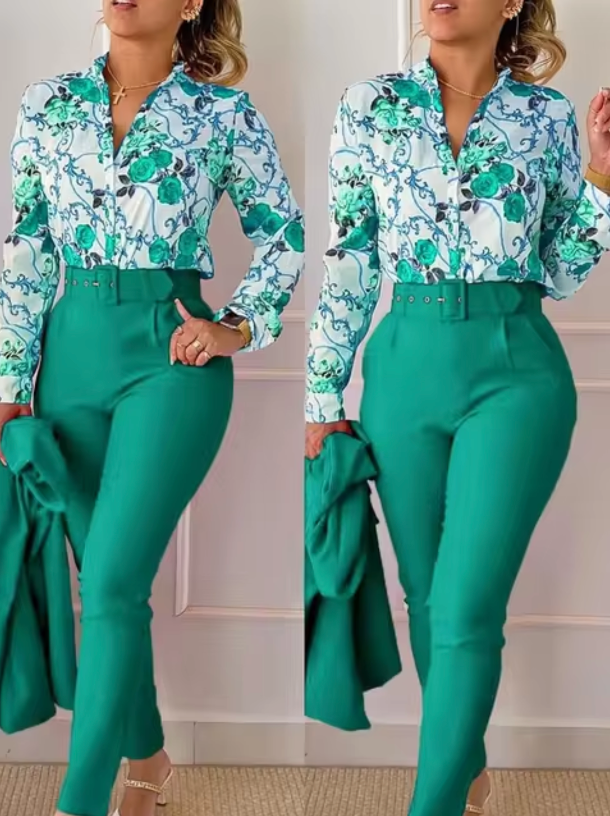 This two-piece suit set for women is made from a soft , breathable and high-quality fabric blend for everyday comfort and durability . The long-sleeved V-neck top features a chic fall-inspired pattern and is paired with high-waisted pants and functional pockets for a stylish and practical look.