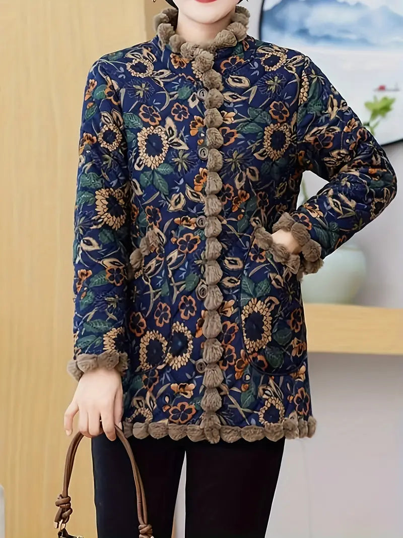 Wrap yourself in cozy elegance with this beautifully crafted floral print jacket. The quilted design and plush faux fur trim add extra warmth and style . The jacket is made from a durable, breathable blend of materials and lined with soft, teddy-like fleece to keep you warm on chilly days.