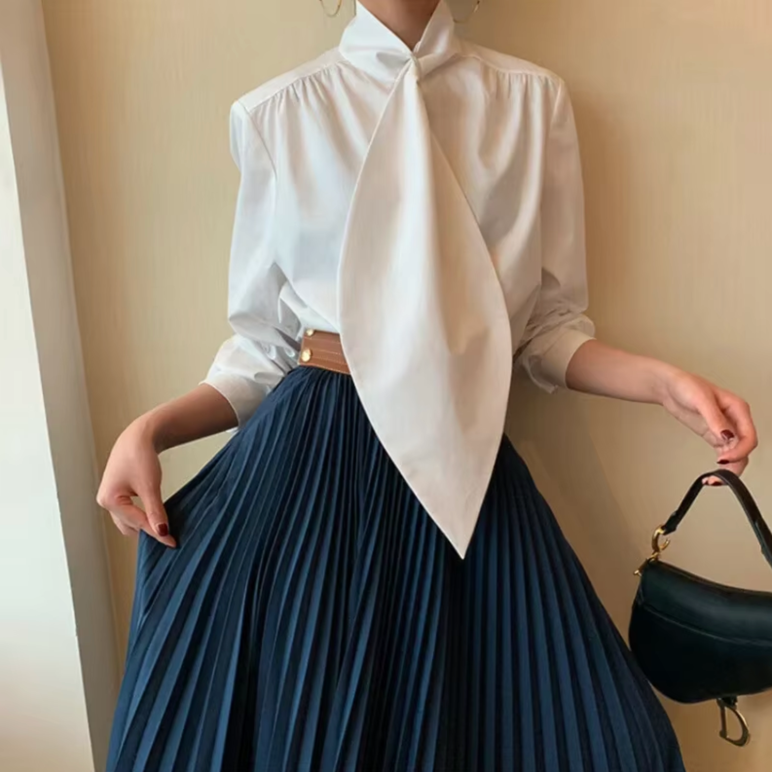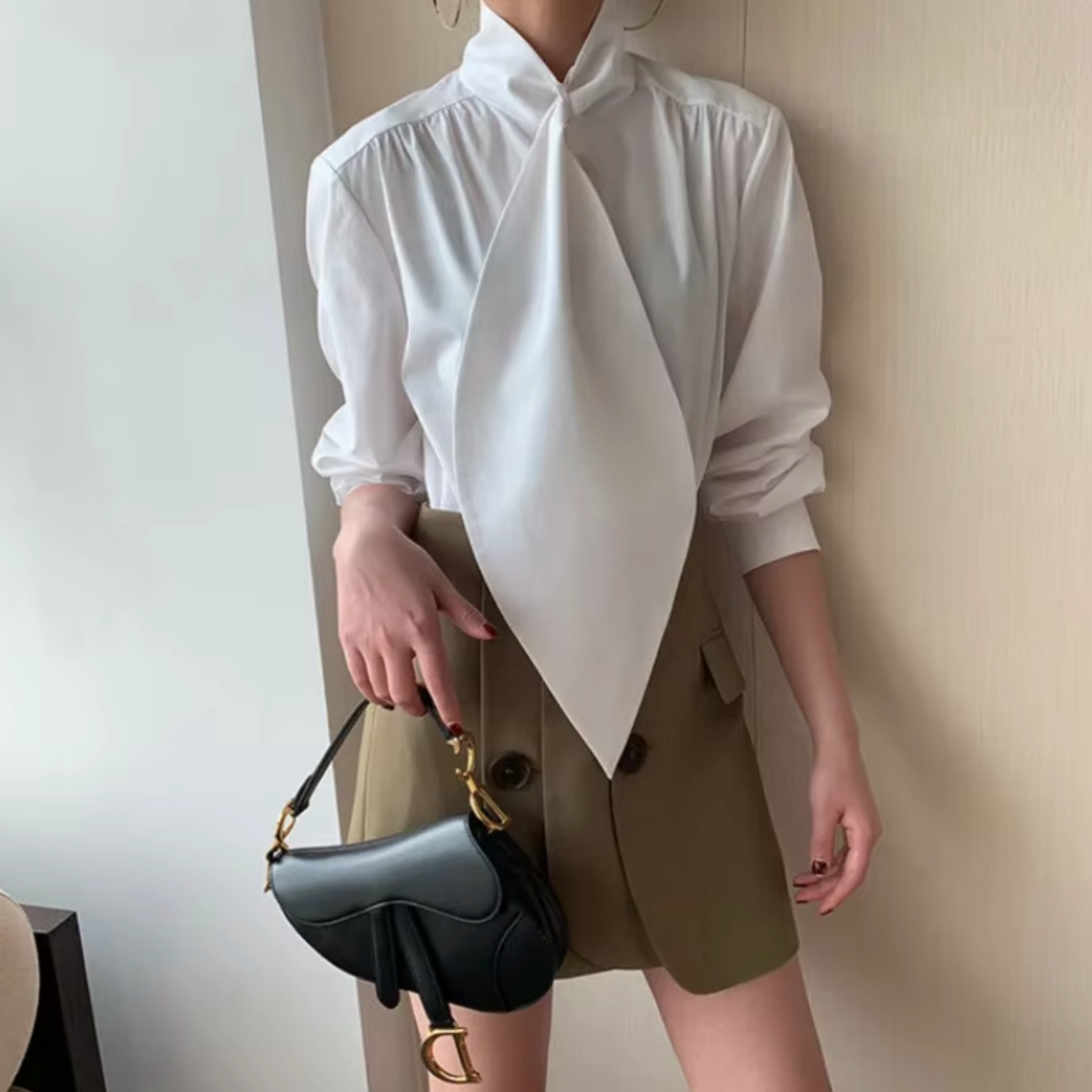 This chic white blouse features a structured, oversized tie that adds a modern twist to a classic design . Crafted from crisp, premium cotton, the fabric offers a soft yet tailored fit with light gathers at the shoulders for volume.