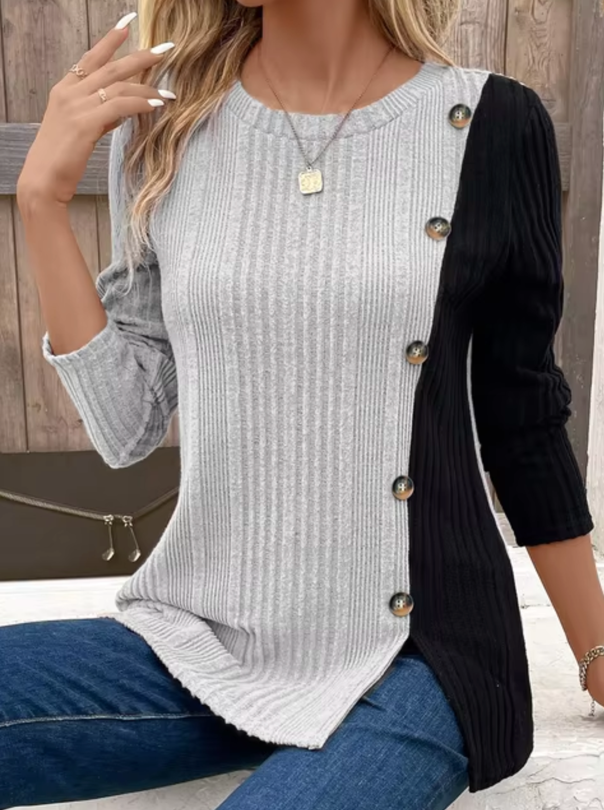 Made from soft rib knit, this colorblock sweatshirt offers a comfortable and breathable feel for spring and fall. The casual long sleeve design with button detailing offers a flattering slim fit that hugs the body in all the right places.