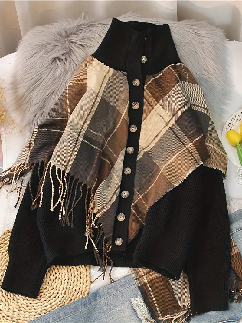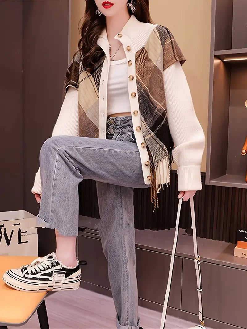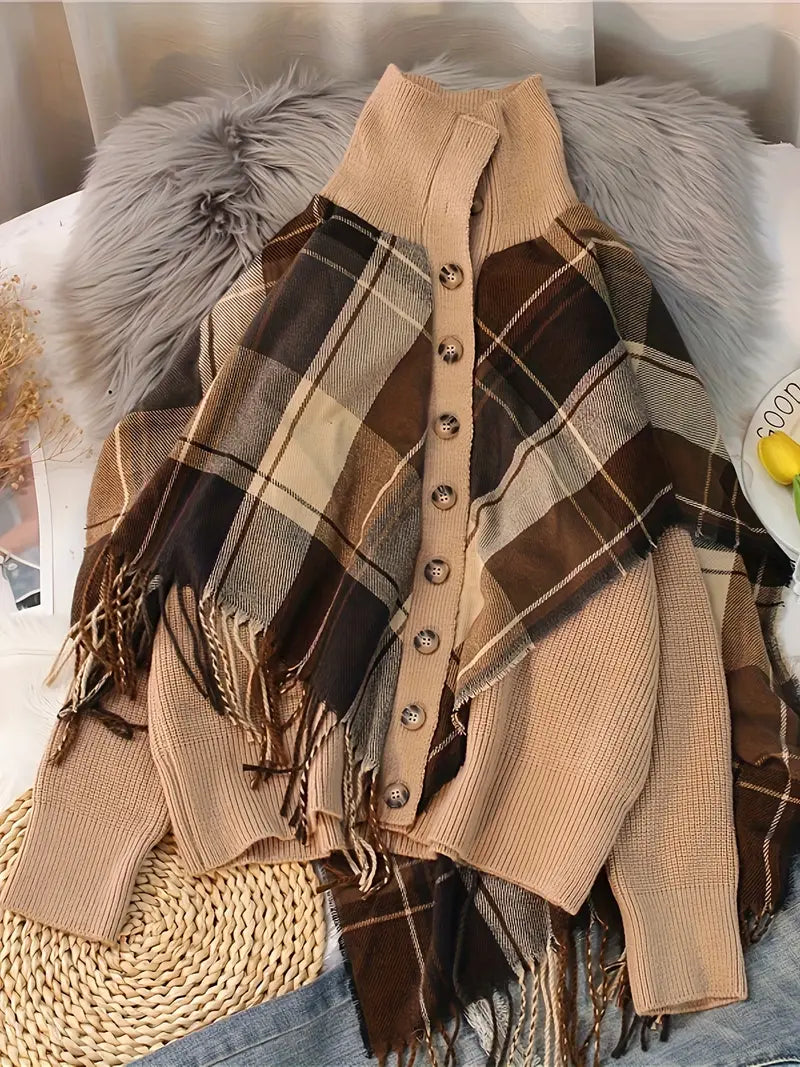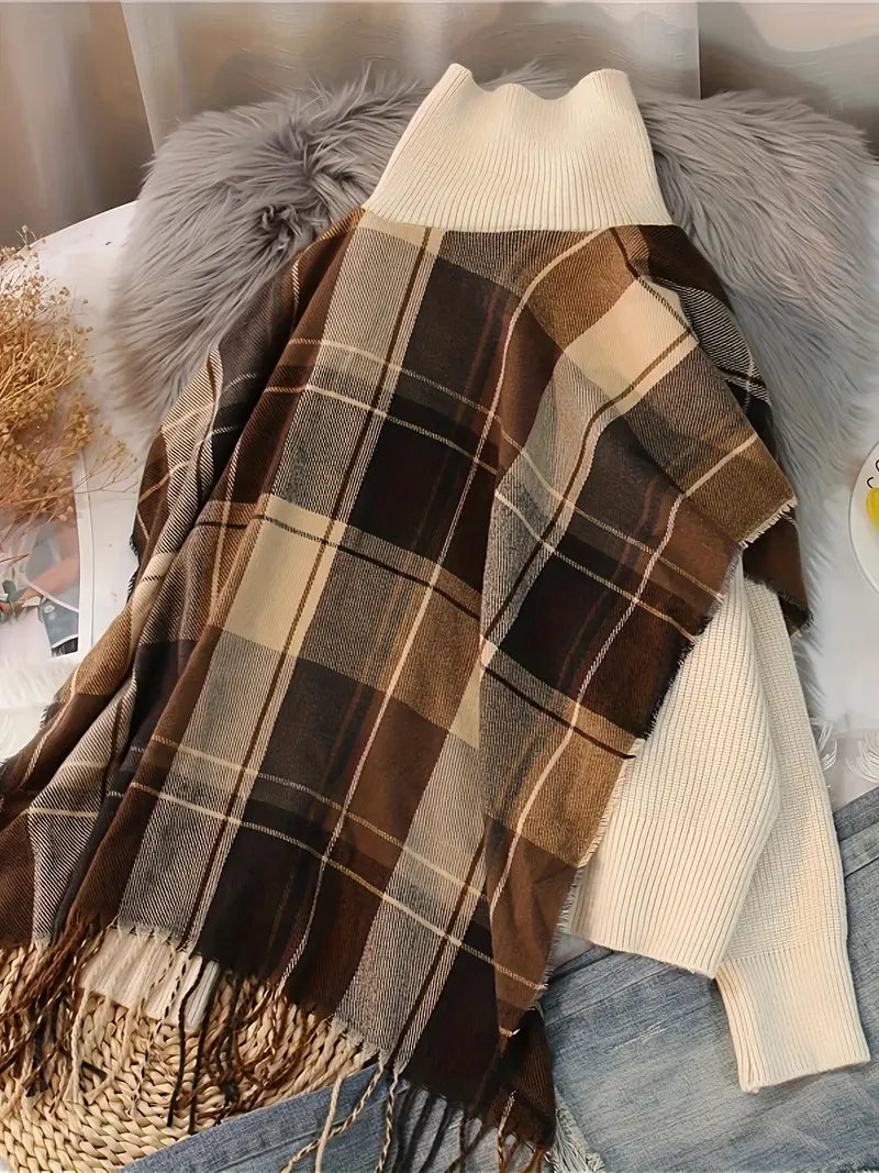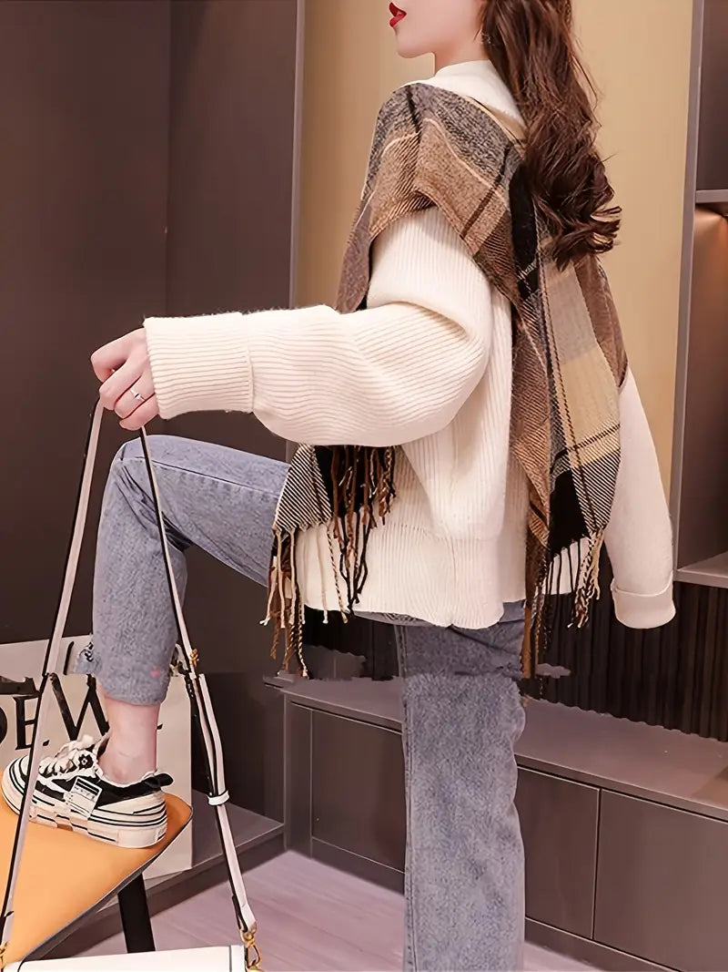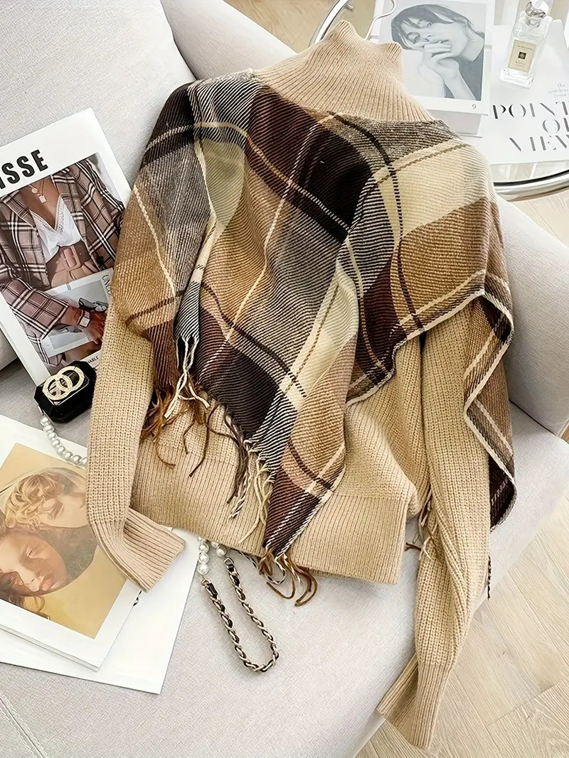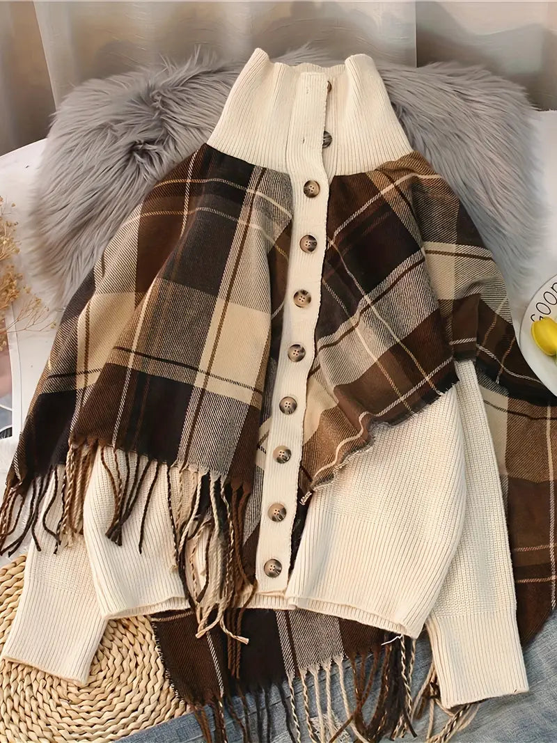 This cozy and stylish piece features a soft knit sweater made from premium material for a comfortable fit, paired with a plaid scarf for added warmth and sophistication.